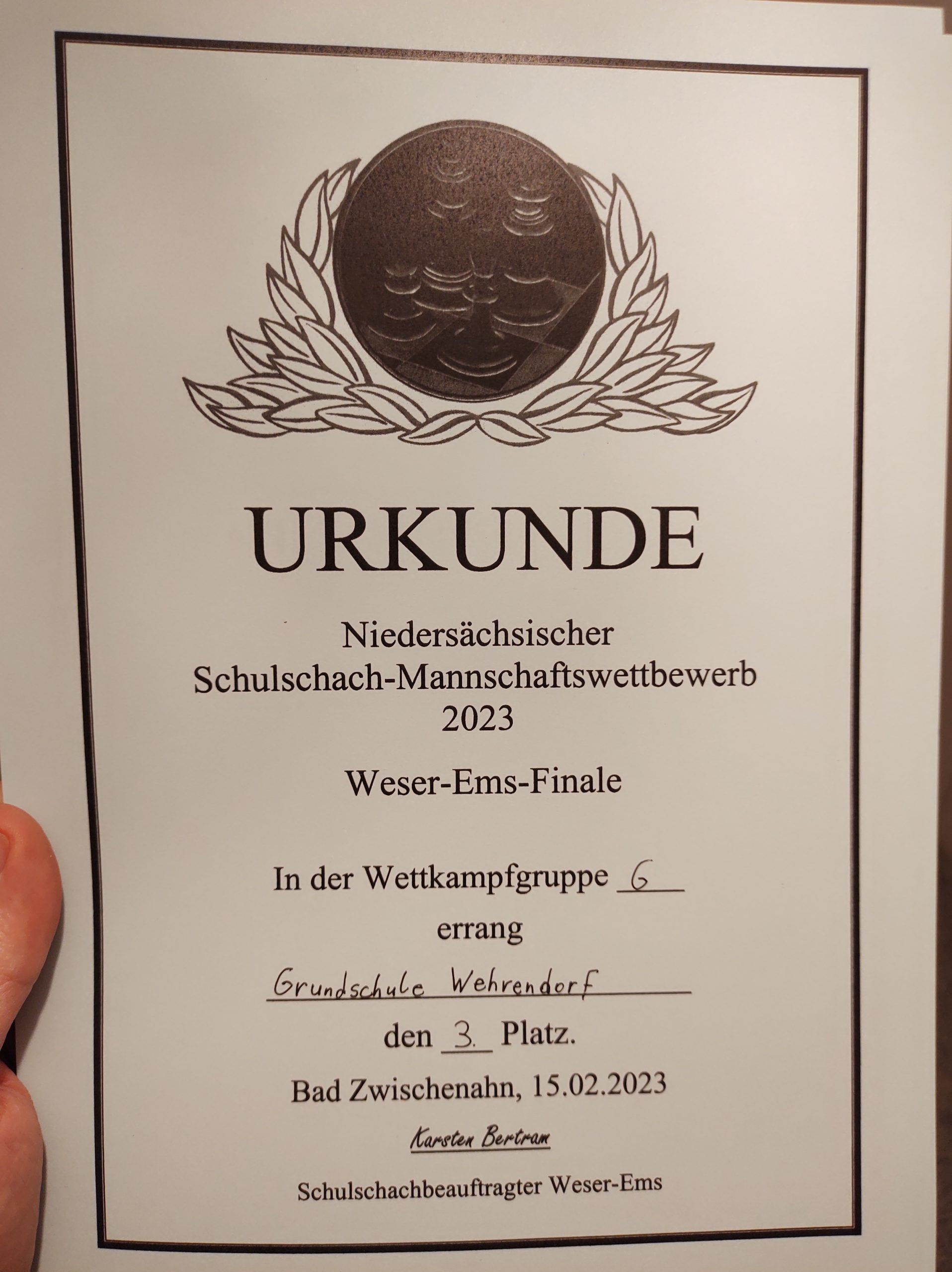 In der letzten Runde wartete Team 2 der Finkenburgschule Aurich. Hier konnten sich die Wehrendorfer Schüler gegen die Ostfriesen revanchieren und diese mit 3:1 besiegen. Da Hagen die letzte Runde mit 2,5:1,5 gegen die GS Grüner Kamp aus Delmenhorst knapp gewinnen konnte, stand die Endplatzierung fest. Aurich 1 holte mit 13:1 Mannschaftspunkten verdient die Bezirksmeisterschaft. Platz 2 und 3 belegten punktgleich mit 11:3 die Teams aus Hagen und Wehrendorf. Da die GSW jedoch 1,5 Brettpunkte weniger hatte (vergleichbar mit dem Torverhältnis beim Fußball), wartete an diesem Tag nach 5 Siegen, 1 Remis und 1 Niederlage die Bronzemedaille auf das Team aus dem Altkreis Wittlage und die Qualifikation für die Landesmeisterschaft in Hannover wurde hauchdünn verpasst. Doch auch auf Platz 3 konnten die Kinder zu Recht sehr stolz sein und ließen sich für ihre ausgezeichnete Mannschaftsleistung gebührend feiern. So ging ein schöner Tag mit guter Laune zu Ende!