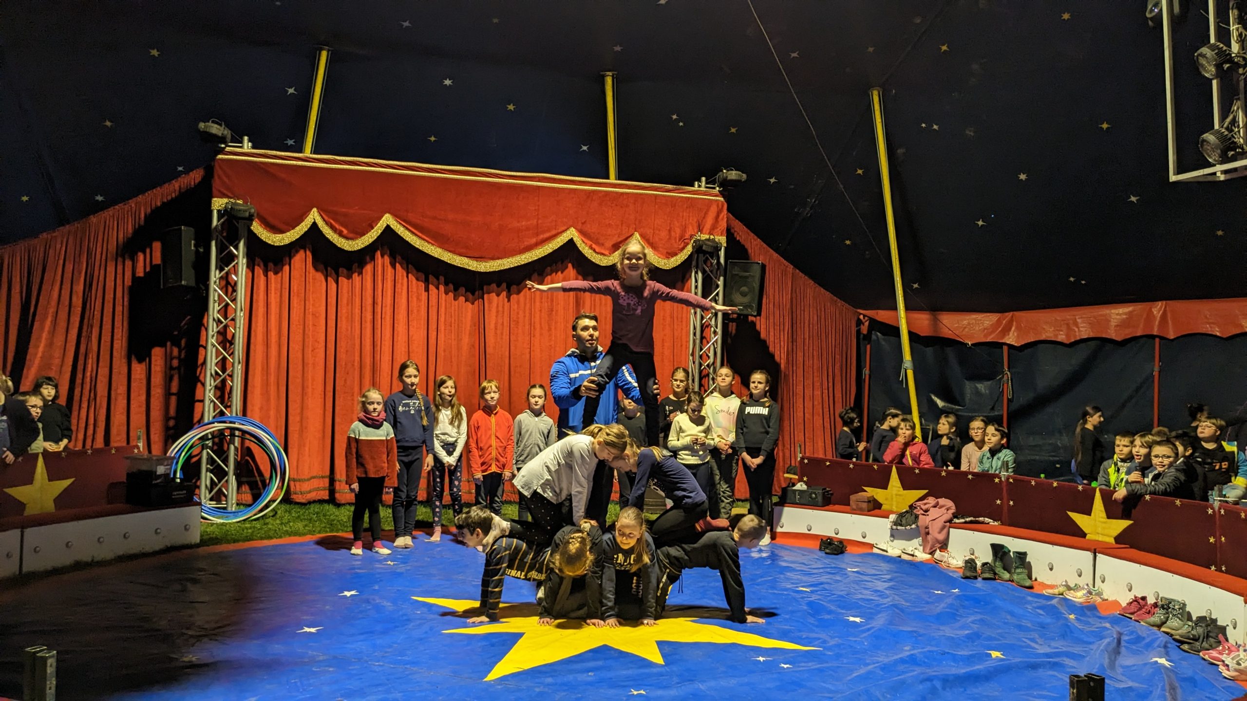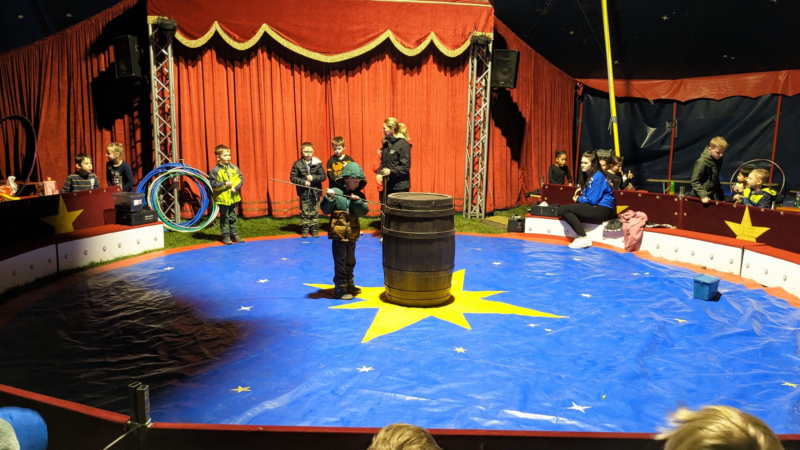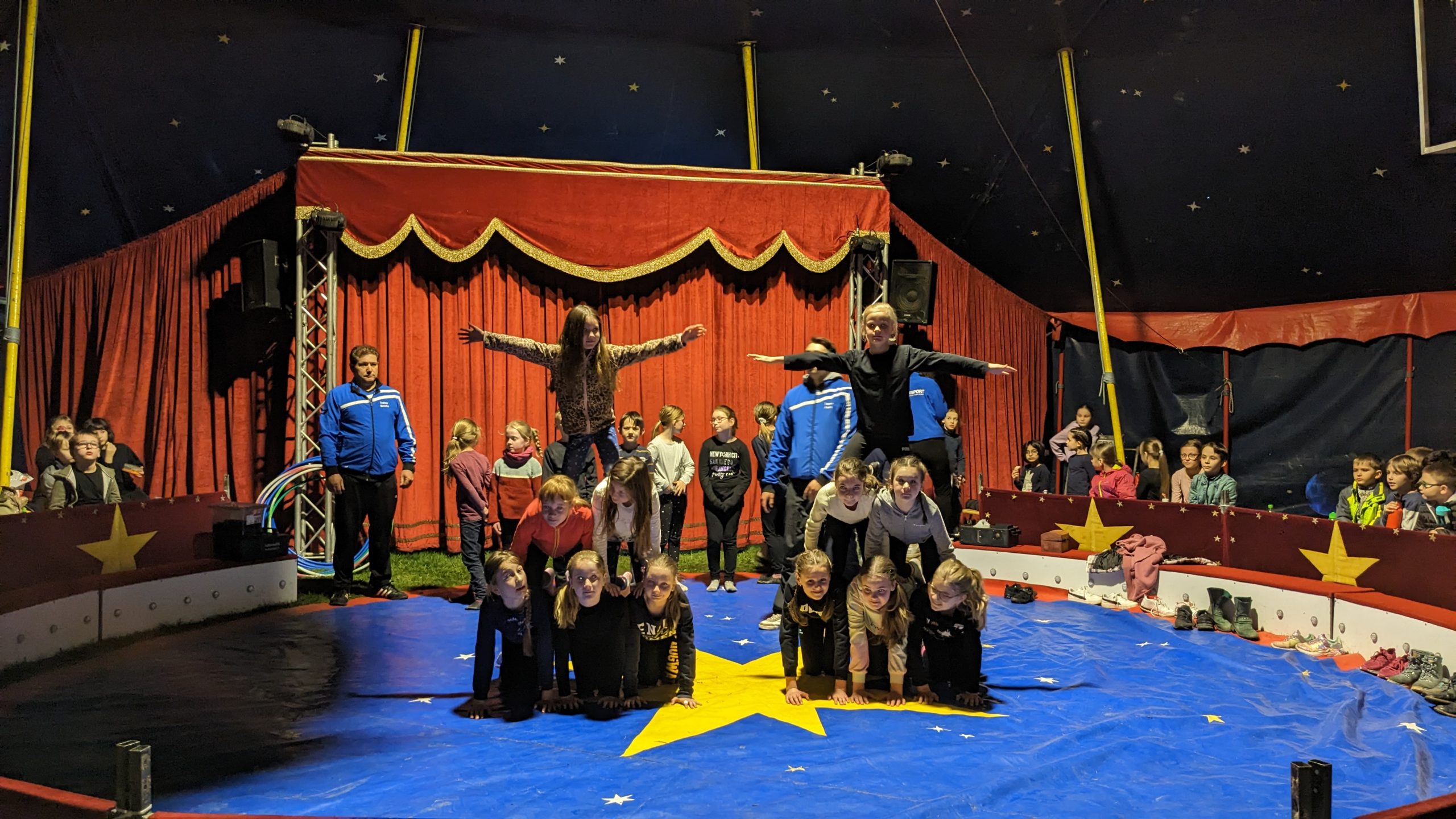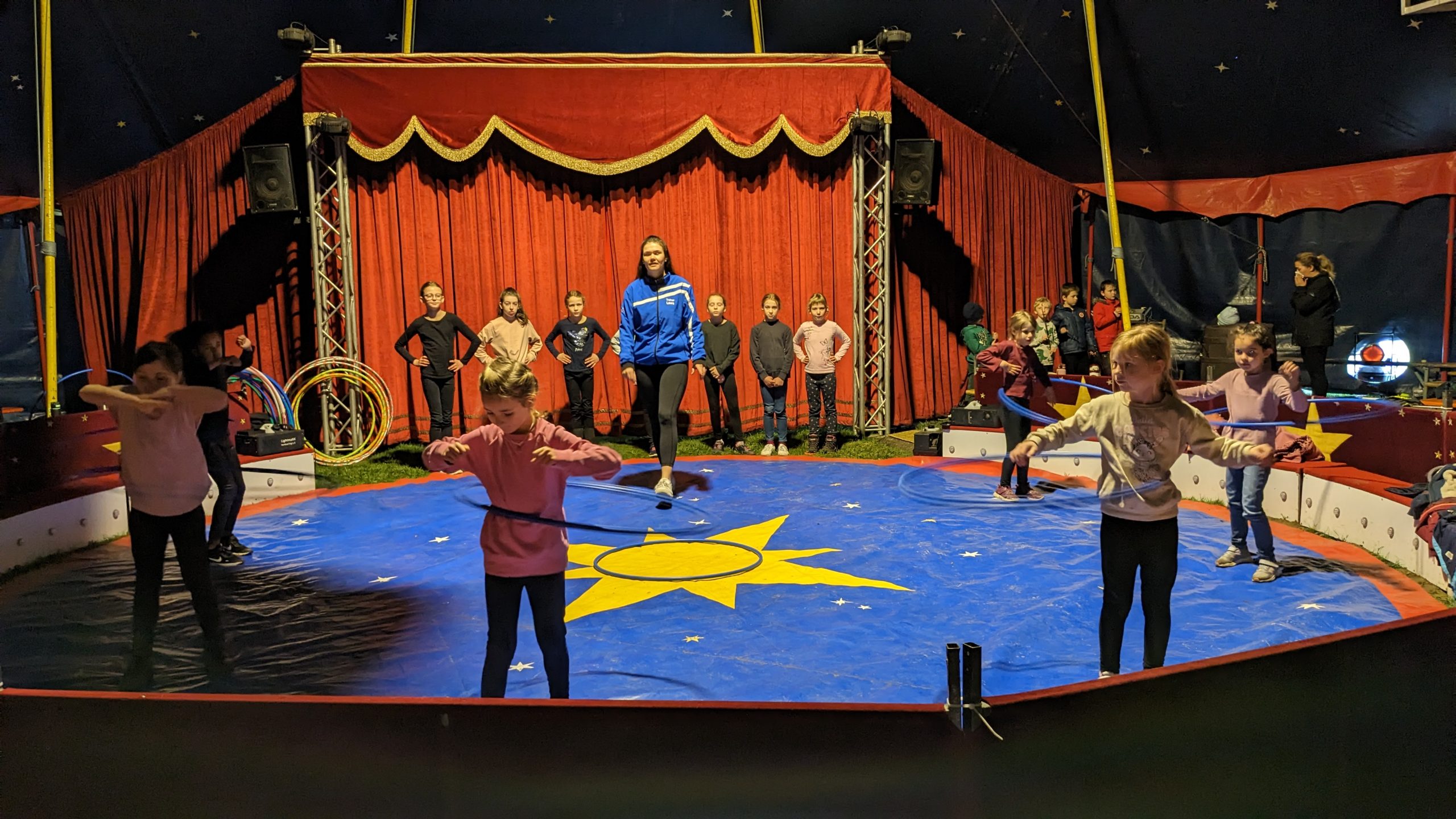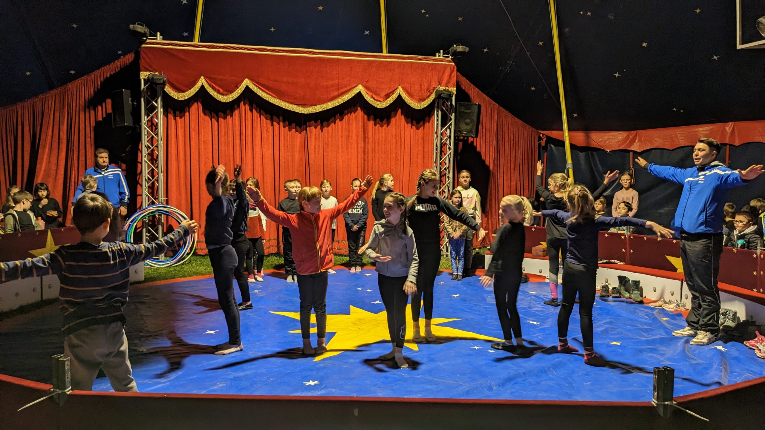 Einmal selber Clown sein oder mit Eleganz über ein Seil balancieren, davon haben viele Kinder schon einmal geträumt. Die Artisten des Kinderzirkus Aron übten in verschiedenen Gruppen mit Kindern von Klasse 1 bis 4 die unterschiedlichsten Zirkusnummern ein. Allen war klar: Am Ende der Woche sind wir die Stars in der Manege! Mit dementsprechendem Ehrgeiz wurde über vier Tage jeden Vormittag fleißig trainiert, sodass es am Donnerstagabend in der Vorstellung, die zum größten Teil von Eltern, Geschwistern und weiteren Verwandten besucht wurde, dann hieß: „Manege frei für eure Kinder!“ Nachdem Sandra Sperlich vom Kinderzirkus Aron die Besucher im vollbesetzten Zirkuszelt begrüßt hatte, ging es auch direkt los. Den Anfang machten die Hula-Hoop-Künstler, die im bunten Scheinwerferlicht ihre Reifen an Bauch, Arm und Hals drehten. Auch ein Riesenreifen mit gewaltigem Durchmesser kam dabei zum Einsatz. Als Finale wurde am Ende sogar ein brennender Reifen von einer jungen Artistin souverän um die Hüften geschwungen.