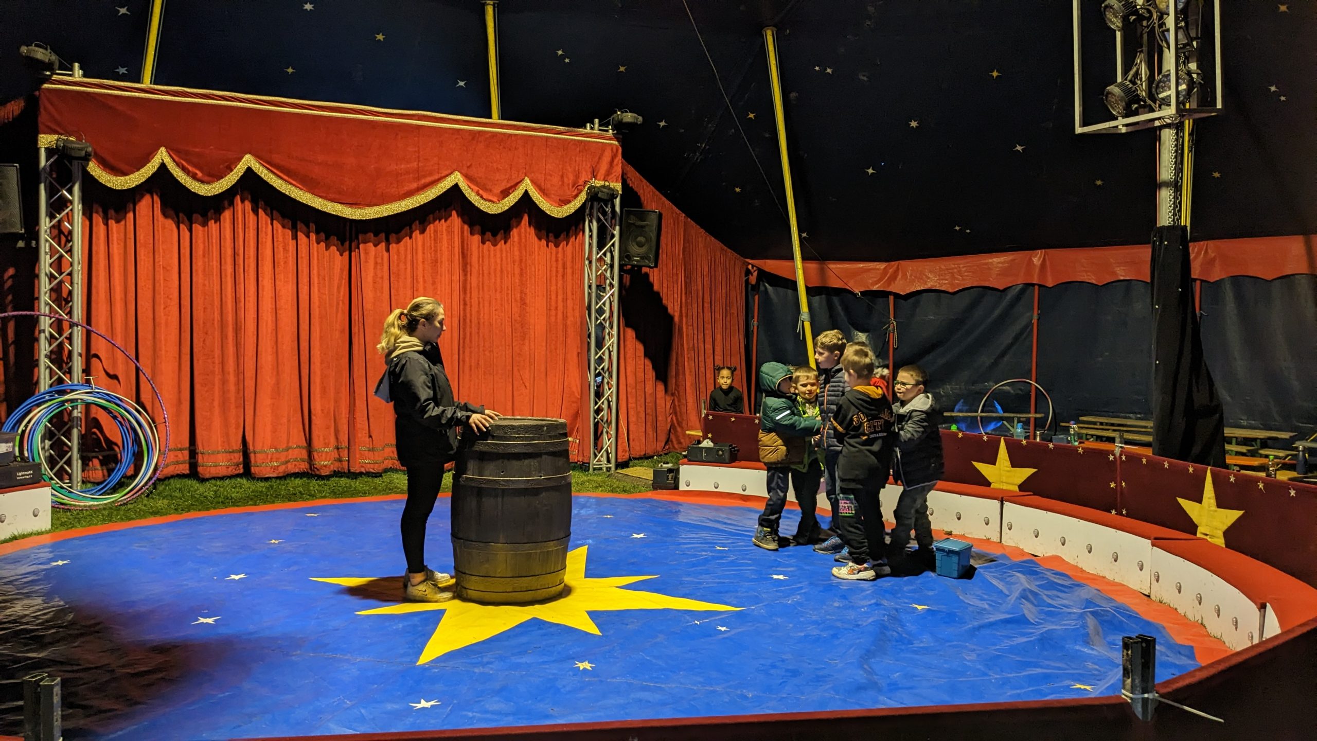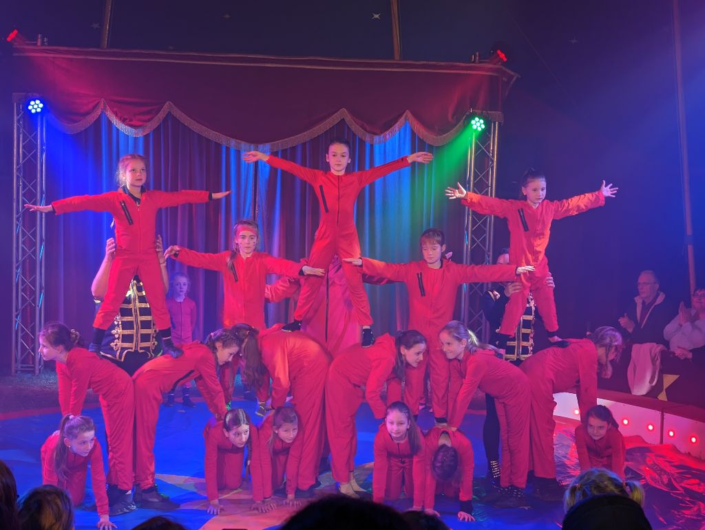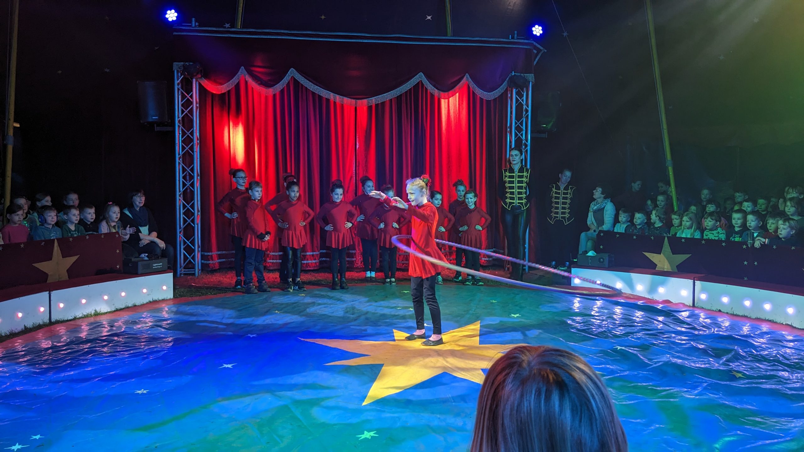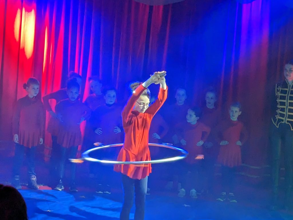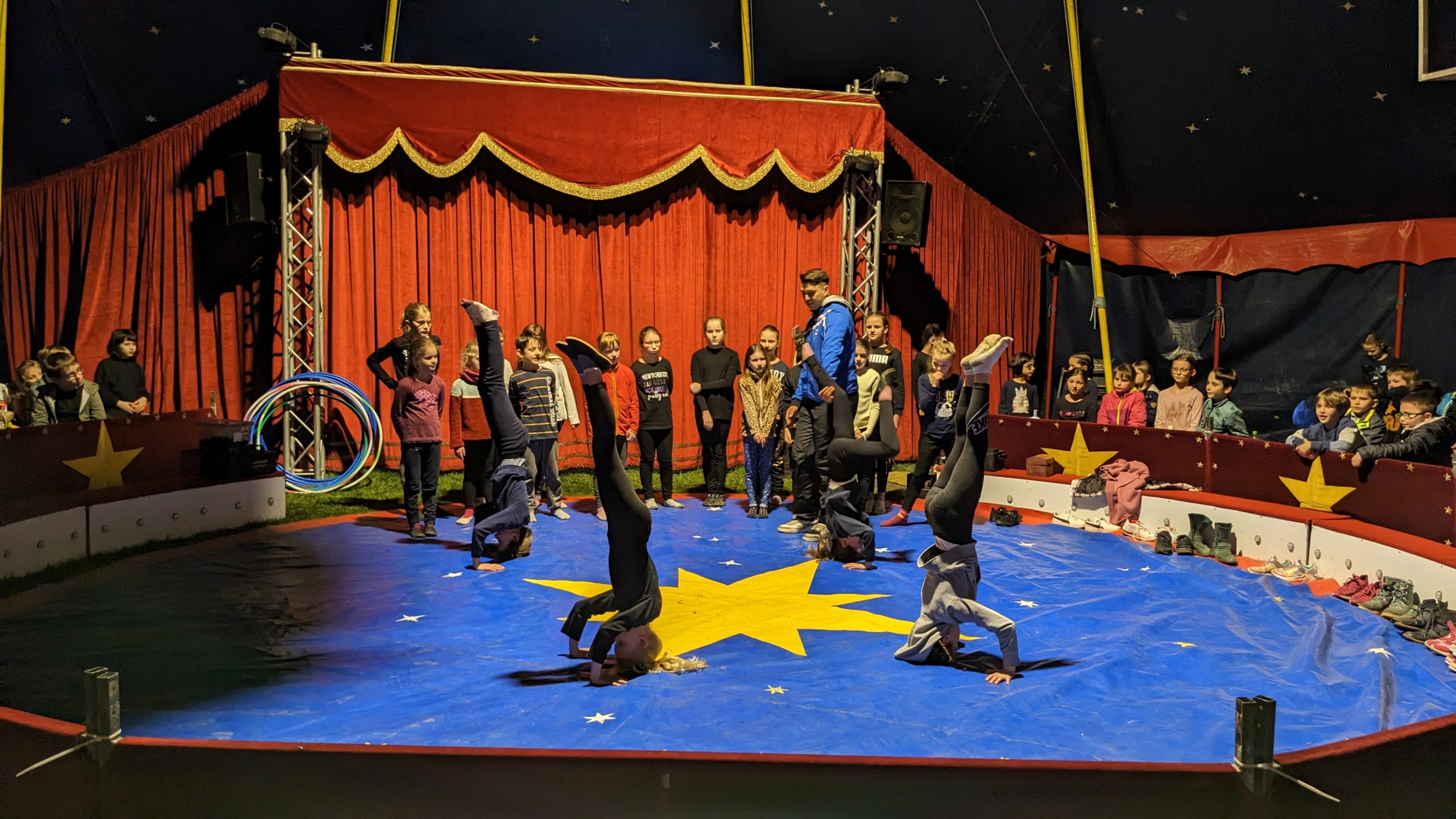 Einmal selber Clown sein oder mit Eleganz über ein Seil balancieren, davon haben viele Kinder schon einmal geträumt. Die Artisten des Kinderzirkus Aron übten in verschiedenen Gruppen mit Kindern von Klasse 1 bis 4 die unterschiedlichsten Zirkusnummern ein. Allen war klar: Am Ende der Woche sind wir die Stars in der Manege! Mit dementsprechendem Ehrgeiz wurde über vier Tage jeden Vormittag fleißig trainiert, sodass es am Donnerstagabend in der Vorstellung, die zum größten Teil von Eltern, Geschwistern und weiteren Verwandten besucht wurde, dann hieß: „Manege frei für eure Kinder!“ Nachdem Sandra Sperlich vom Kinderzirkus Aron die Besucher im vollbesetzten Zirkuszelt begrüßt hatte, ging es auch direkt los. Den Anfang machten die Hula-Hoop-Künstler, die im bunten Scheinwerferlicht ihre Reifen an Bauch, Arm und Hals drehten. Auch ein Riesenreifen mit gewaltigem Durchmesser kam dabei zum Einsatz. Als Finale wurde am Ende sogar ein brennender Reifen von einer jungen Artistin souverän um die Hüften geschwungen.