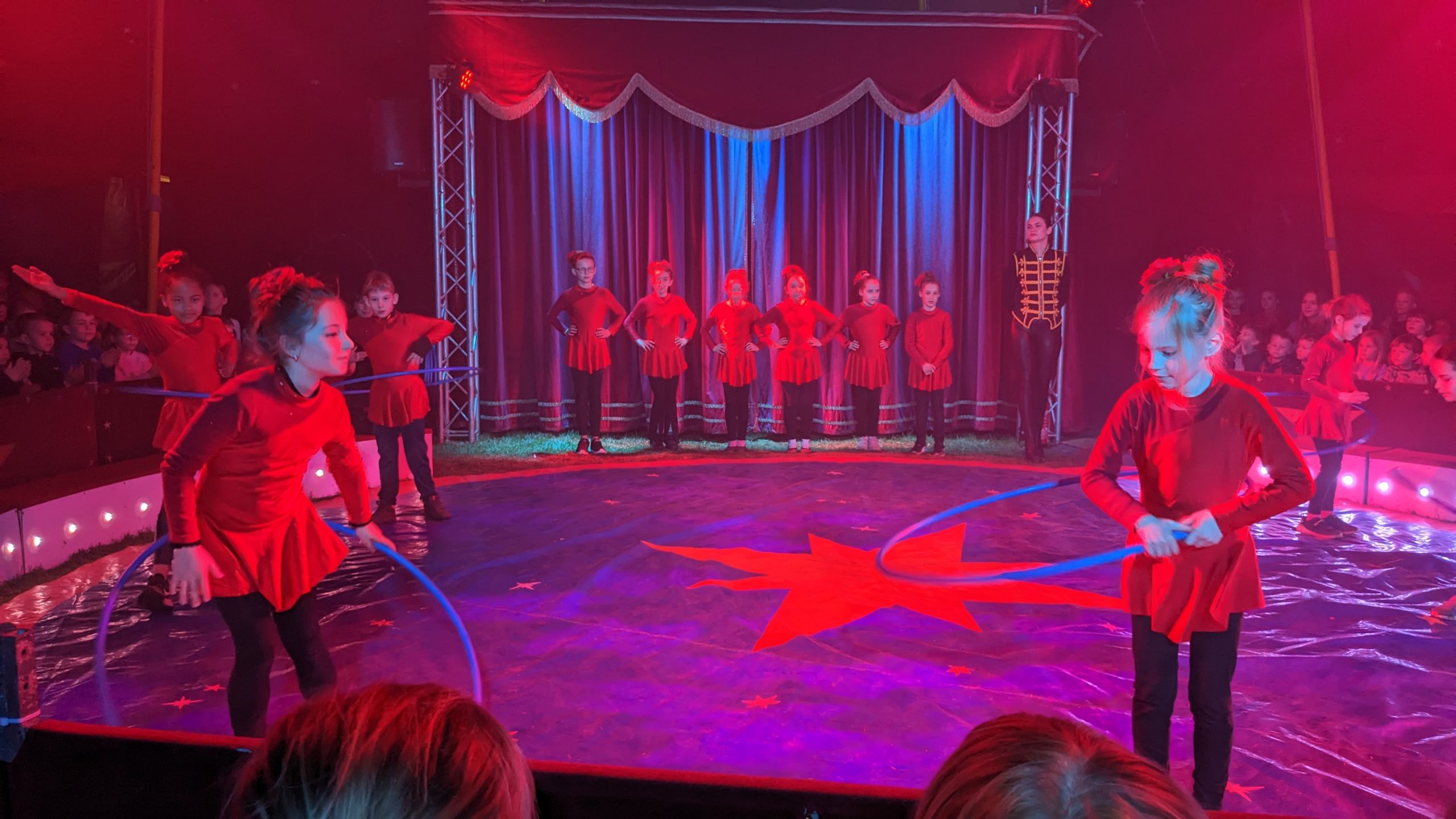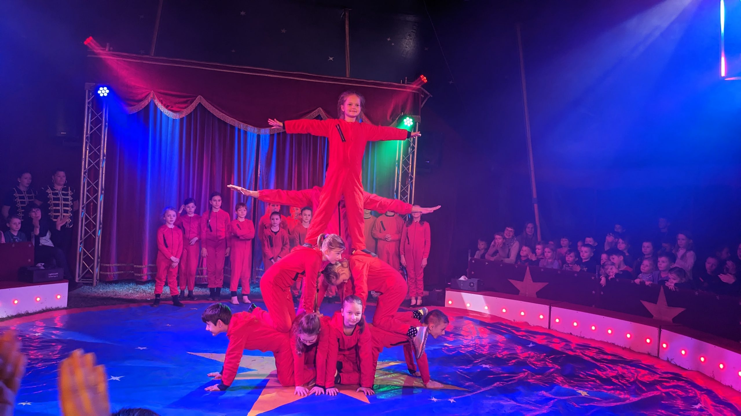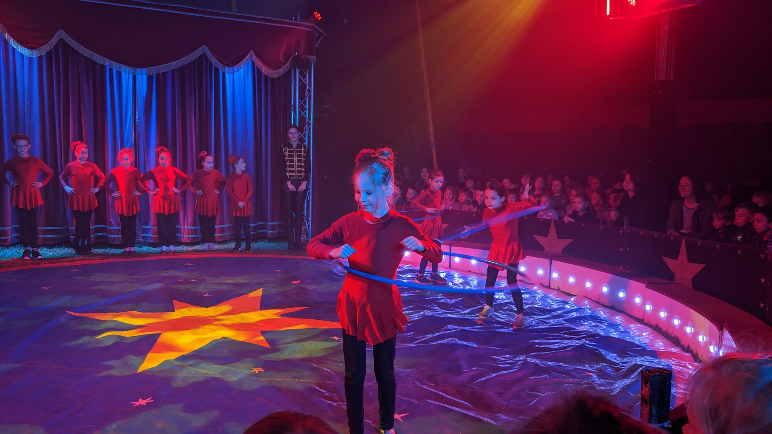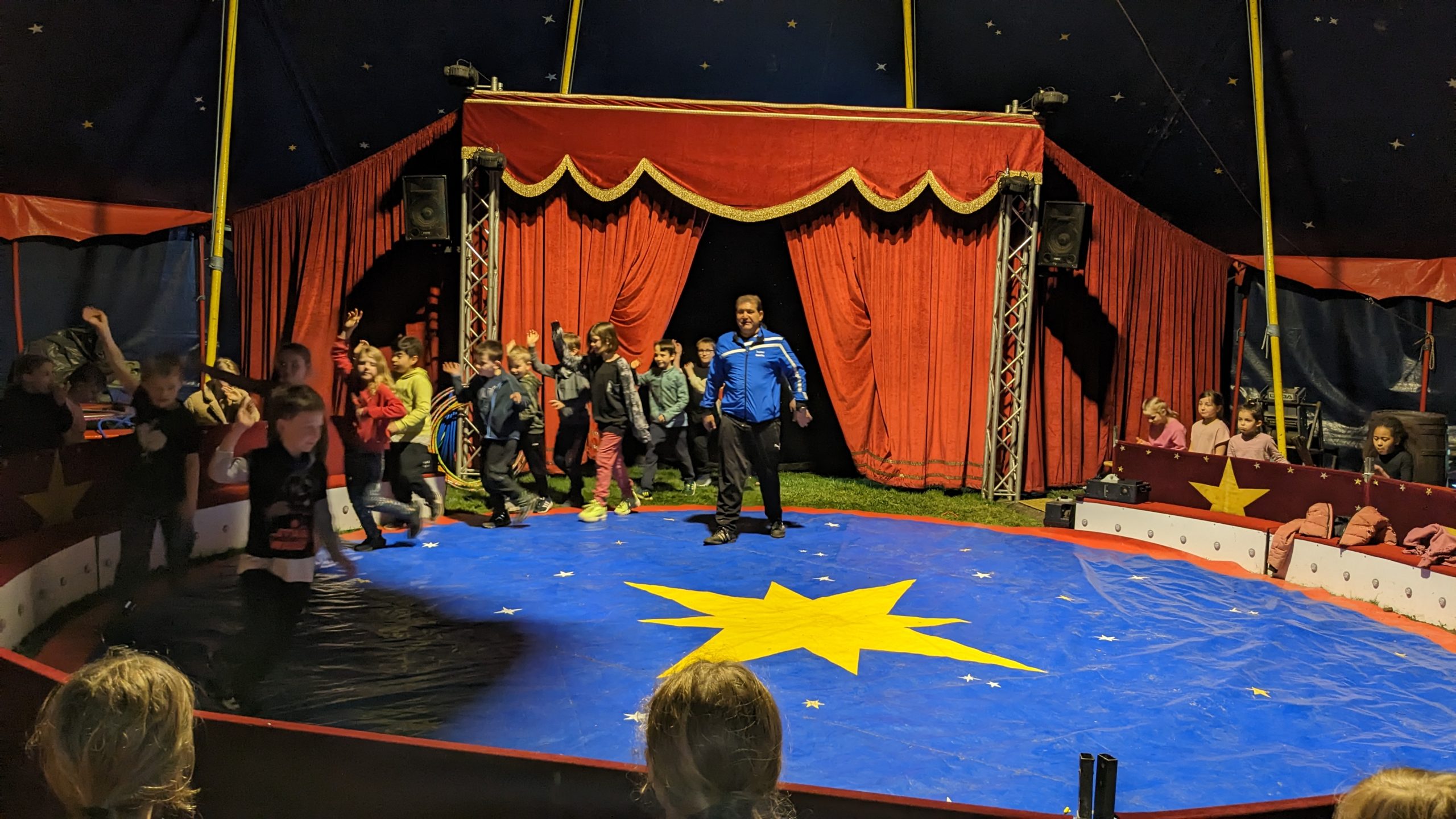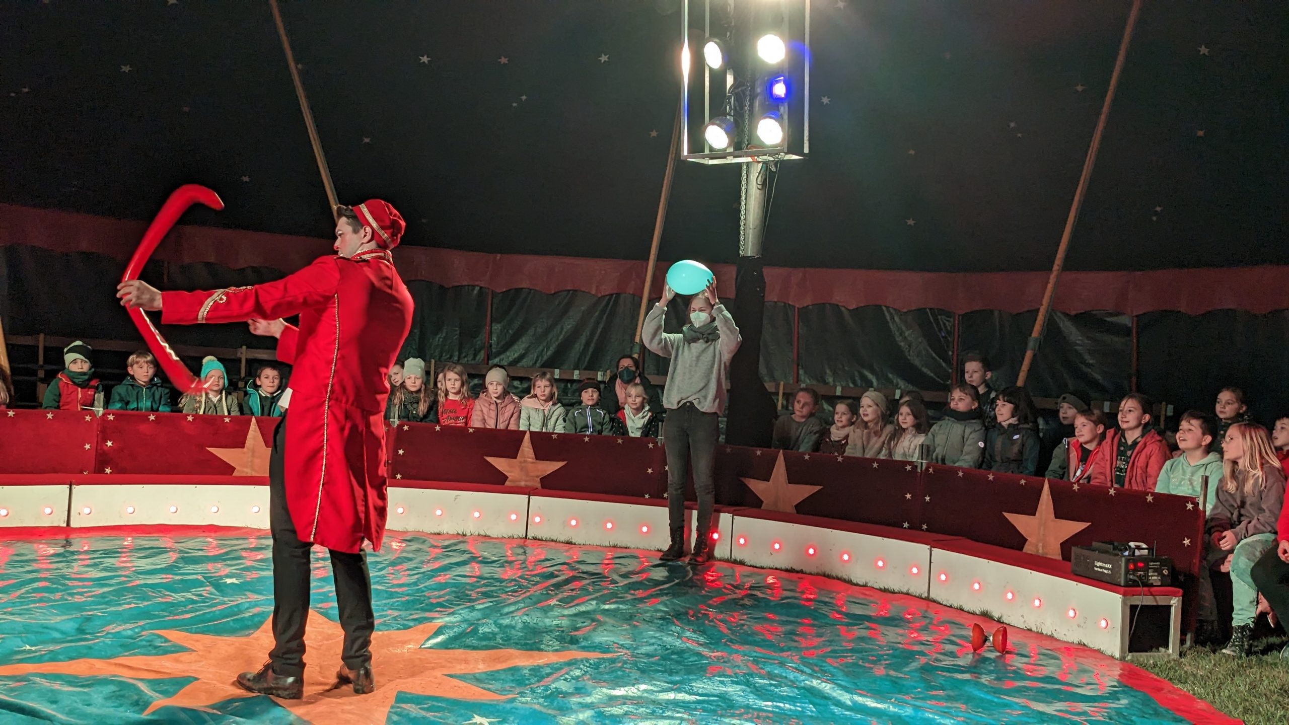 Einmal selber Clown sein oder mit Eleganz über ein Seil balancieren, davon haben viele Kinder schon einmal geträumt. Die Artisten des Kinderzirkus Aron übten in verschiedenen Gruppen mit Kindern von Klasse 1 bis 4 die unterschiedlichsten Zirkusnummern ein. Allen war klar: Am Ende der Woche sind wir die Stars in der Manege! Mit dementsprechendem Ehrgeiz wurde über vier Tage jeden Vormittag fleißig trainiert, sodass es am Donnerstagabend in der Vorstellung, die zum größten Teil von Eltern, Geschwistern und weiteren Verwandten besucht wurde, dann hieß: „Manege frei für eure Kinder!“ Nachdem Sandra Sperlich vom Kinderzirkus Aron die Besucher im vollbesetzten Zirkuszelt begrüßt hatte, ging es auch direkt los. Den Anfang machten die Hula-Hoop-Künstler, die im bunten Scheinwerferlicht ihre Reifen an Bauch, Arm und Hals drehten. Auch ein Riesenreifen mit gewaltigem Durchmesser kam dabei zum Einsatz. Als Finale wurde am Ende sogar ein brennender Reifen von einer jungen Artistin souverän um die Hüften geschwungen.