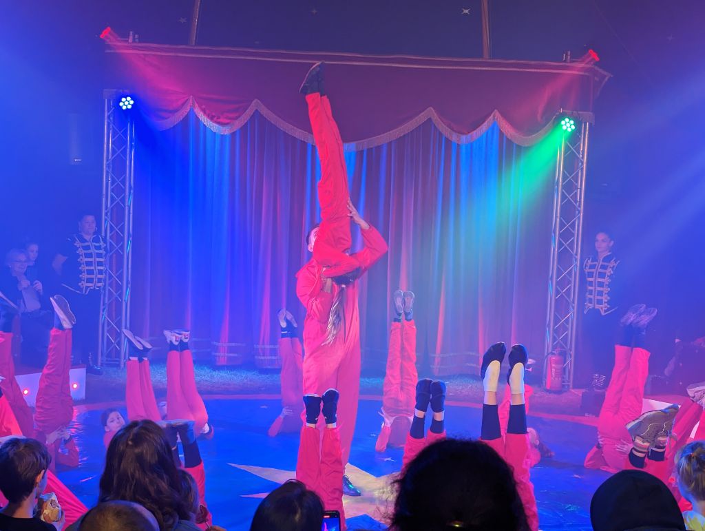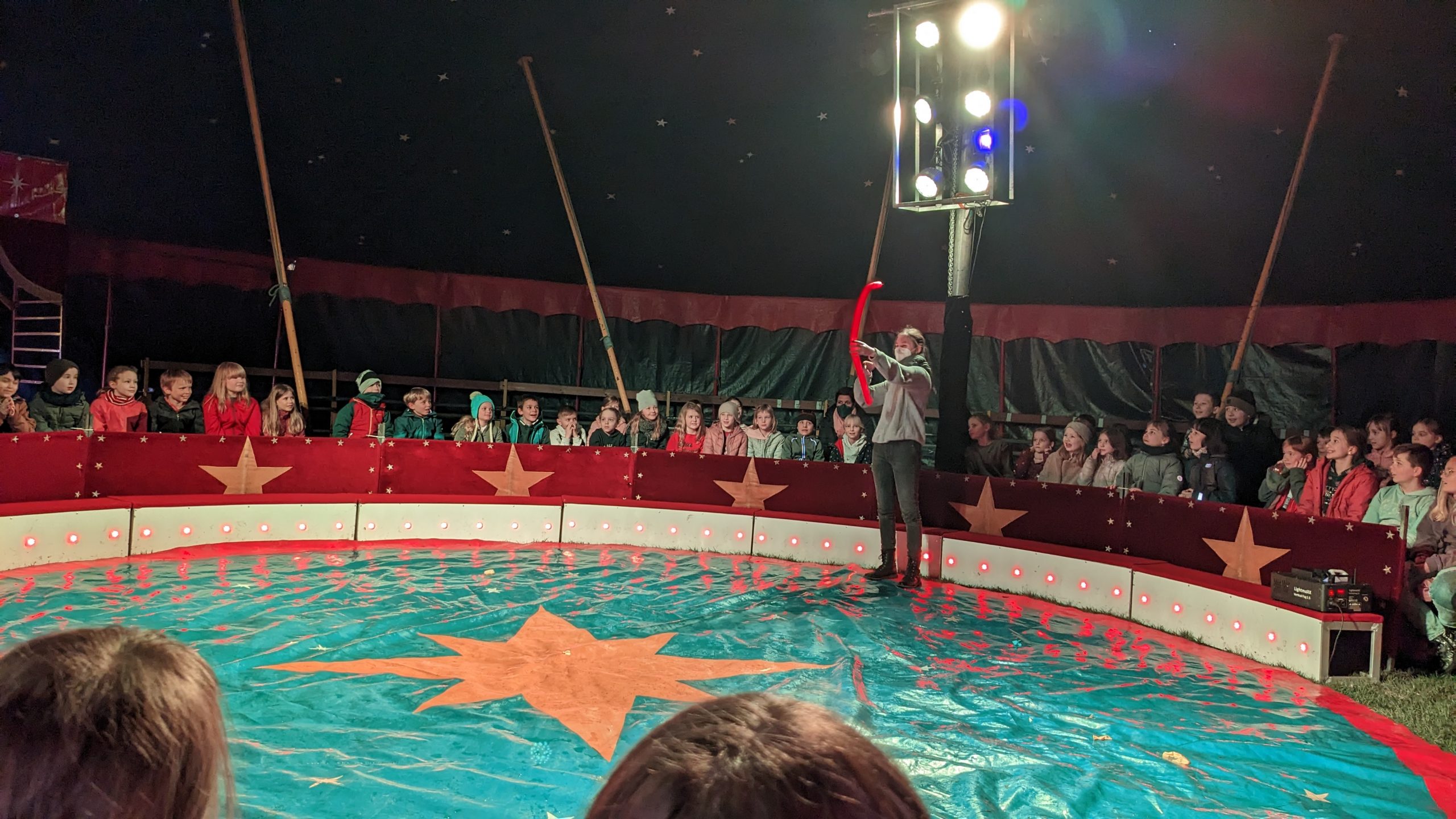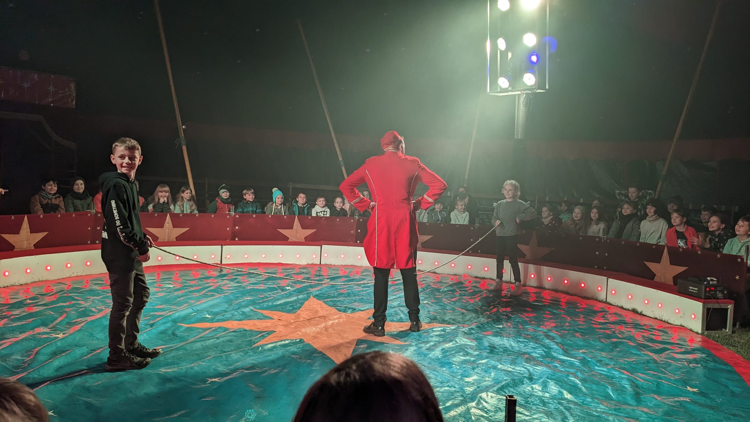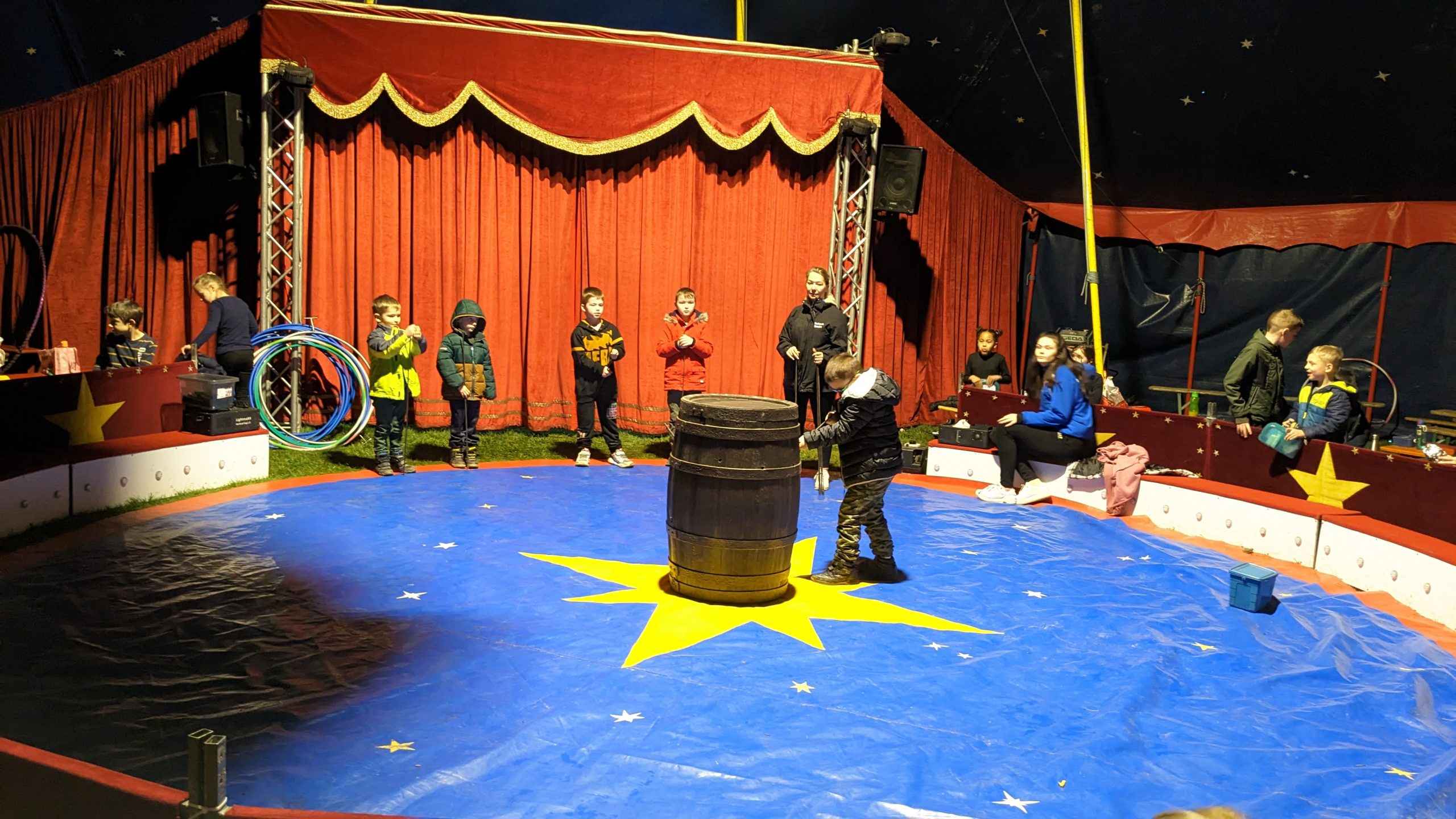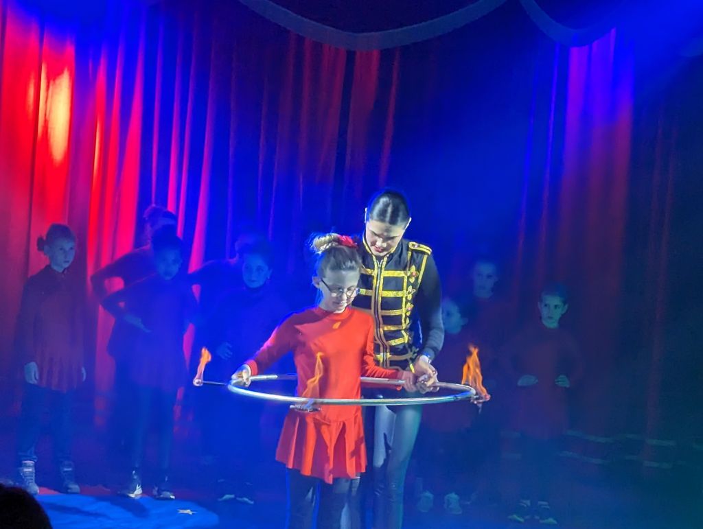 Einmal selber Clown sein oder mit Eleganz über ein Seil balancieren, davon haben viele Kinder schon einmal geträumt. Die Artisten des Kinderzirkus Aron übten in verschiedenen Gruppen mit Kindern von Klasse 1 bis 4 die unterschiedlichsten Zirkusnummern ein. Allen war klar: Am Ende der Woche sind wir die Stars in der Manege! Mit dementsprechendem Ehrgeiz wurde über vier Tage jeden Vormittag fleißig trainiert, sodass es am Donnerstagabend in der Vorstellung, die zum größten Teil von Eltern, Geschwistern und weiteren Verwandten besucht wurde, dann hieß: „Manege frei für eure Kinder!“ Nachdem Sandra Sperlich vom Kinderzirkus Aron die Besucher im vollbesetzten Zirkuszelt begrüßt hatte, ging es auch direkt los. Den Anfang machten die Hula-Hoop-Künstler, die im bunten Scheinwerferlicht ihre Reifen an Bauch, Arm und Hals drehten. Auch ein Riesenreifen mit gewaltigem Durchmesser kam dabei zum Einsatz. Als Finale wurde am Ende sogar ein brennender Reifen von einer jungen Artistin souverän um die Hüften geschwungen.