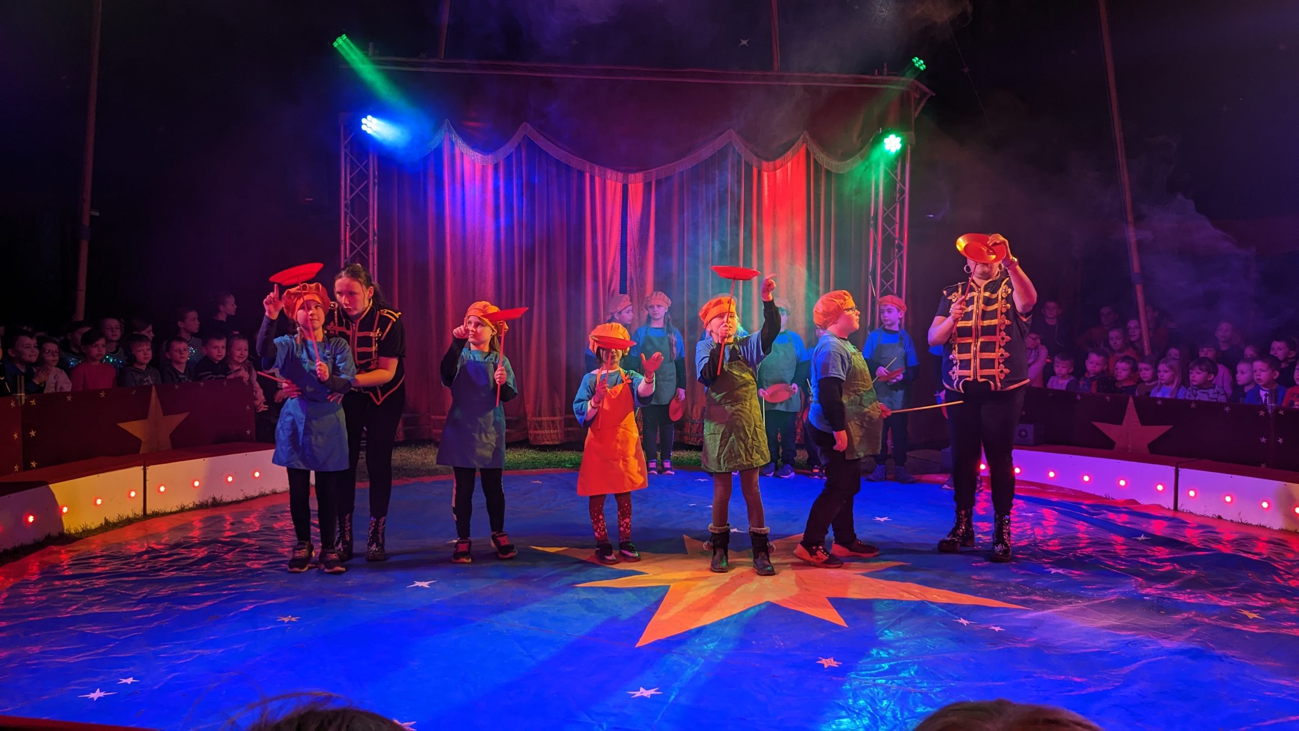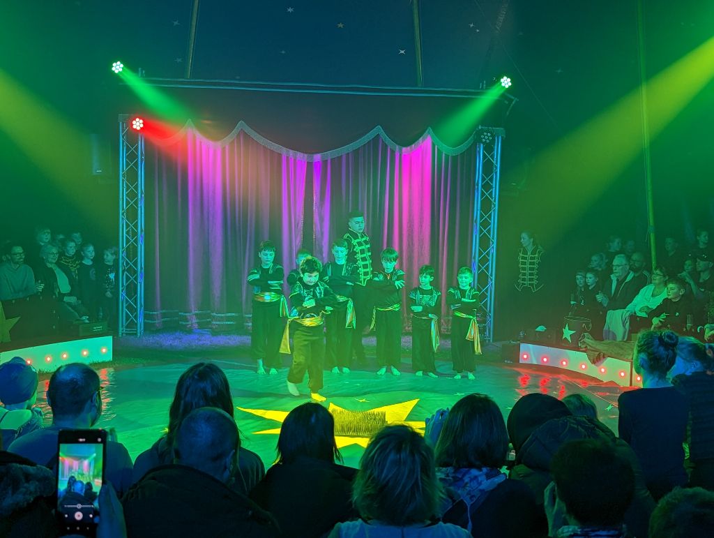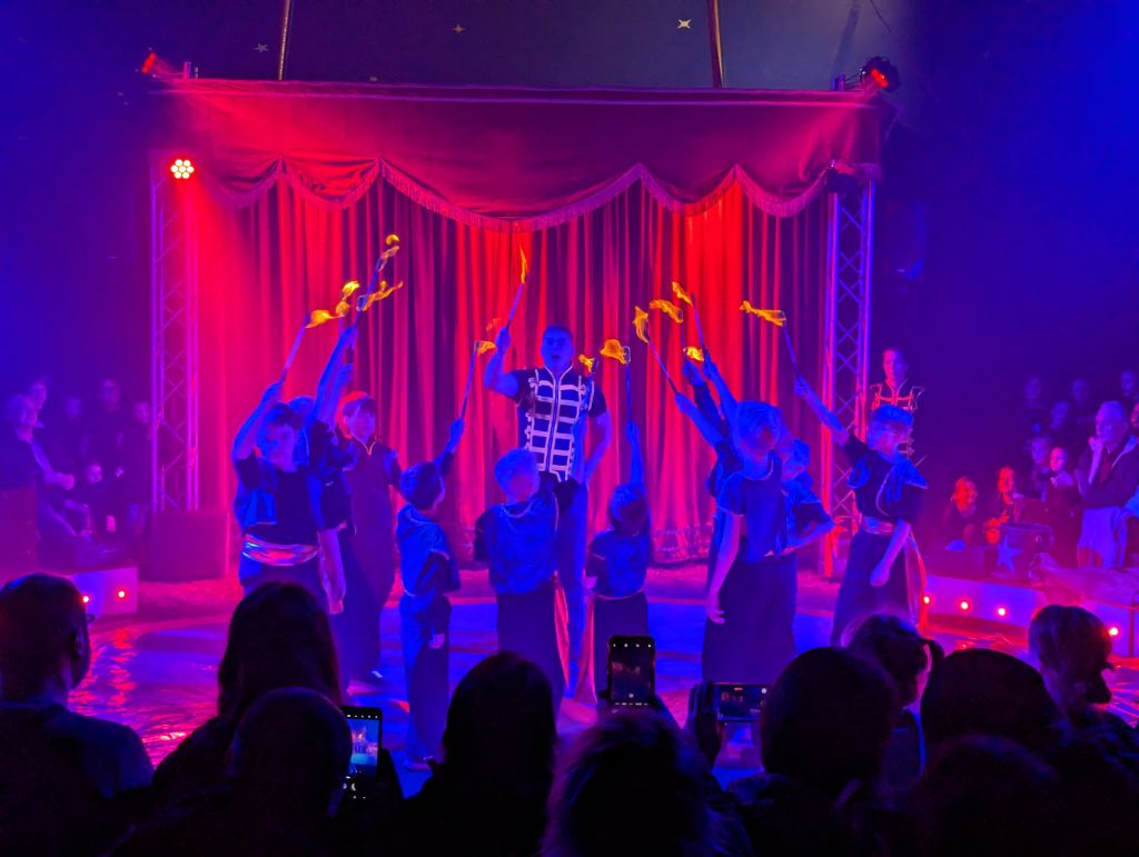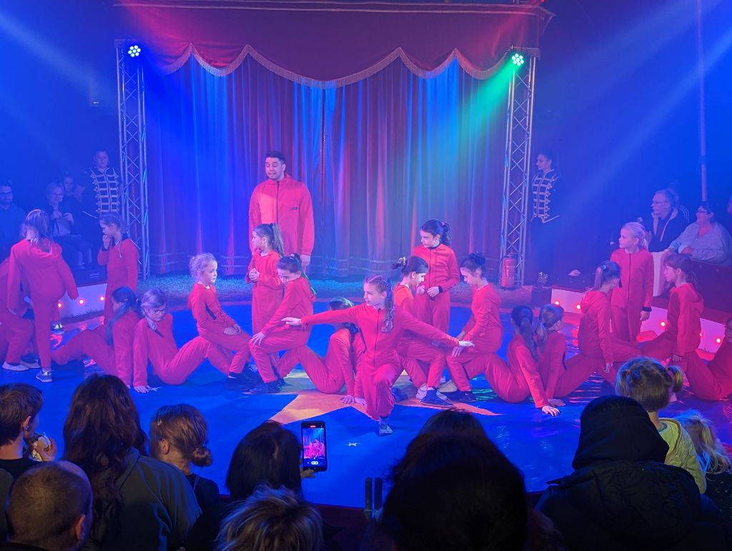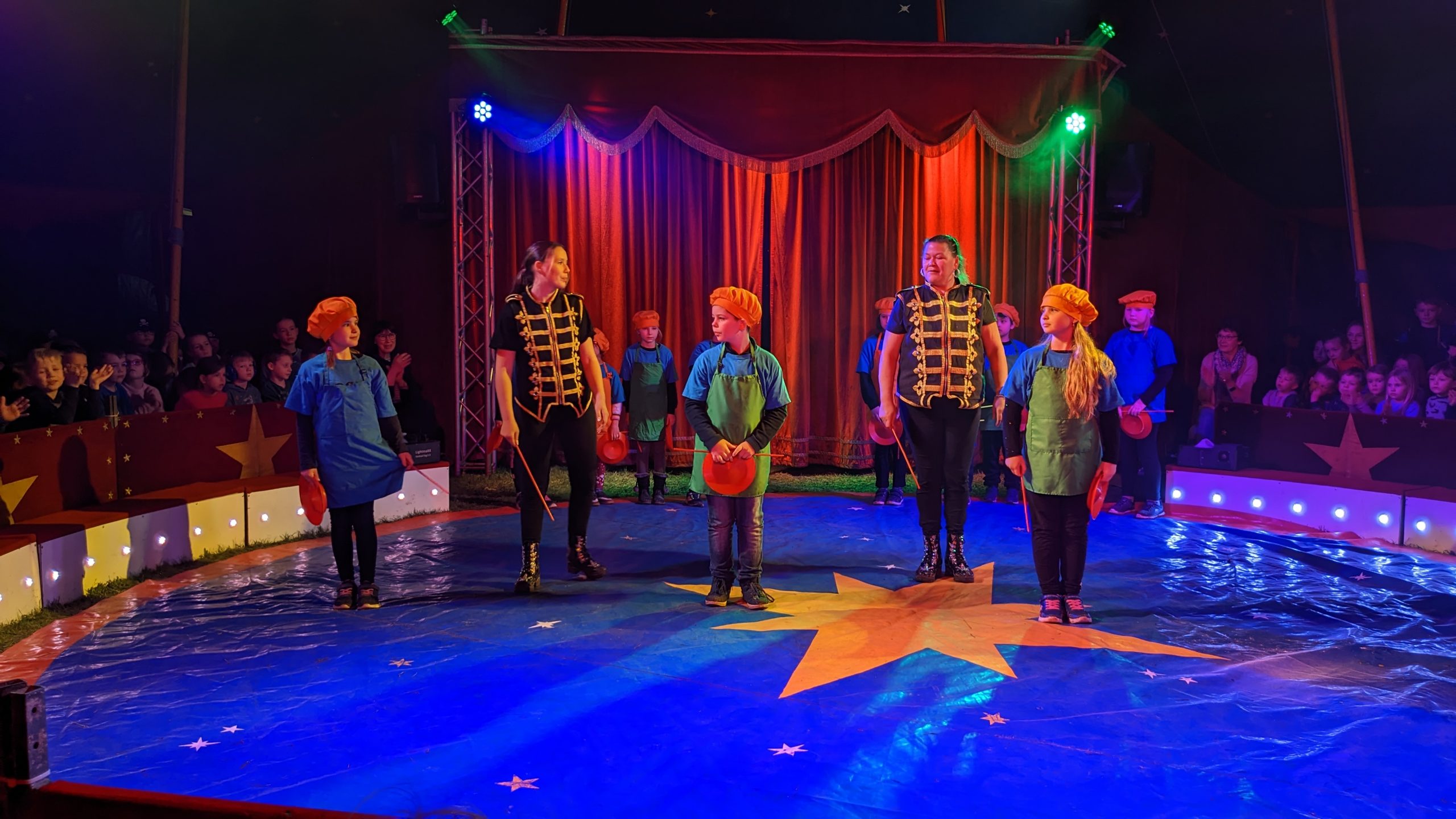Einmal selber Clown sein oder mit Eleganz über ein Seil balancieren, davon haben viele Kinder schon einmal geträumt. Die Artisten des Kinderzirkus Aron übten in verschiedenen Gruppen mit Kindern von Klasse 1 bis 4 die unterschiedlichsten Zirkusnummern ein. Allen war klar: Am Ende der Woche sind wir die Stars in der Manege! Mit dementsprechendem Ehrgeiz wurde über vier Tage jeden Vormittag fleißig trainiert, sodass es am Donnerstagabend in der Vorstellung, die zum größten Teil von Eltern, Geschwistern und weiteren Verwandten besucht wurde, dann hieß: „Manege frei für eure Kinder!“ Nachdem Sandra Sperlich vom Kinderzirkus Aron die Besucher im vollbesetzten Zirkuszelt begrüßt hatte, ging es auch direkt los. Den Anfang machten die Hula-Hoop-Künstler, die im bunten Scheinwerferlicht ihre Reifen an Bauch, Arm und Hals drehten. Auch ein Riesenreifen mit gewaltigem Durchmesser kam dabei zum Einsatz. Als Finale wurde am Ende sogar ein brennender Reifen von einer jungen Artistin souverän um die Hüften geschwungen.