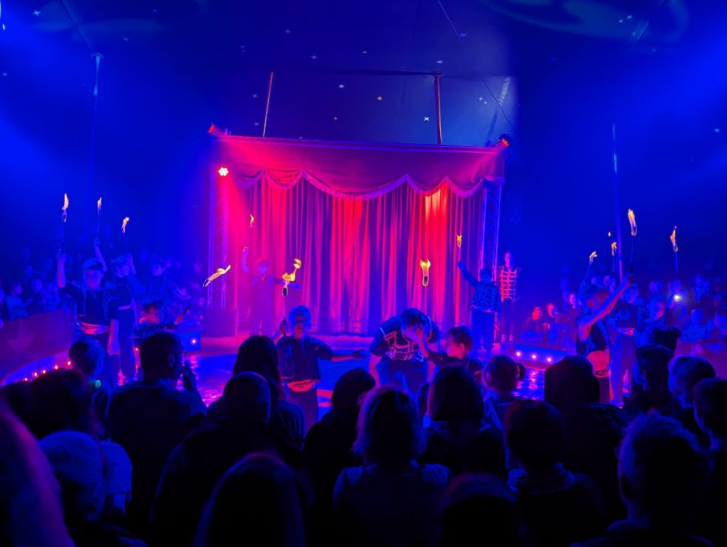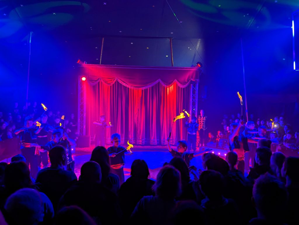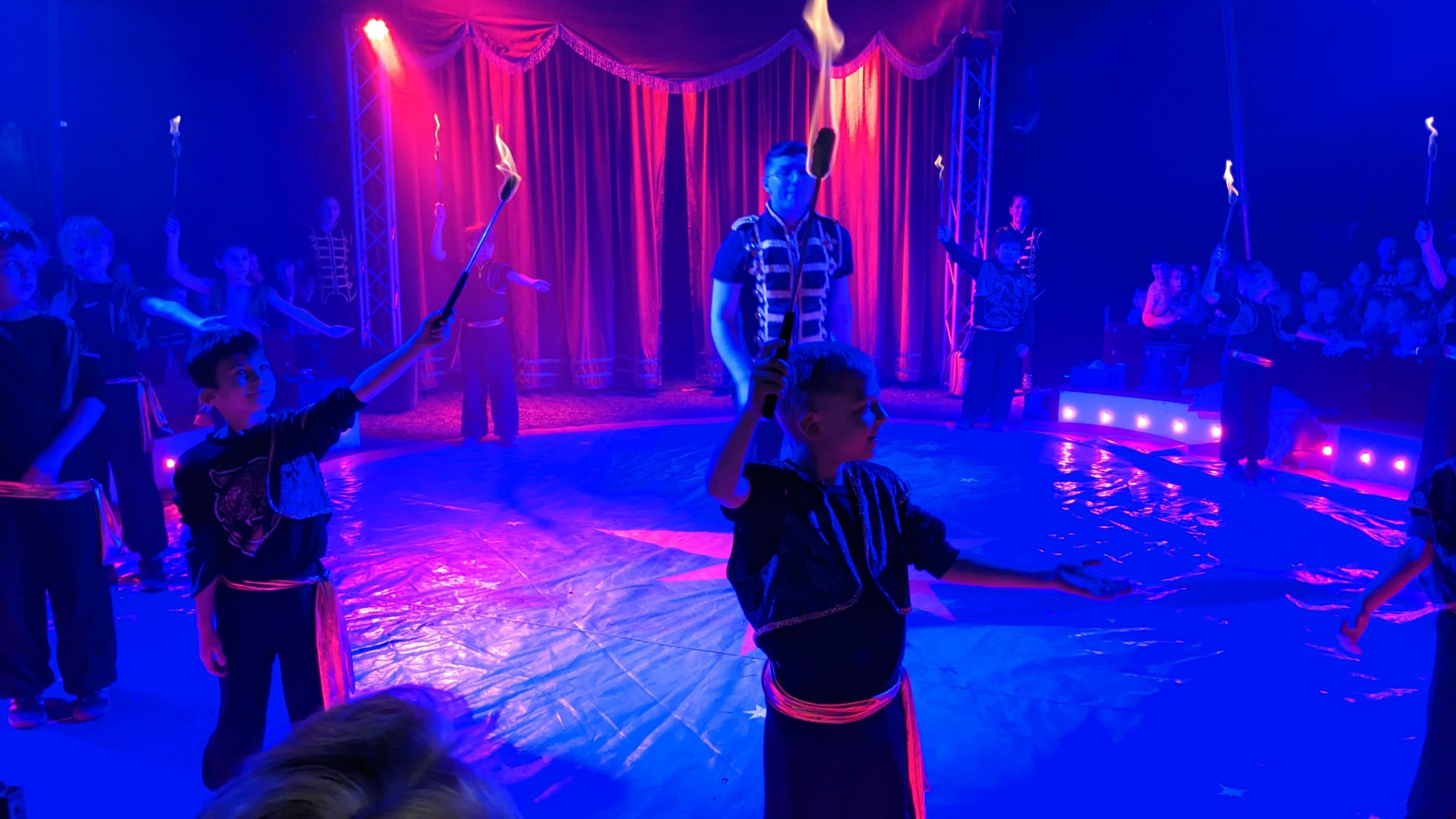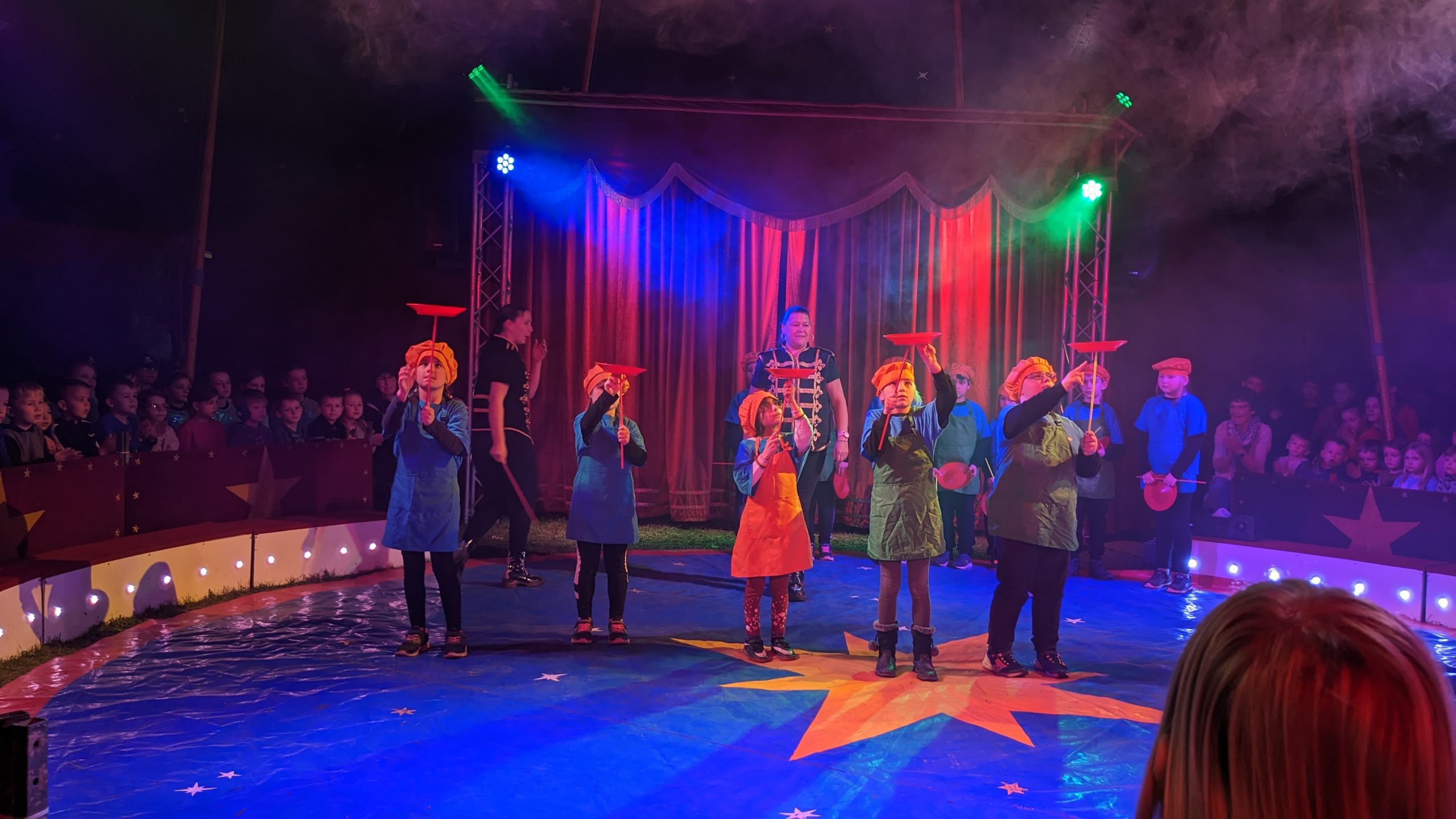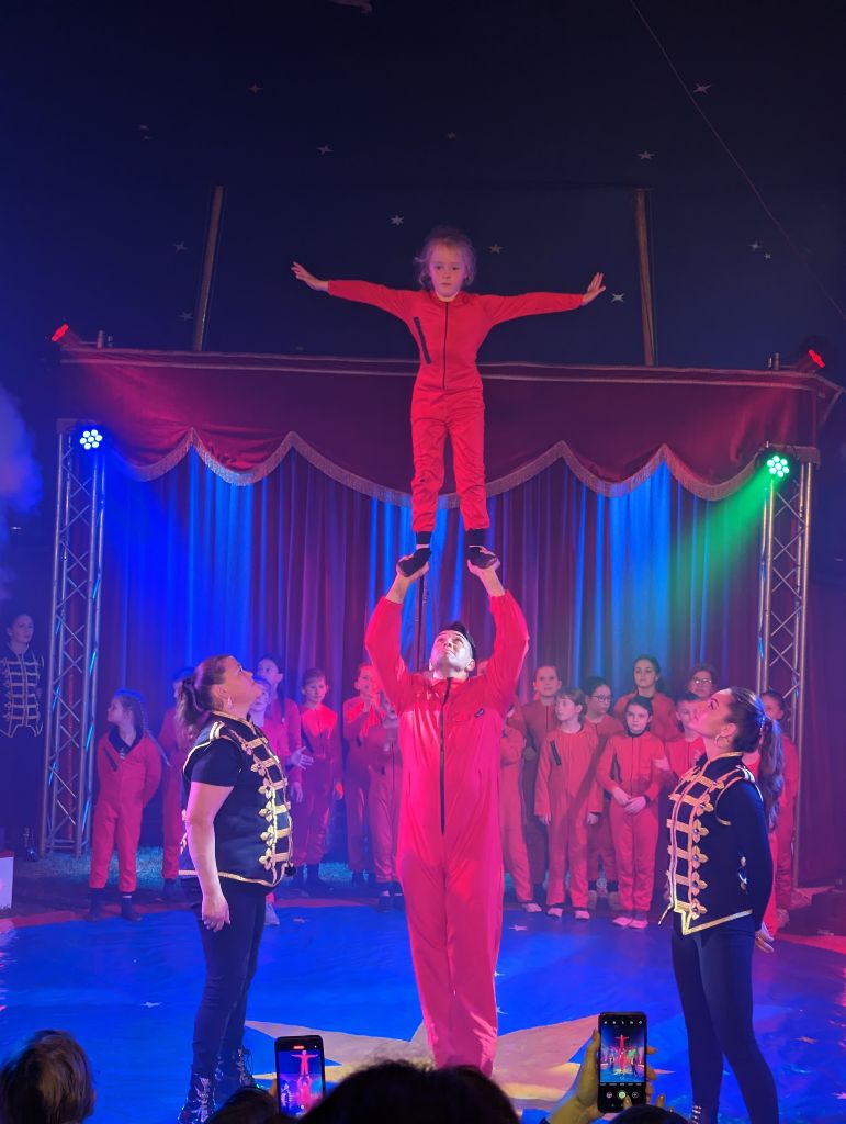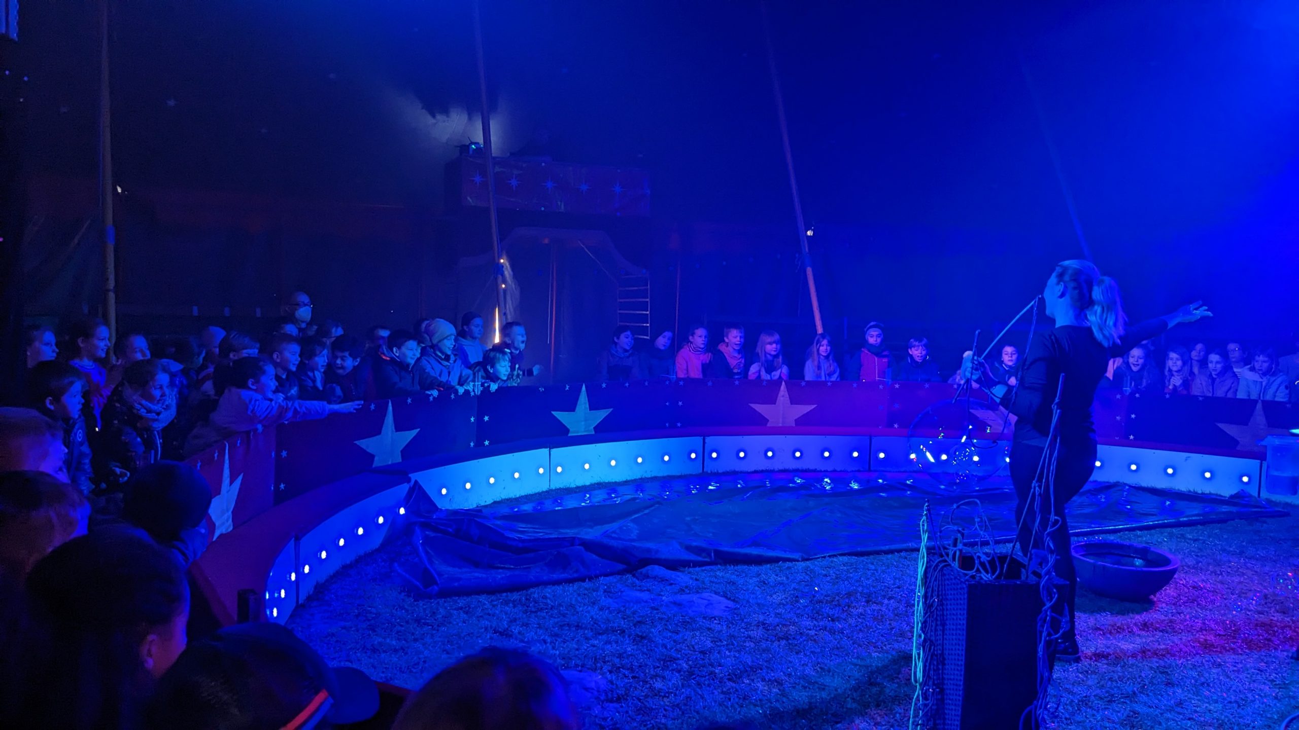 Einmal selber Clown sein oder mit Eleganz über ein Seil balancieren, davon haben viele Kinder schon einmal geträumt. Die Artisten des Kinderzirkus Aron übten in verschiedenen Gruppen mit Kindern von Klasse 1 bis 4 die unterschiedlichsten Zirkusnummern ein. Allen war klar: Am Ende der Woche sind wir die Stars in der Manege! Mit dementsprechendem Ehrgeiz wurde über vier Tage jeden Vormittag fleißig trainiert, sodass es am Donnerstagabend in der Vorstellung, die zum größten Teil von Eltern, Geschwistern und weiteren Verwandten besucht wurde, dann hieß: „Manege frei für eure Kinder!“ Nachdem Sandra Sperlich vom Kinderzirkus Aron die Besucher im vollbesetzten Zirkuszelt begrüßt hatte, ging es auch direkt los. Den Anfang machten die Hula-Hoop-Künstler, die im bunten Scheinwerferlicht ihre Reifen an Bauch, Arm und Hals drehten. Auch ein Riesenreifen mit gewaltigem Durchmesser kam dabei zum Einsatz. Als Finale wurde am Ende sogar ein brennender Reifen von einer jungen Artistin souverän um die Hüften geschwungen.