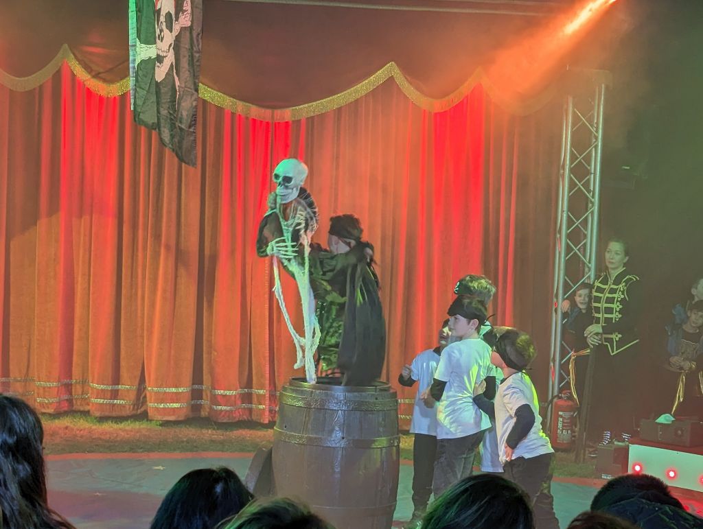 In den nun folgenden Nummern zeigten als Köche verkleidete Tellerdreher ihr Geschick und ließen die Teller dabei sogar hüpfen. Wenig später kaperte eine als Piraten verkleidete Kindergruppe kurzeitig die Manege, um ihren eingeübten Schwerter-Zaubertrick zu präsentieren. Die folgende Seiltanznummer, bei der auf dem Seil auch durch Reifen geklettert oder gesprungen wurde, sorgte bei den Zuschauern für staunende Gesichter und zeigte einmal mehr, welch außergewöhnliche Fähigkeiten alle Kinder durch die tolle Anleitung der Zirkusmitarbeiter in so kurzer Zeit erlernen konnten. Nach der kurzen Pause ging es dann akrobatisch weiter. Eine als Diebe verkleidete große Kindergruppe versuchte mit Hilfe von Menschenpyramiden, die hoch in der Luft hängende Beute zu ergaunern. Eine artistische Meisterleistung, die großen Applaus und Begeisterung hervorrief und von den Schülern viel Mut aber auch gegenseitiges Vertrauen erforderte. Im Anschluss daran sorgten die Fakire für Spannung: Sie liefen über Nagelbretter und Glasscherben und zeigten ihr Geschick mit brennenden Fackeln sowie beim Feuerspucken. Aber auch die Lachmuskeln kamen während der gesamten Vorstellung nicht zu kurz. Für amüsante Unterhaltung und den ein oder anderen herzhaften Lacher sorgten die Clowns, die natürlich in keinem Zirkus fehlen dürfen. Anders als die bekannten tollpatschigen Clowns, wollten diese jedoch ihre Zauberkünste unter Beweis stellen oder aber ihrer Trainerin auf humorvolle Art und Weise den letzten Nerv rauben, was ihnen auch eindrucksvoll gelang.