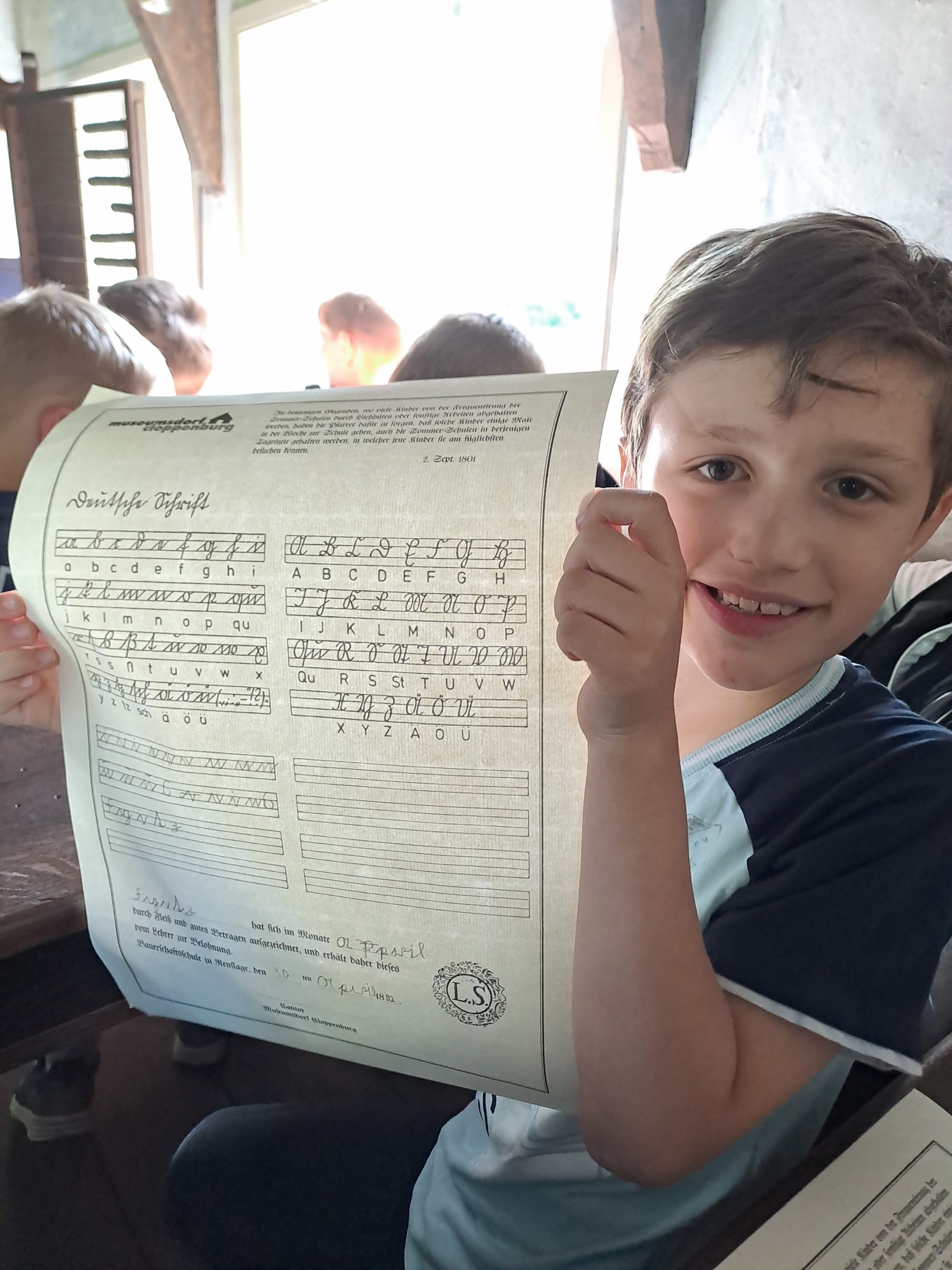 Passend zum Jubiläum der Ortschaft Wehrendorf, die in diesem Jahr ihren 950. Geburtstag feiert, entschied sich die Schulgemeinschaft dazu, im Jahr 2024 eine Projektwoch zum Thema „Leben damals und heute“ zu machen. Zu den Höhepunkten dieser ereignisreichen Woche gehörte sicherlich der Besuch im Museumsdorf Cloppenburg. Beispielhaft soll hier der Besuch einer alten Dorfschule aus dem 18. Jahrhundert durch die Klassen 1 und 2 erwähnt werden. Hier lernten sie u.a. eine neue Schrift -die sogenannte „Deutsche Schreibschrift bzw. Deutsche Kurrentschrift“- kennen. Das Erstaunen der Kinder war bei einigen dieser Schreibschriftbuchstaben groß. „Was? Das soll ein „d“ sein?