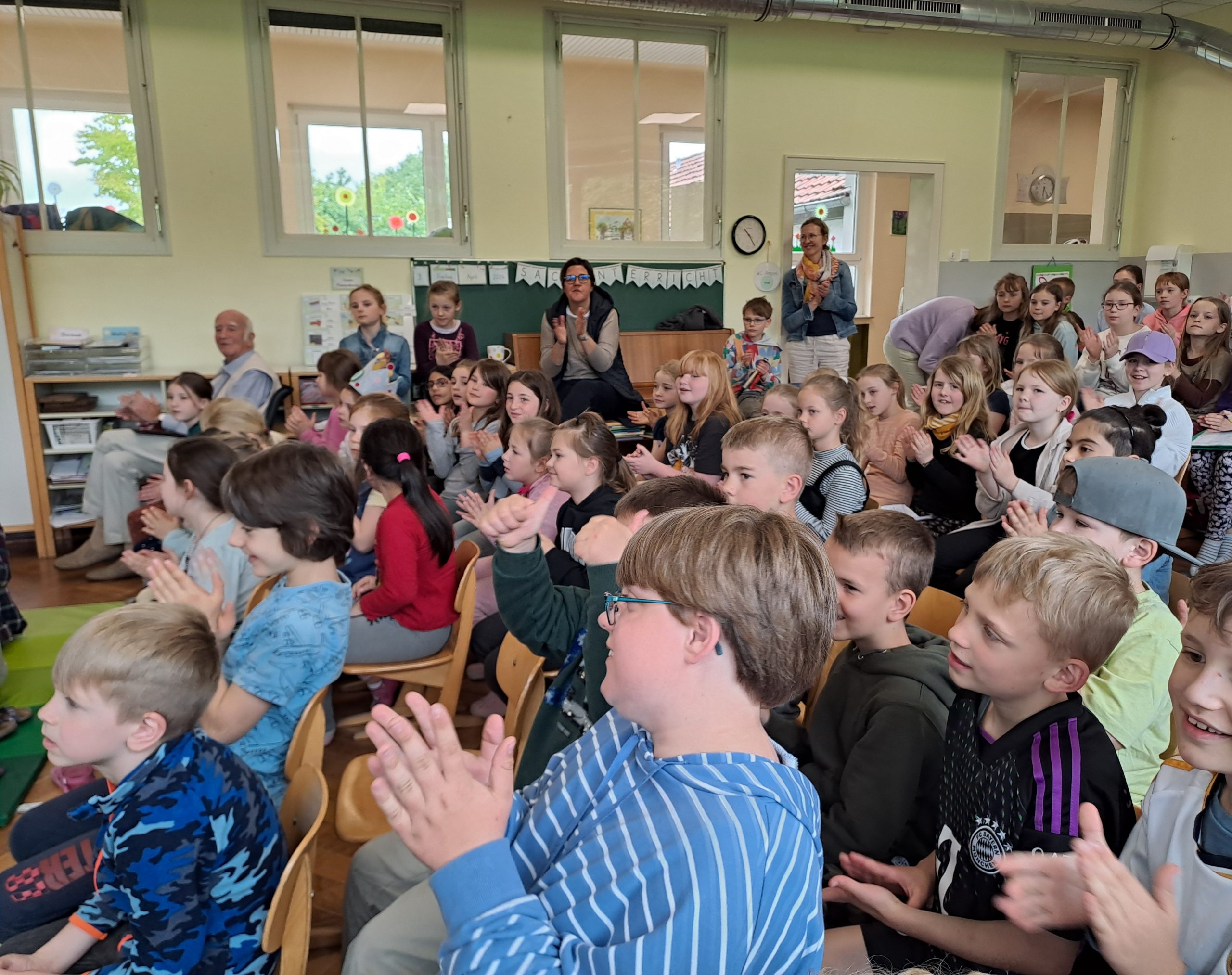 Der Freitag, der als letzter Tag der Projektwoche angedacht war, beinhaltete die Präsentationen der verschiedenen Klassen zu den erlebten Dingen. Hier war jederzeit spürbar, wie viel die Kinder im Laufe der vergangenen Tage dazugelernt hatten (z.B. über die Milchleistung und Größe der Kühe im Vergleich zu heute oder über eine Maschine mit Laufrad, die mit Hilfe eines Hundes Butter stampfte). Alle Klassen gaben sich große Mühe und hatten viel vorbereitet. So musste die Präsentation durch die Vielzahl der Beiträge sogar noch am Montag in die „Verlängerung“ gehen.