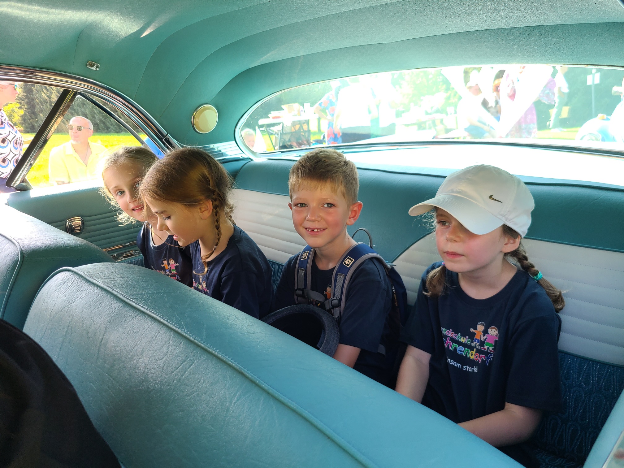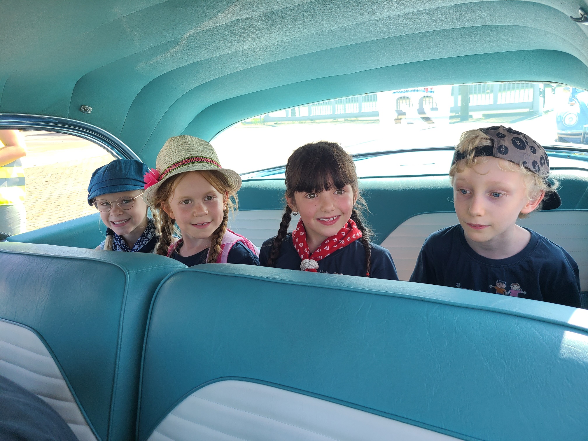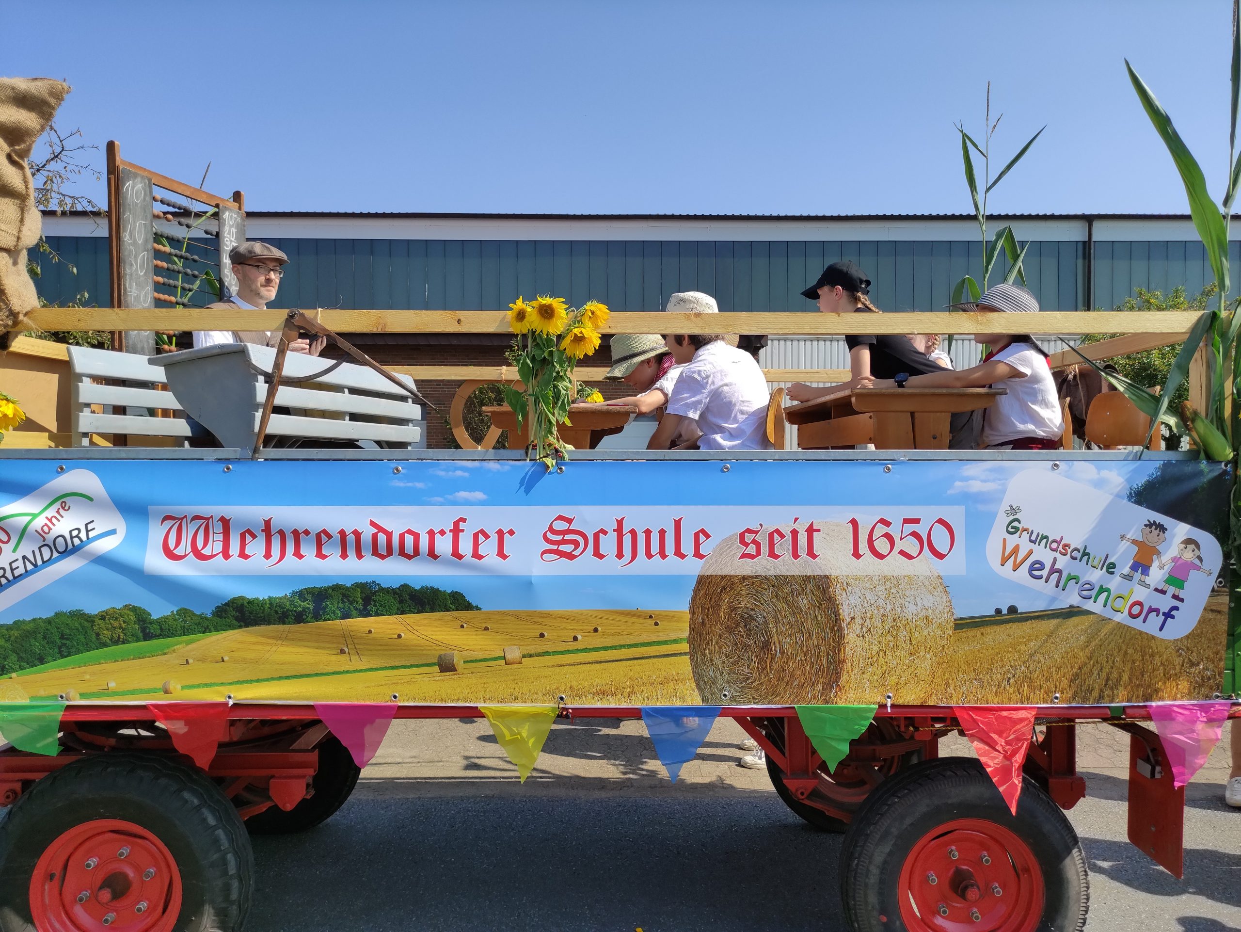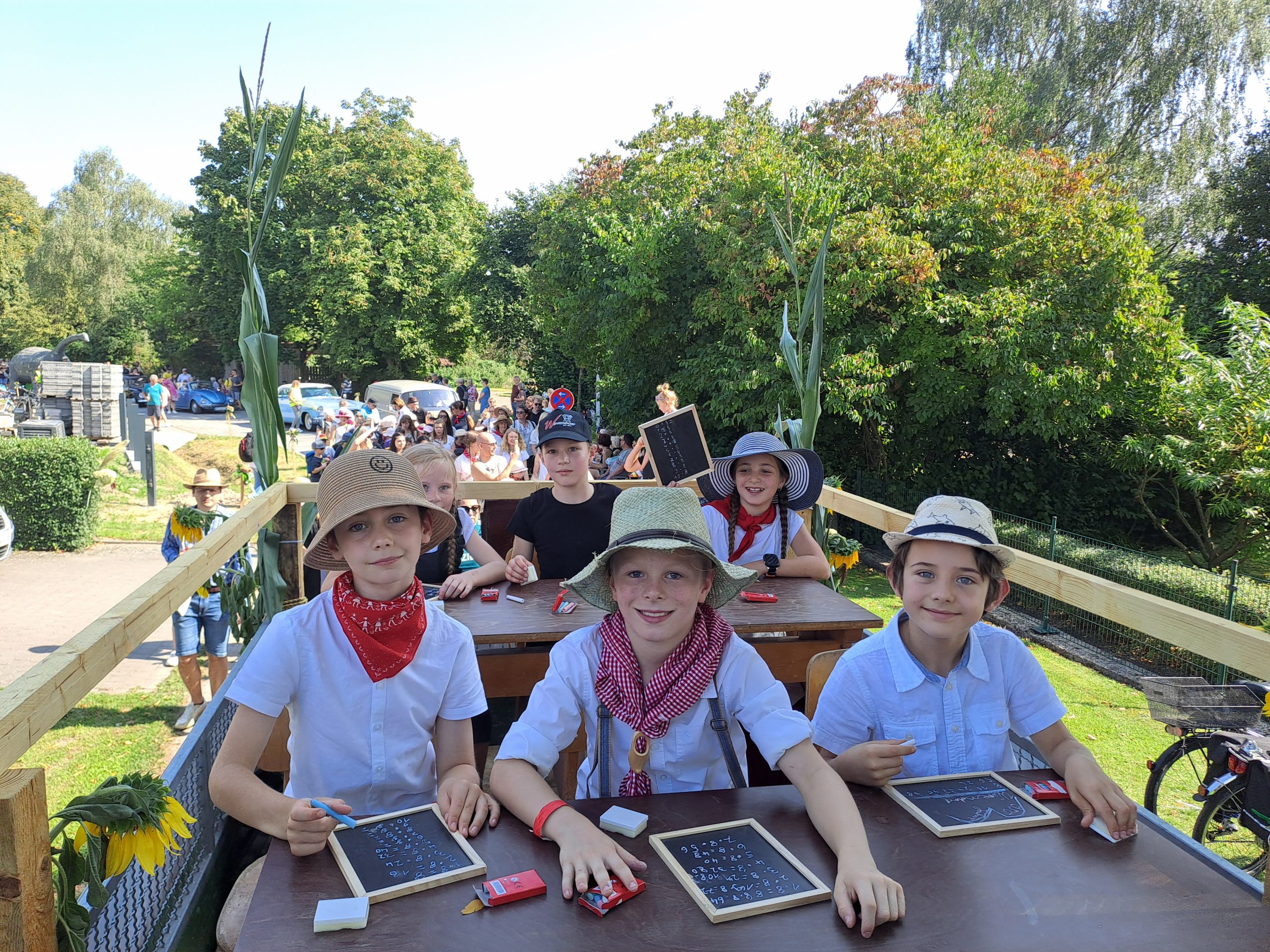 Am Sonntag folgte dann der große Festumzug quer durch die Straßen von Wehrendorf. Zu den Klängen von „Maple Leaf Rag“, „Puttin‘ On The Ritz“ usw. machten die verkleideten Kinder auf dem Festwagen eine tolle Figur. Hier zeigten sie dem Publikum auf alten Stühlen und an alten Tischen, wie der Unterricht zu jener Zeit ausgesehen hat. Auch antike Schulmaterialien wie ein riesiger Rechenrahmen aus dem Schulmuseum Bohmte waren an Bord. Die übrigen Kinder sorgten als Fußgruppe für gute Stimmung und nutzen teilweise auch die von der Schule organisierten Oldtimer. Es war zwei Stunden lang ein fantastisches Ereignis, was alle Beteiligten sicherlich niemals vergessen werden. Ein herzliches Dankeschön der Schule an alle Eltern, die durch Wagenbau, Wagendekoration, Begleitung oder sonstige Aktivitäten zum Gelingen dieses Festes aktiv beigetragen haben. Wir wissen Ihre Hilfsbereitschaft sehr zu schätzen!