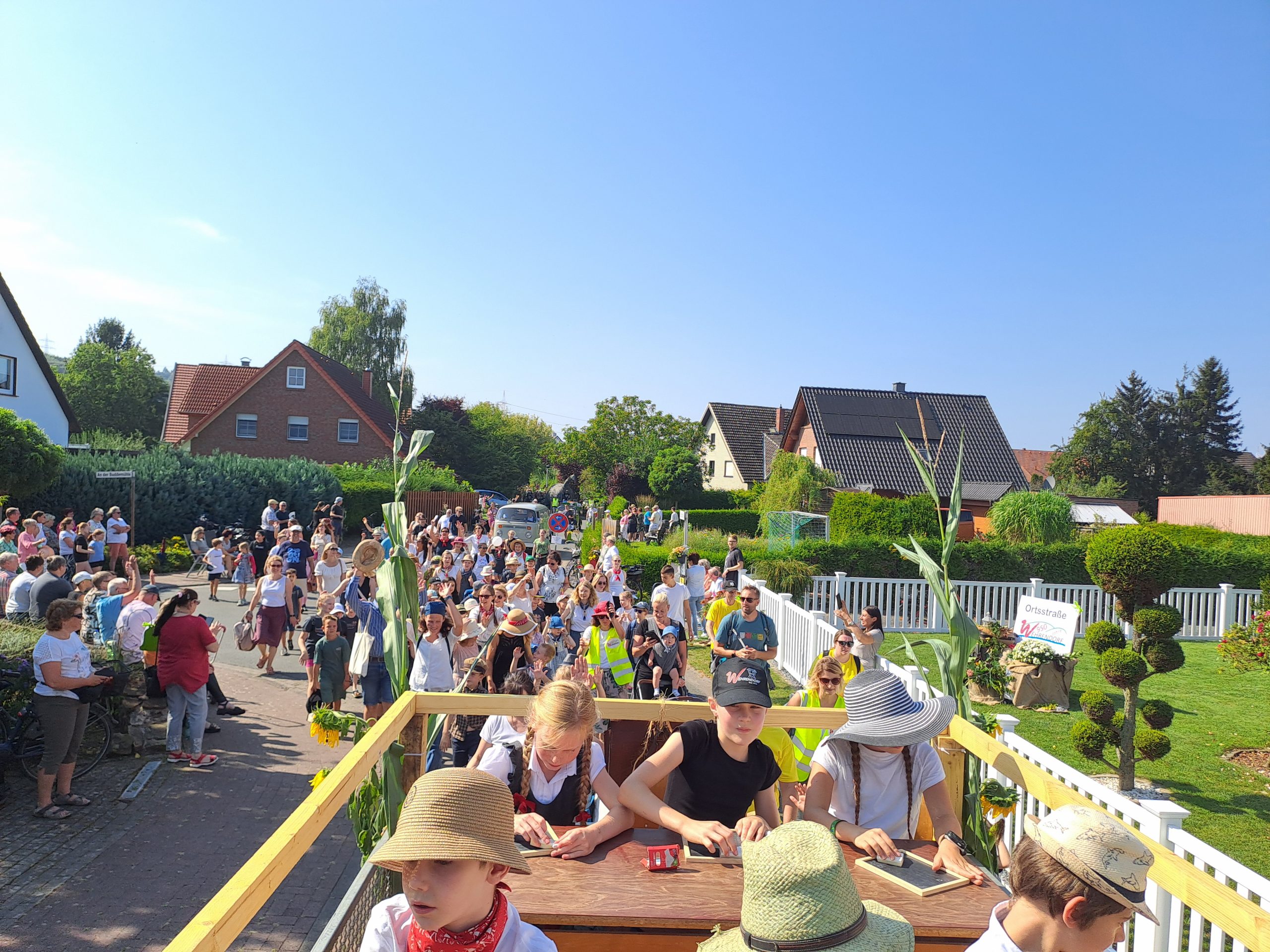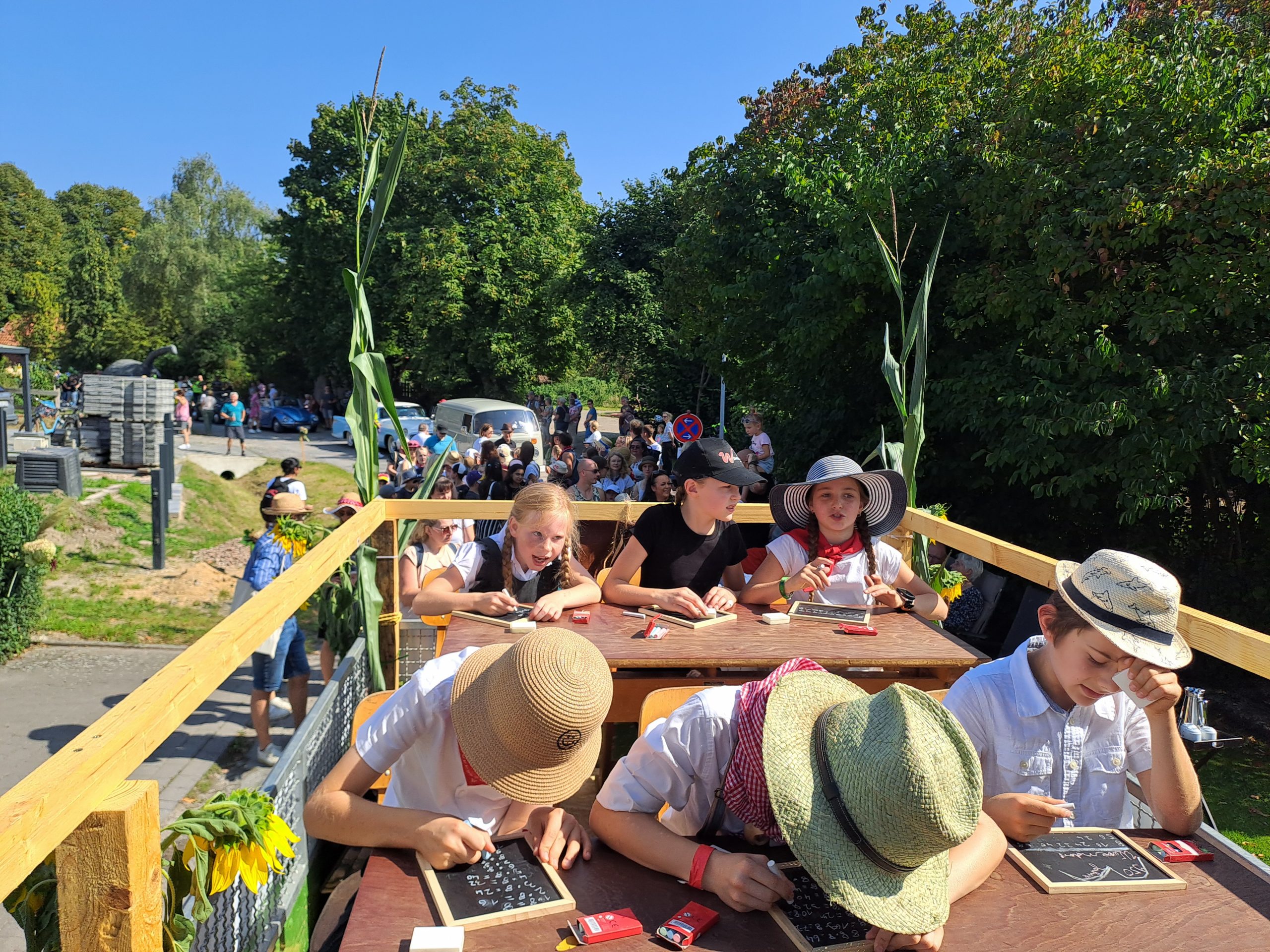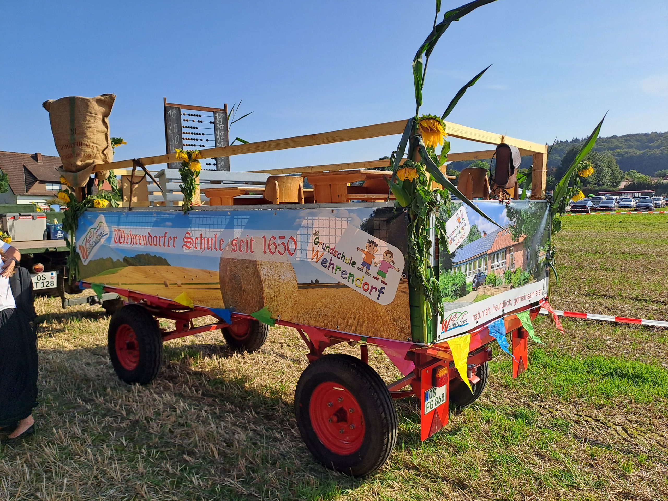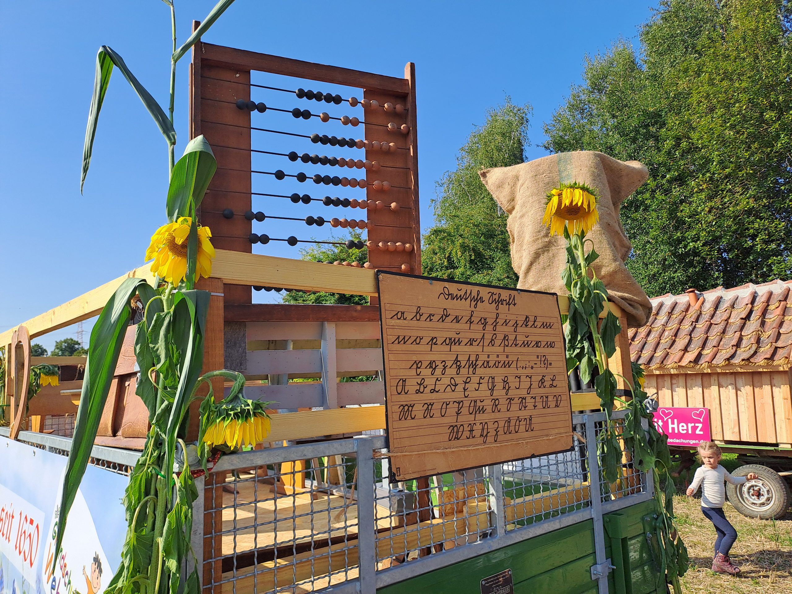 Nachdem am 16.08.2024 von einigen Vätern sowie unserem Hausmeister Achim Tegtmeier mit dem Bau des Festwagens begonnen worden war, wurde am 31.08.2024 fleißig weitergebaut. Den letzten Feinschliff am Wagen in Form von strahlenden Sonnenblumen erledigten einige Mütter direkt am 01.09.2024, damit alle Blumen auch richtig frisch waren.