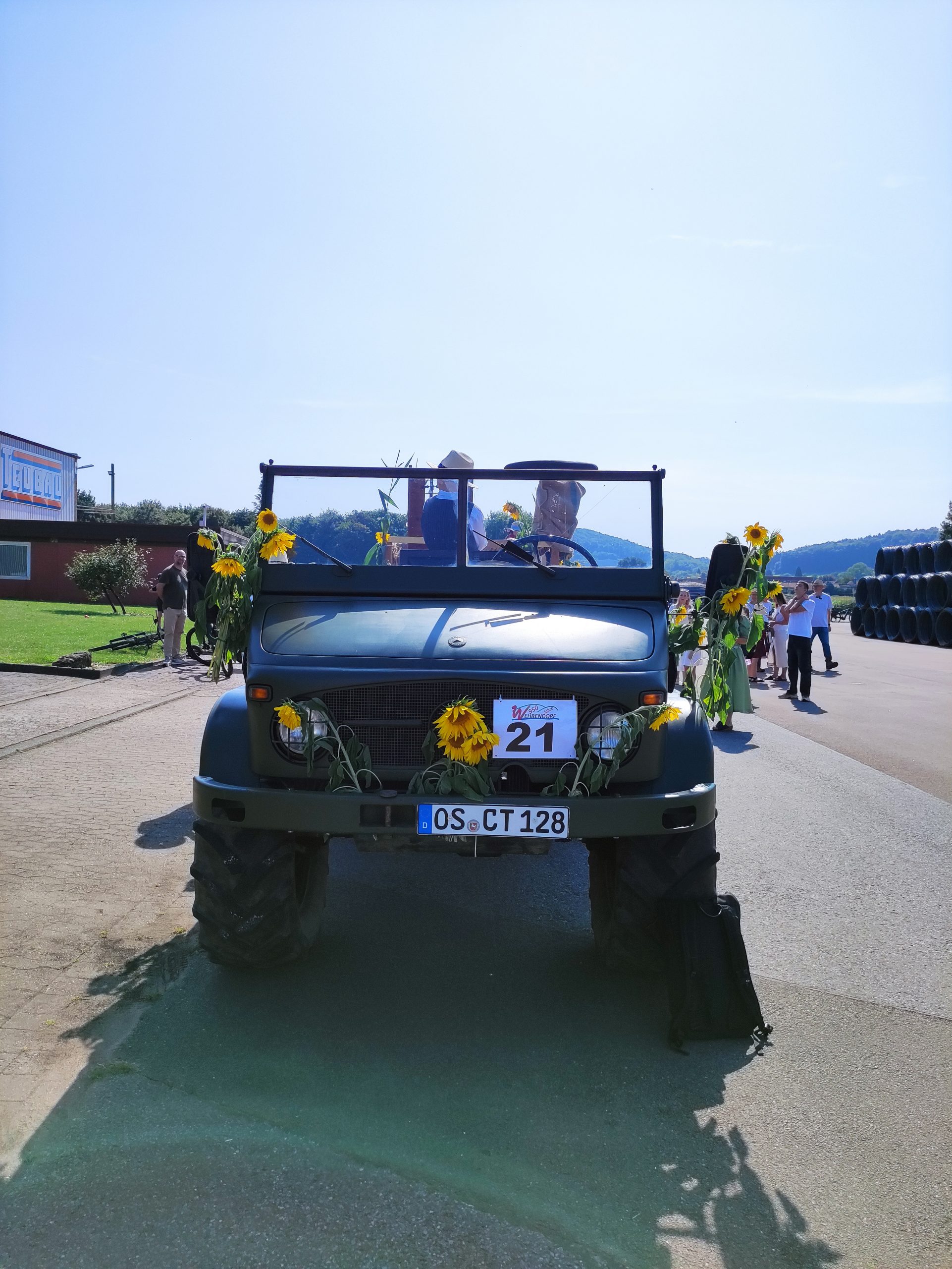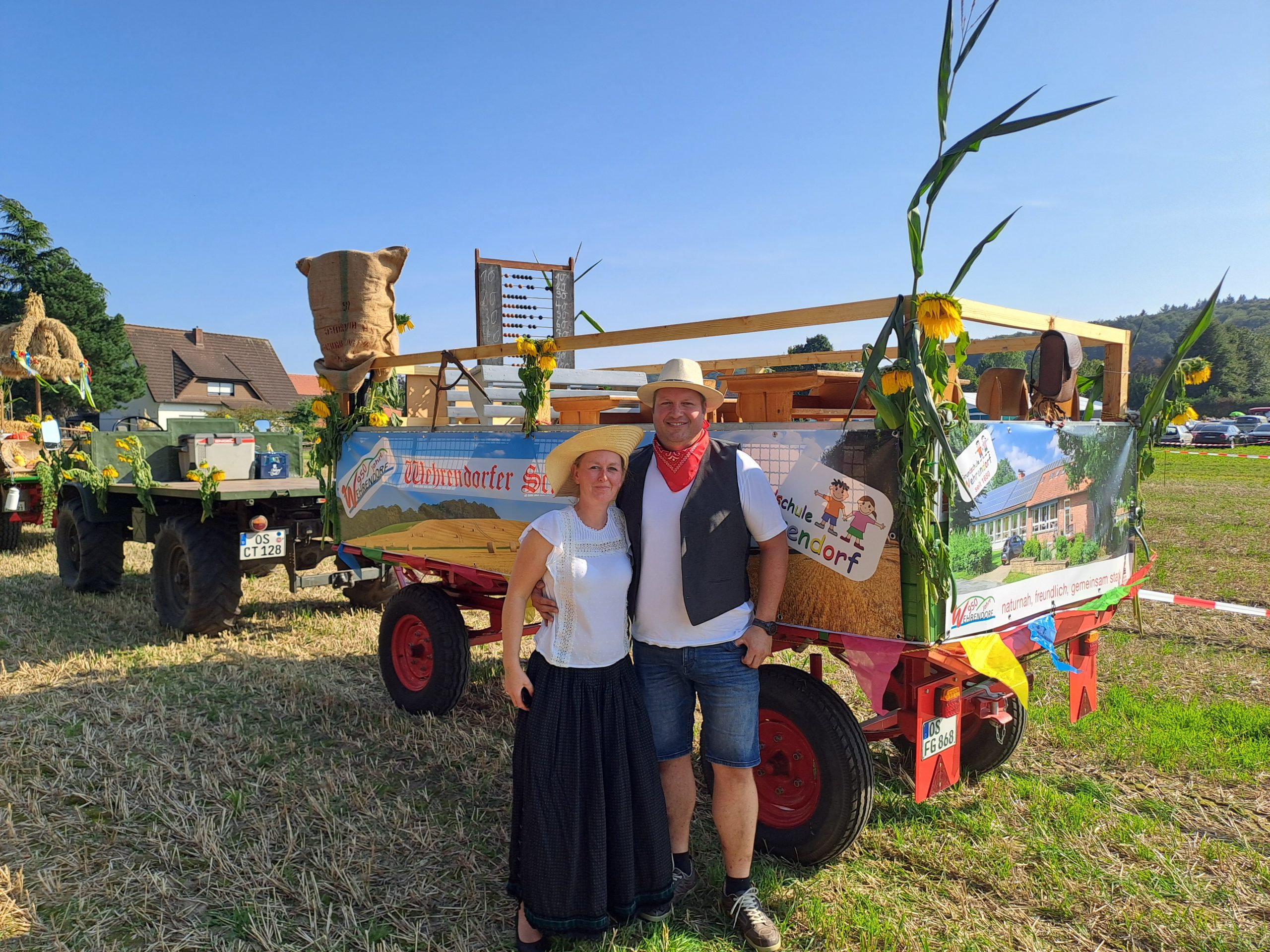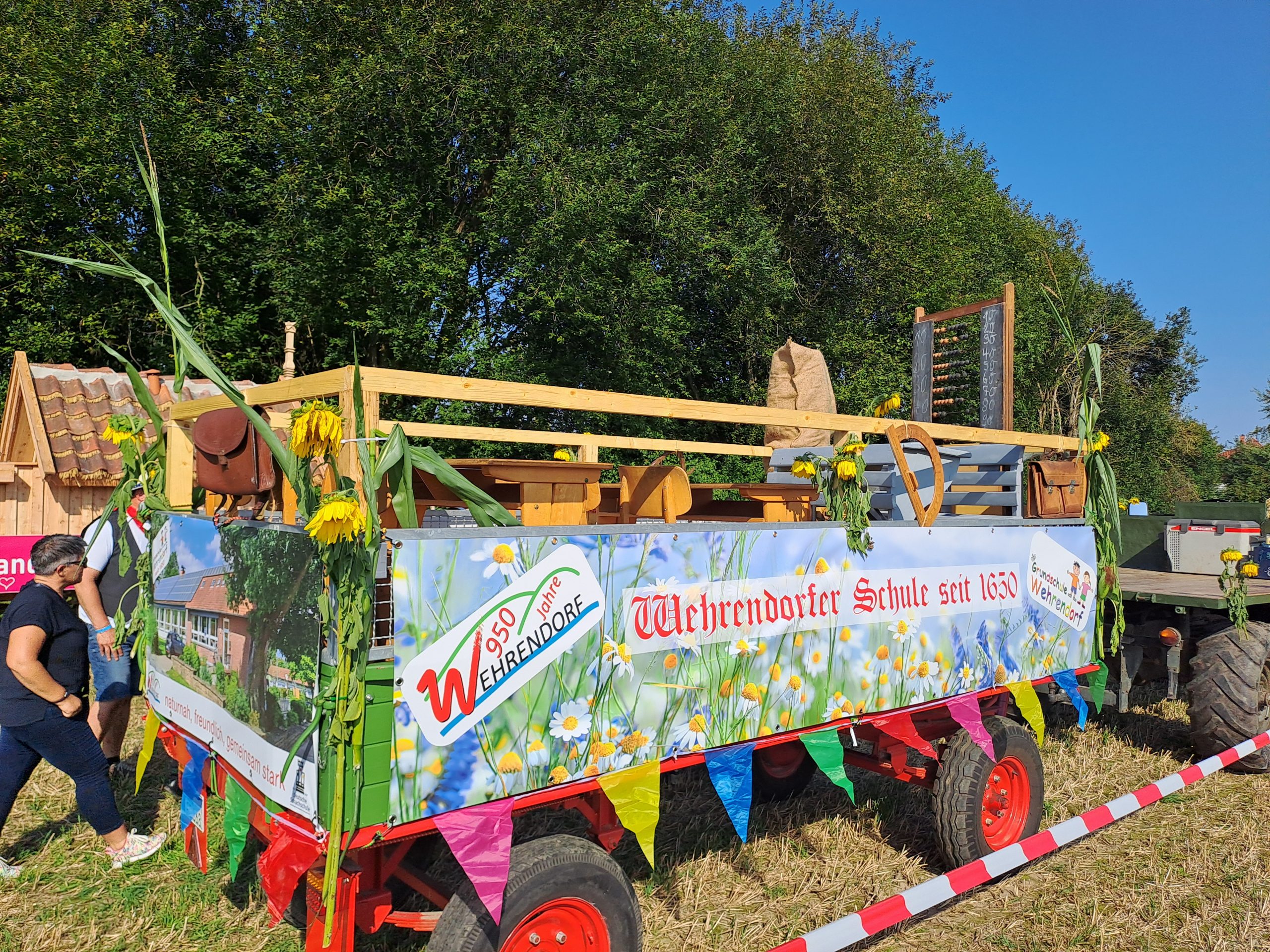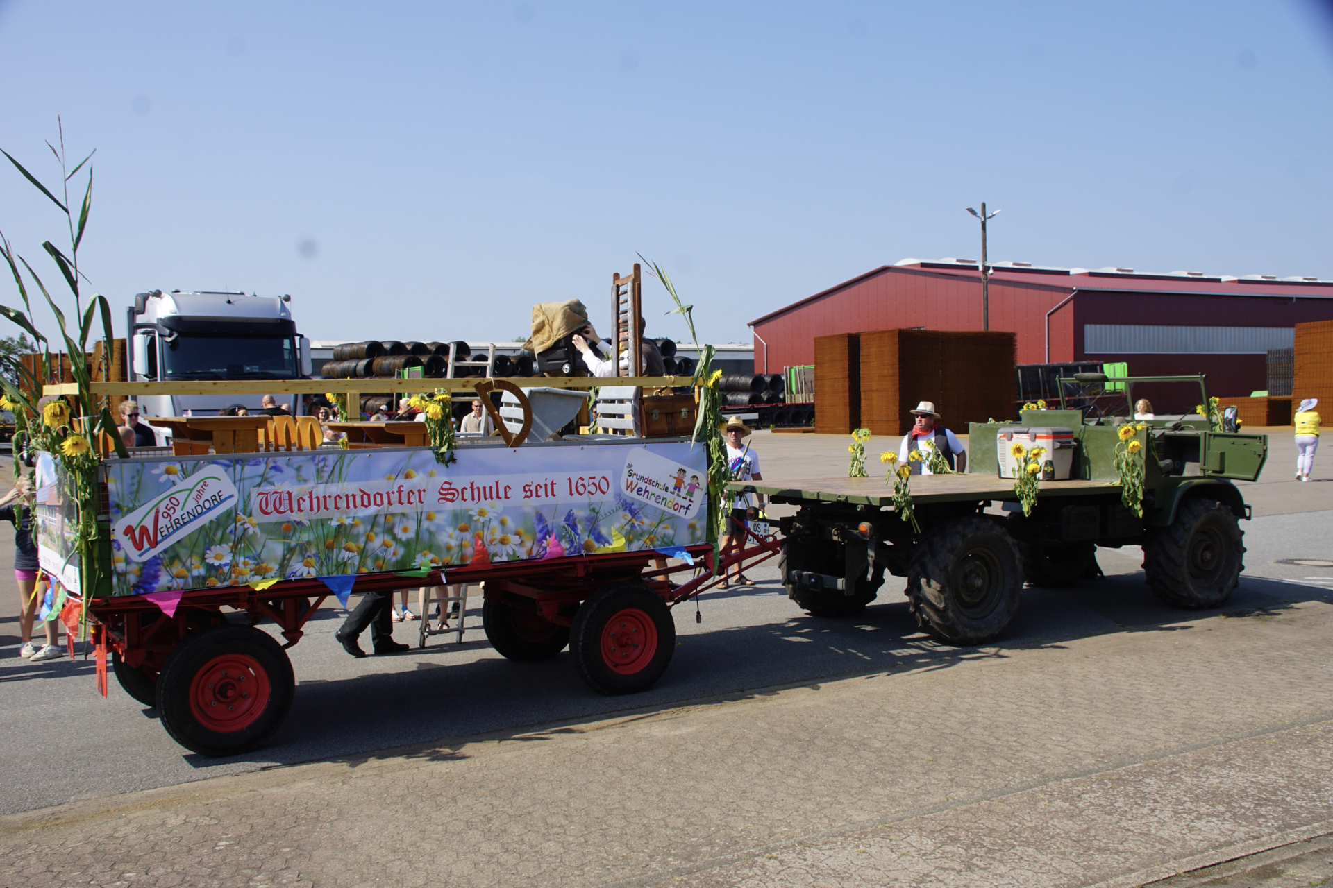 Nachdem am 16.08.2024 von einigen Vätern sowie unserem Hausmeister Achim Tegtmeier mit dem Bau des Festwagens begonnen worden war, wurde am 31.08.2024 fleißig weitergebaut. Den letzten Feinschliff am Wagen in Form von strahlenden Sonnenblumen erledigten einige Mütter direkt am 01.09.2024, damit alle Blumen auch richtig frisch waren.