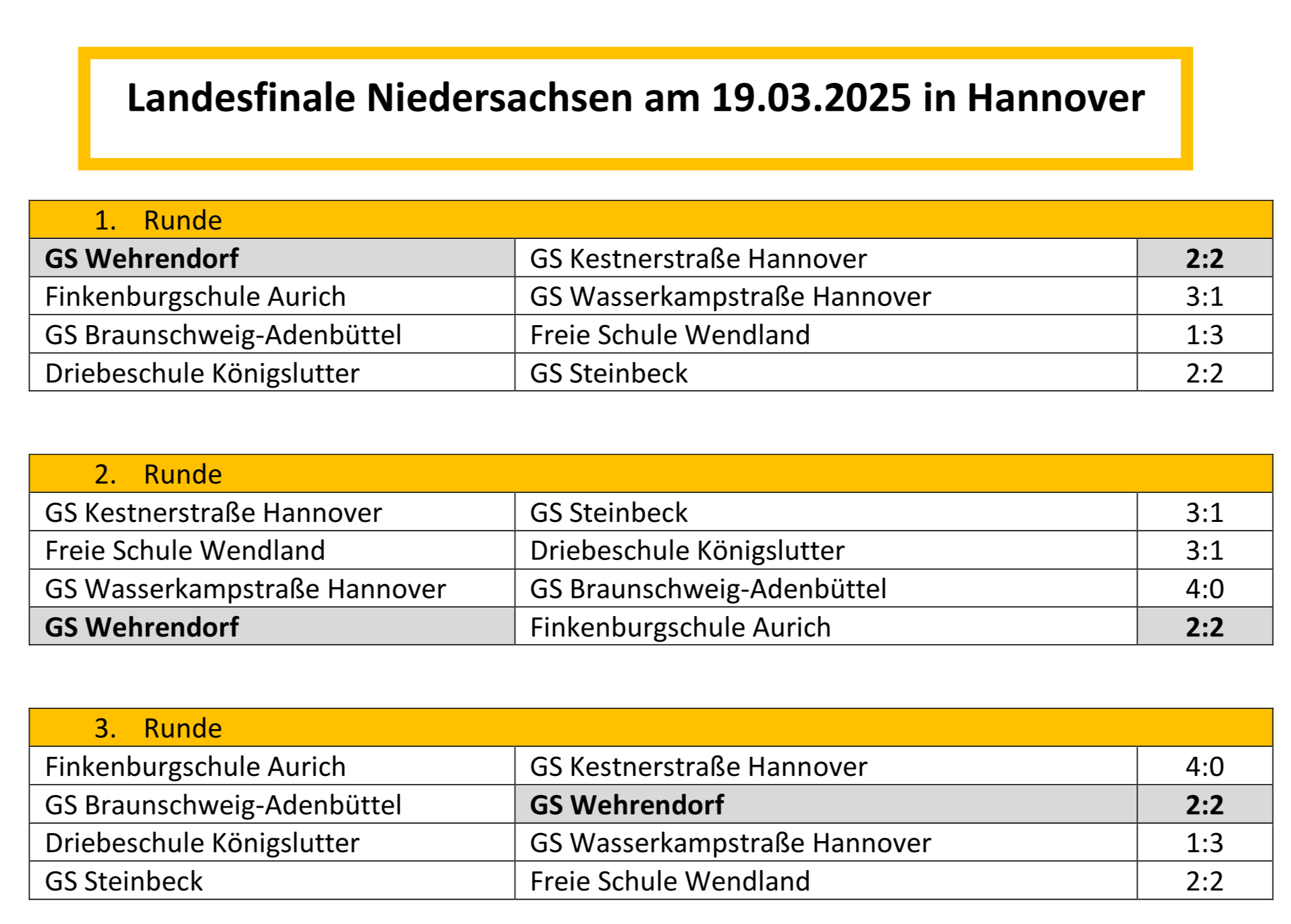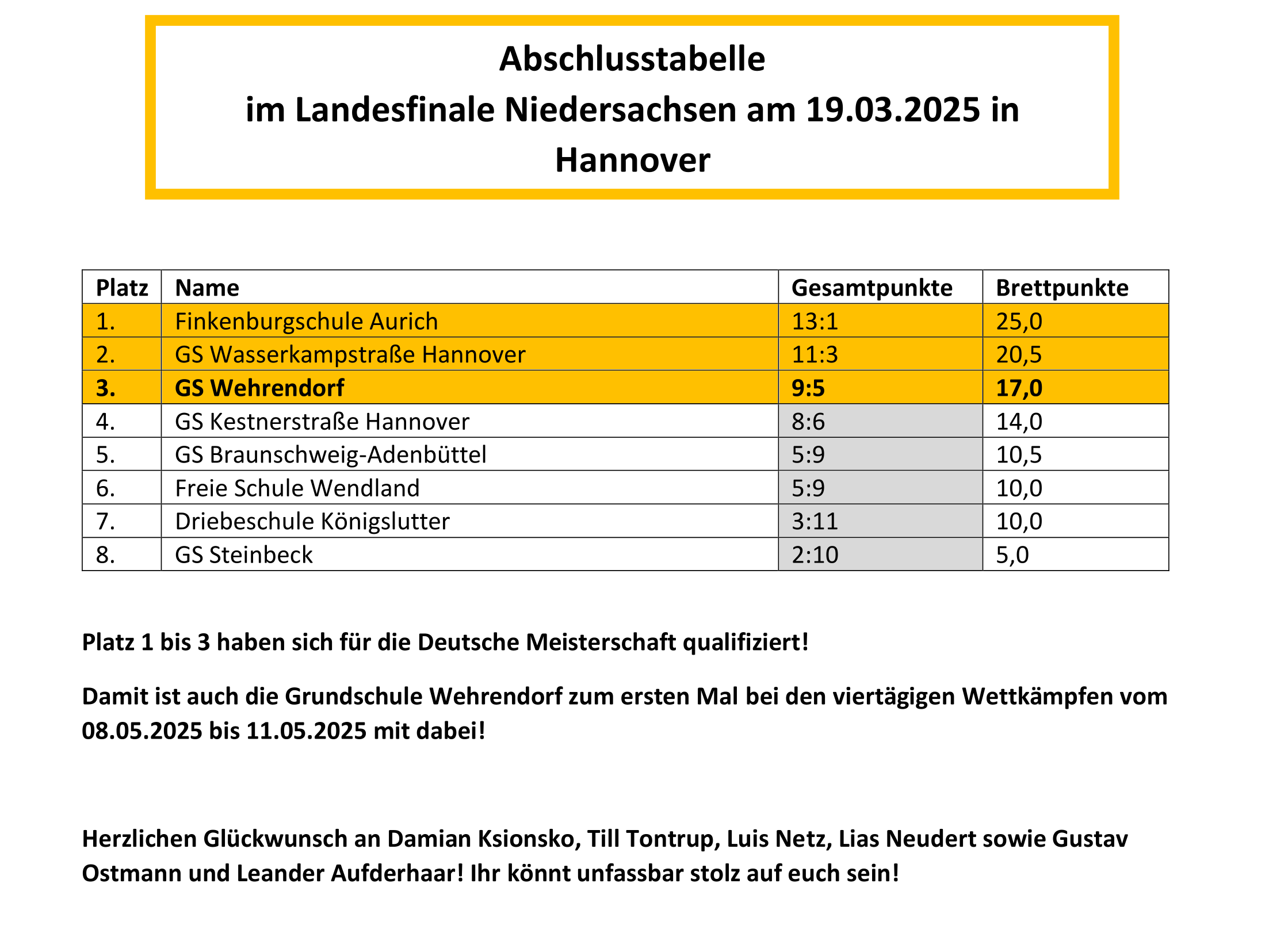 Auch wenn in der letzten Runde das Duell um Platz 2 gegen die bis dahin punktgleiche GS Hannover-Wasserkampstraße (beide jeweils 9:3 Punkte) mit 2,5:1,5 etwas unnötig verloren wurde, sicherten sich die Wehrendorfer hinter Aurich und Hannover die verdiente Bronzemedaille. Eine absolute Top-Leistung gegen starke Gegner! Denn durch den 3. Platz im Landesfinale qualifizierte sich die Grundschule Wehrendorf tatsächlich für die Deutsche Meisterschaft und wird unser Bundesland dann als eine von 3 niedersächsischen Schulen vertreten dürfen! Der maximale Erfolg für die Kinder, die sehr stolz auf sich sein können!