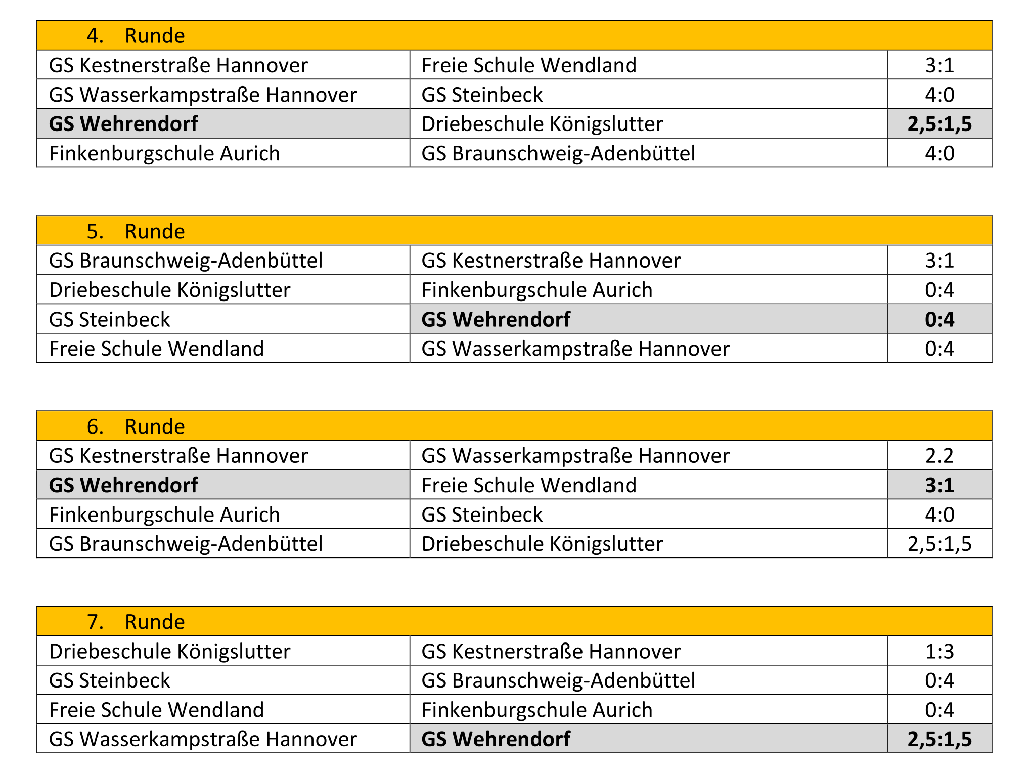 In der ersten Runde spielte unser Team aus Wehrendorf gegen die GS Hannover-Kestnerstraße, die mit dem Verein Hannover Lister Turm zusammenarbeiten. Bereits nach kurzer Zeit sah es in den Partien gut aus und Wehrendorf ging mit 2:0 in Führung. Doch leider ließ sich der Wehrendorfer Spieler an Brett 1, der mit klarem Stellungsvorteil und zudem einem Läufer Vorsprung komplett auf Sieg stand, von einem lautstarken Streitfall am Nachbartisch so stark ablenken, dass er ein zweizügiges Matt übersah. Schade! Diese Niederlage kam sehr unerwartet und war leider völlig unnötig. Doch aus solchen Fehlern kann man für die Zukunft immer auch viel Positives lernen.  Da Hannover an Brett 4 noch einen weiteren Sieg holte, konnte sich das Team aus der Landeshauptstadt dann sogar noch in ein 2:2 gegen Wehrendorf retten.