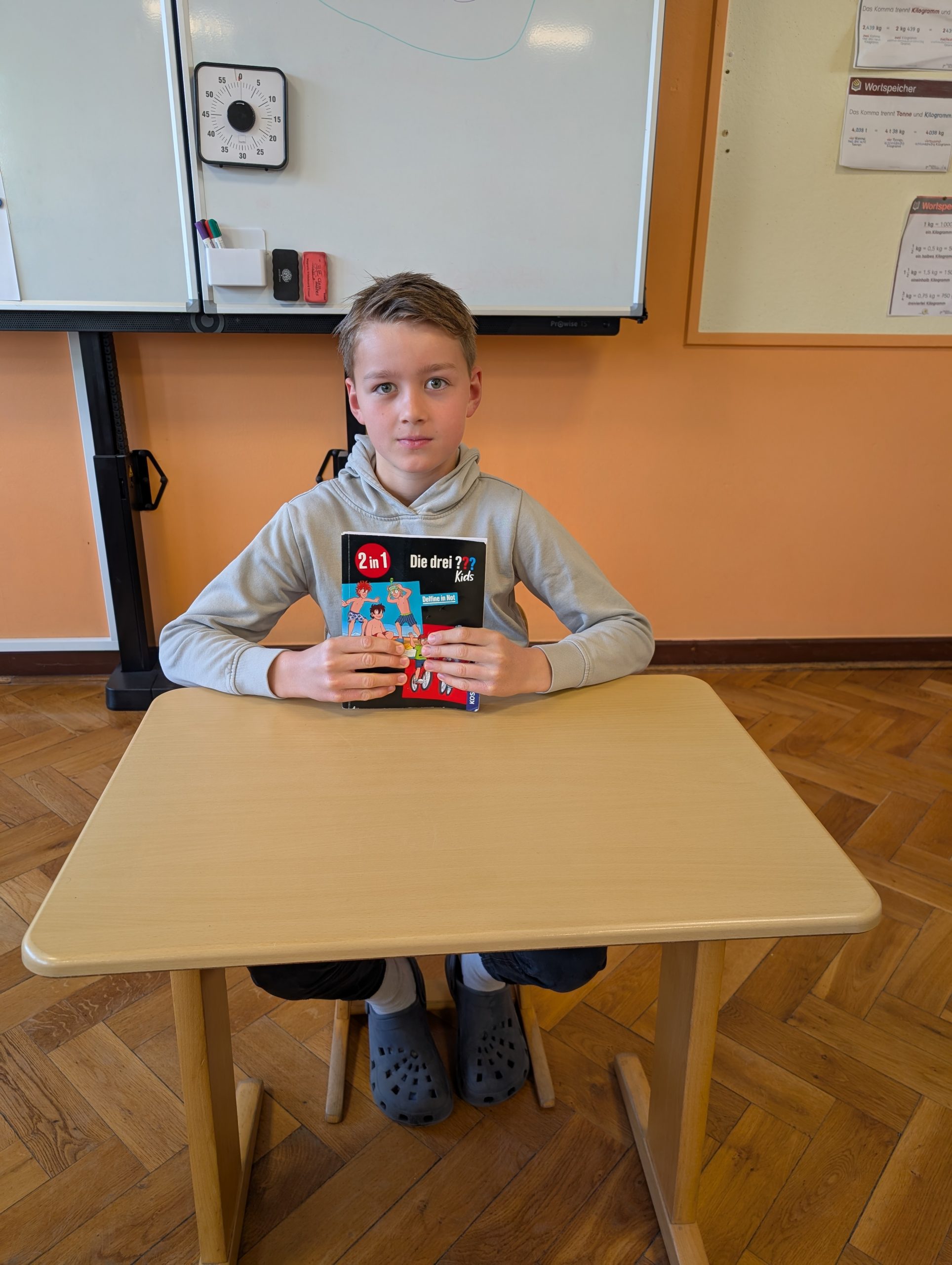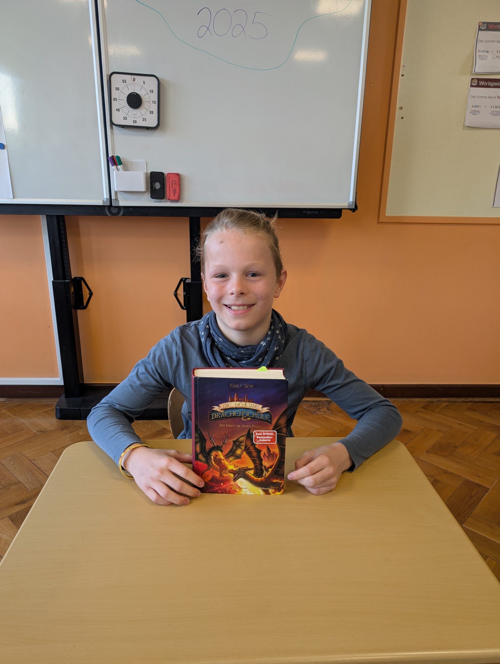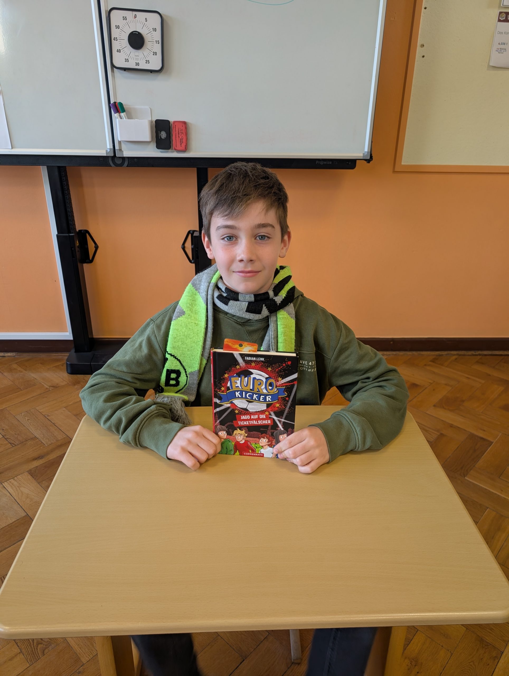 Anschließend wurde es wieder spannend. Aus der Parallelklasse 4b las Gustav Ostmann aus dem Buch „Die Eurokicker- Jagd auf die Ticketfälscher“ vor und konnte damit sofort alle fußballbegeisterten Jungen erfreuen. Als letztes Kind las Luis Netz, der Sieger des letztjährigen Bad Essener Gemeindeentscheides sehr souverän aus dem anspruchsvollen Werk „Die geheime Drachenschule“ vor, das auffällig viele Fremdwörter beinhaltete.