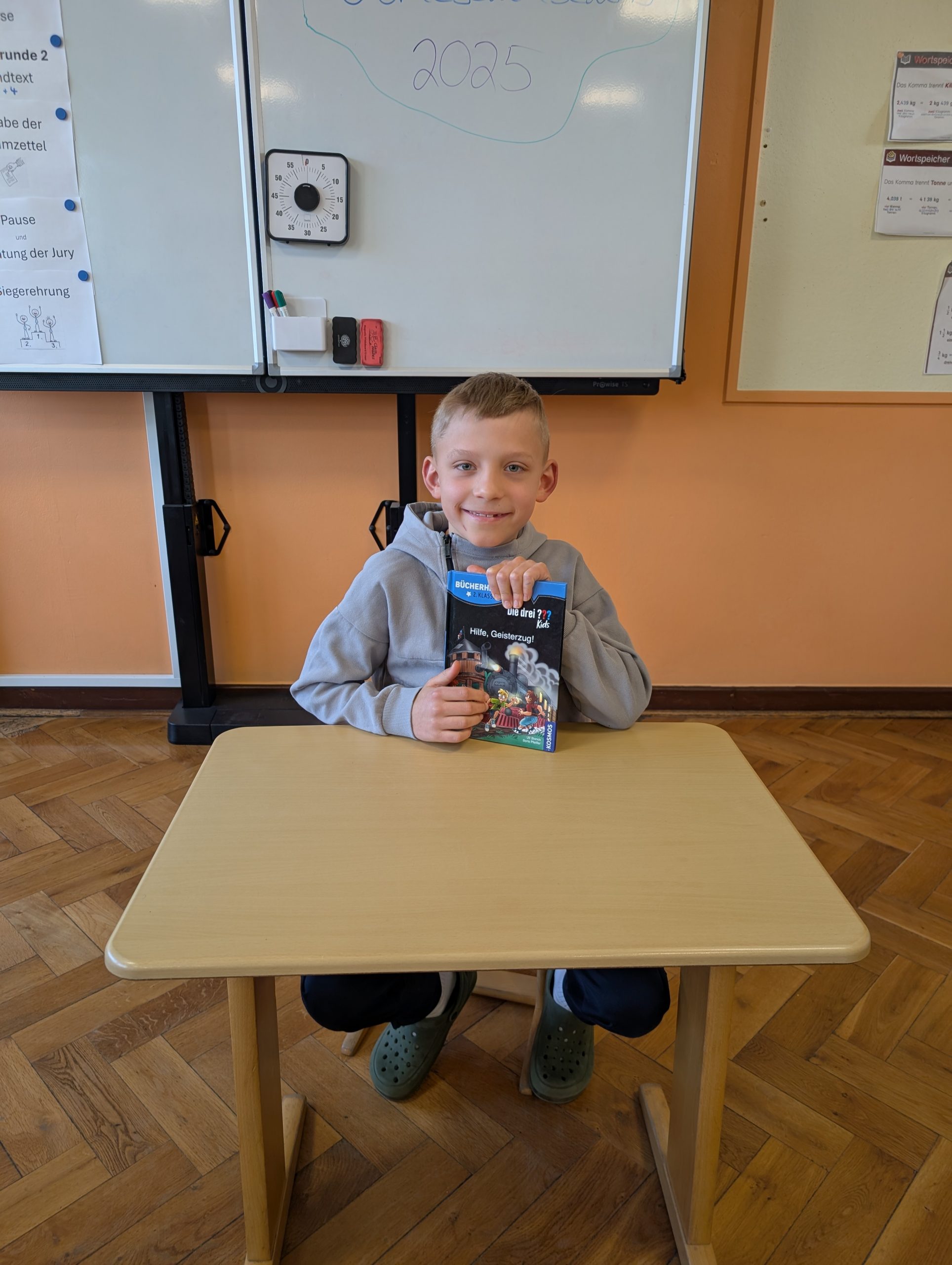Weiter ging es mit den Drittklässlern Leander Aufderhaar und Till Tontrup, die aus den spannenden Kinderbüchern „Hilfe, Geisterzug!“ bzw. „Delfine in Not“ aus der Reihe „Die drei ??? Kids“ vorlasen.