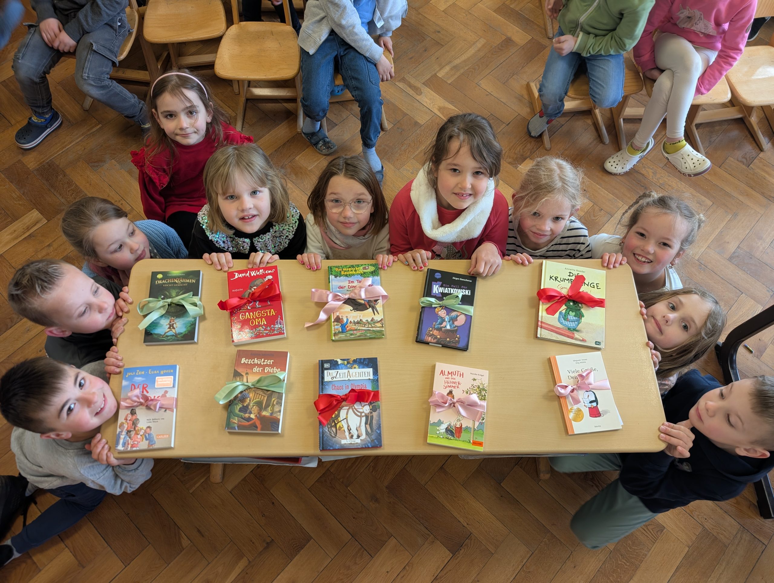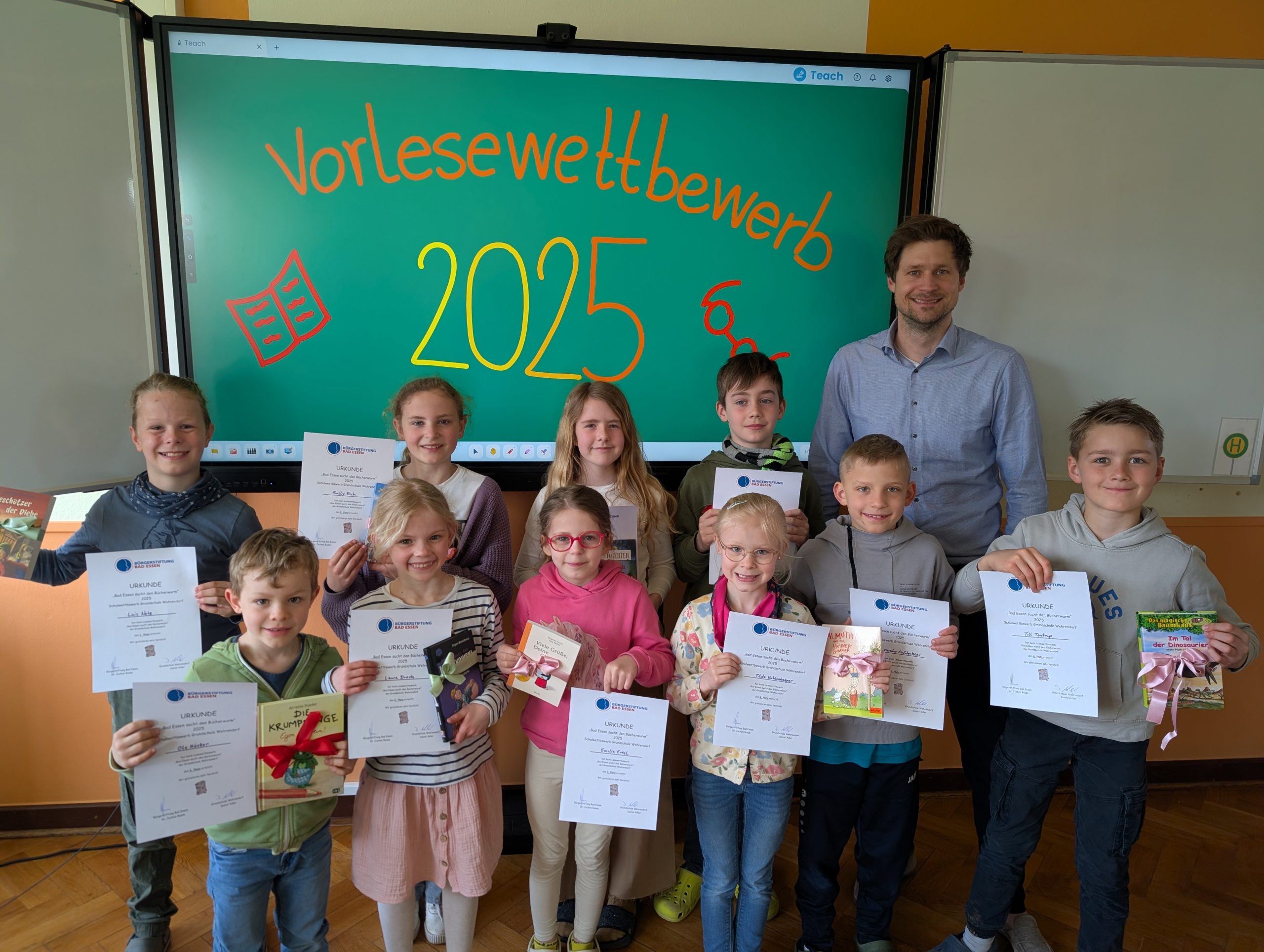 Lesekönig 2025 der Grundschule Wehrendorf wurde wie bereits 2024 Luis Hugo Netz. Platz zwei sicherte sich Emily Rich, dicht gefolgt von Dalia Fafengut. Alle weiteren Lesekinder belegten gemeinsam einen wundervollen 4. Platz, auf den sie ebenfalls sehr stolz sein können! Als Lohn für ihren großartige Lesevortrag erhielten alle Finalisten neben einer Urkunde ein schönes Kinderbuch geschenkt, das von der Bürgerstiftung Bad Essen gesponsert wurde. Ein herzliches Dankeschön an Jochen Busse für die Preise!