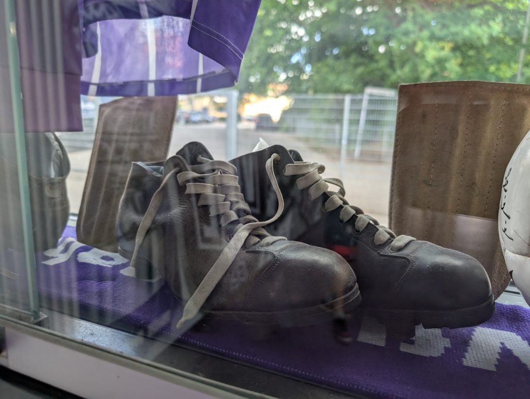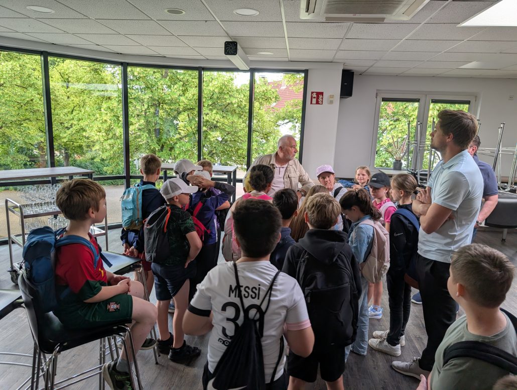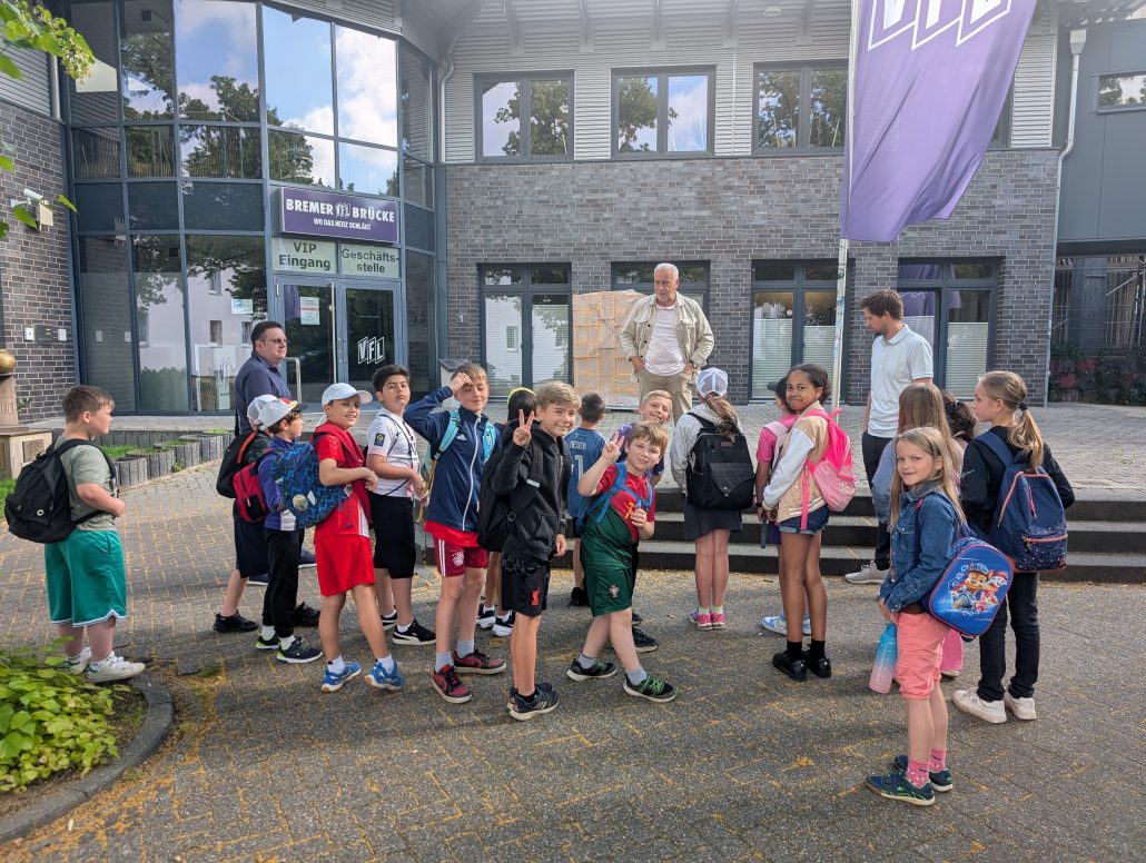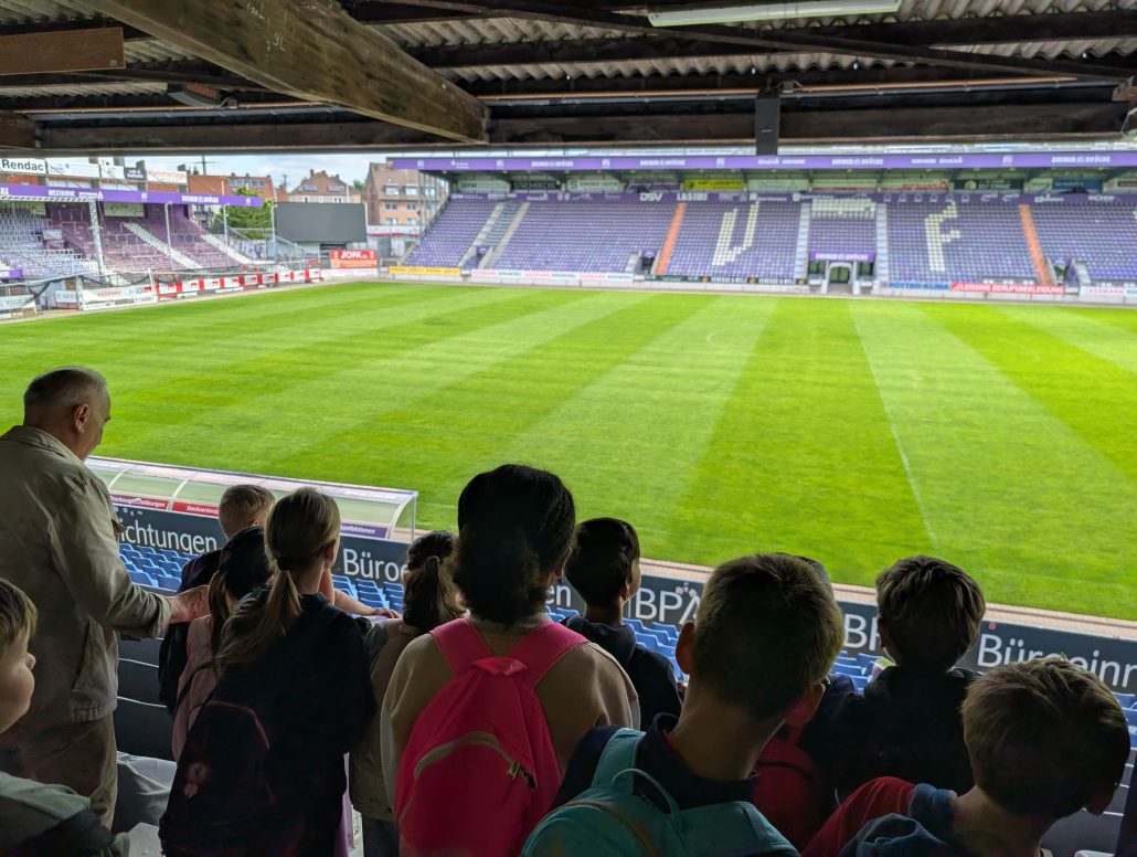 Dann wurde gemeinsam der Bus bestiegen und es ging los zur sogenannten „Bremer Brücker“. Denn das Stadion hat seit einiger Zeit seinen ursprünglichen Namen zurückerhalten, nachdem es zuletzt „Osnatel-Arena“ geheißen hatte. Dort angekommen gab es einen kleinen Rundgang um das Stadion und man traf sich vor der Geschäftsstelle, wo die lila-weißen Fahnen im Wind wehten. Hier begann Peter Scharmacher mit seiner Führung und erzählte den Kindern viele interessante Details über den VfL. Den Kindern war ihr Interesse sichtlich anzumerken, denn es wurden sehr viele Fragen gestellt.
