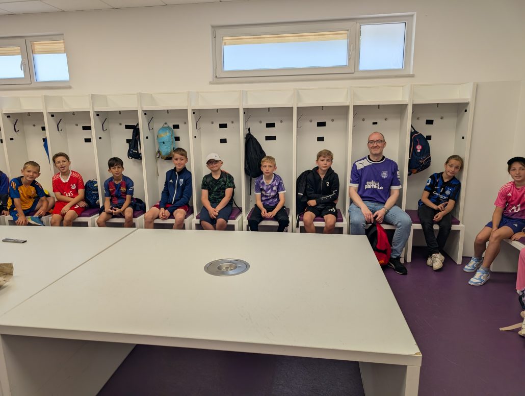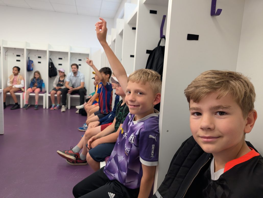 Anschließend wurden die VIP-Räume besichtigt, die Tribünen, der Stadioninnenraum, die Trainerbänke und weitere Bereiche. Während des Besuchs der Umkleidekabinen kam netterweise sogar noch Joe Enochs vorbei und richtete einen Gruß an die Kinder. Fußballfan Leander hatte die VfL-Legende gleich erkannt! Auch die Duschräume und die Massagebänke des VfL durften die Kinder besichtigen. Und dann gab es noch einen echten Höhepunkt: Ein geheimnisvoller Spieler tauchte kurzzeitig auf. Peter SCharrmacher erklärte, dass es sich um eine Neuverpflichtung des VfL handelte. Da war die Neugier der Kinder natürlich geweckt: „Oh, wer ist das? Ist der bekannt? Welche Position spielt der denn?“ Doch zum damaligen Zeitpunkt war noch alles streng geheim und es wurde auf die Pressekonferenz um 14:00 Uhr verwiesen. Und so endete der Ausflug zum Stadion mit einem geheimsivollen Rätsel.