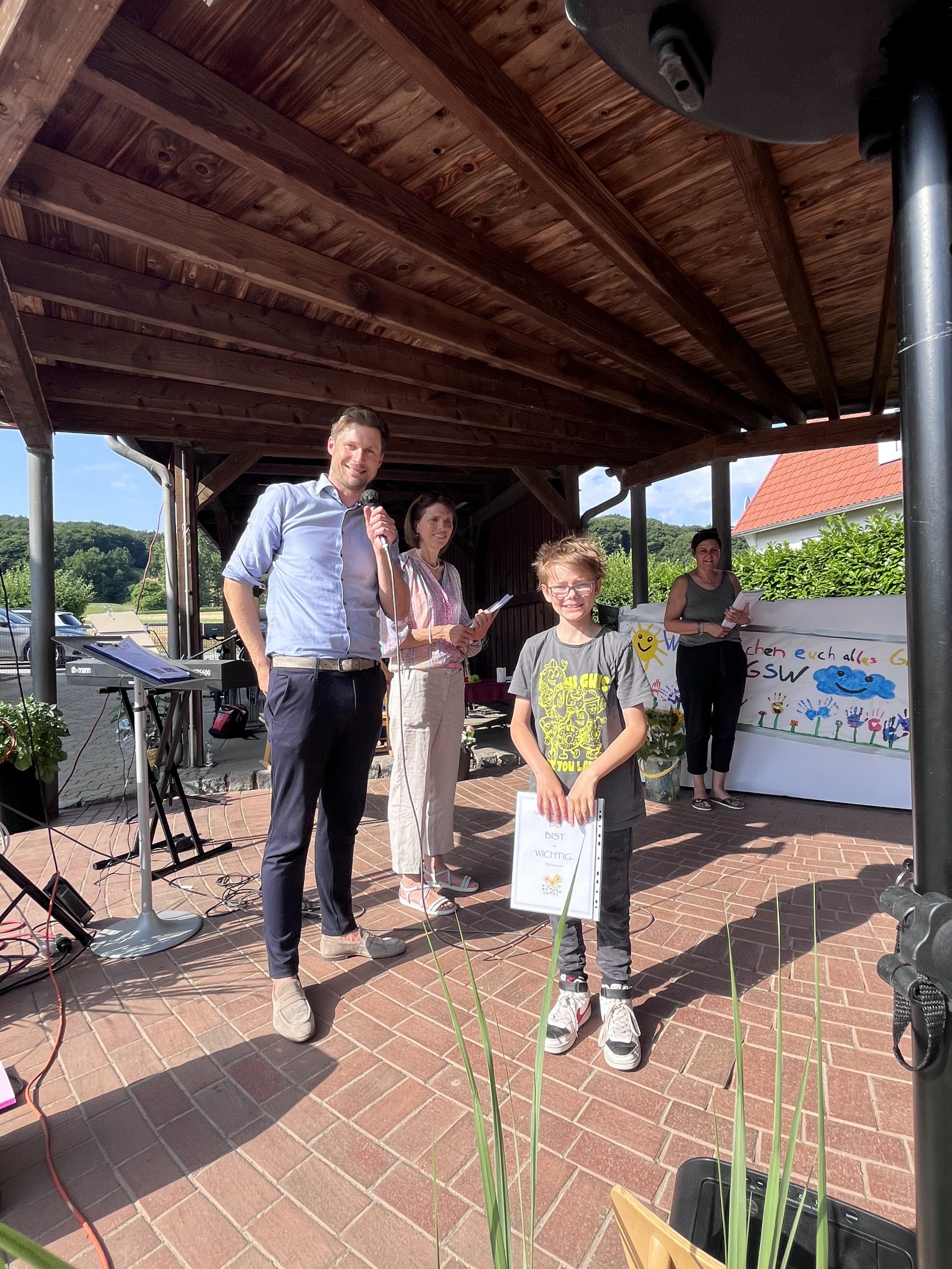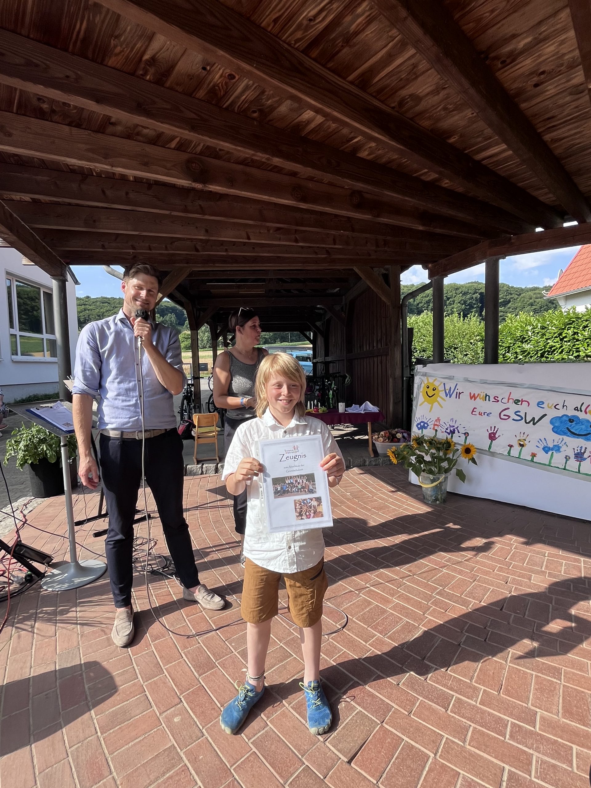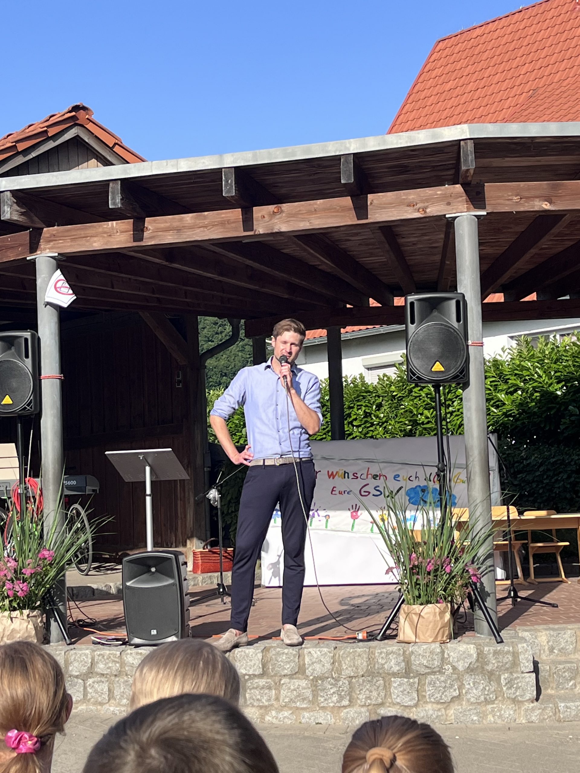 Danach ging es weiter mit der Ansprache des Schulleiters Stefan Hammerlage. In seiner Rede ging er dabei auf das derzeitige Kartoffelprojekt ein, denn alle Kinder der GSW hätten aktiv zur Bestellung des Kartoffelackers der Schule beigetragen. Bezogen auf die scheidenden Viertklässler betonte er, dass diese zum Zeitpunkt ihrer Einschulung wie Saatkartoffeln gewesen seien. Es habe sehr viel Potential in ihnen allen gesteckt, das sie nun nach vier Jahren voll entwickelt haben. Jede einzelne Person habe das Beste aus sich heraus geholt. Darauf können sie alle sehr stolz sein!