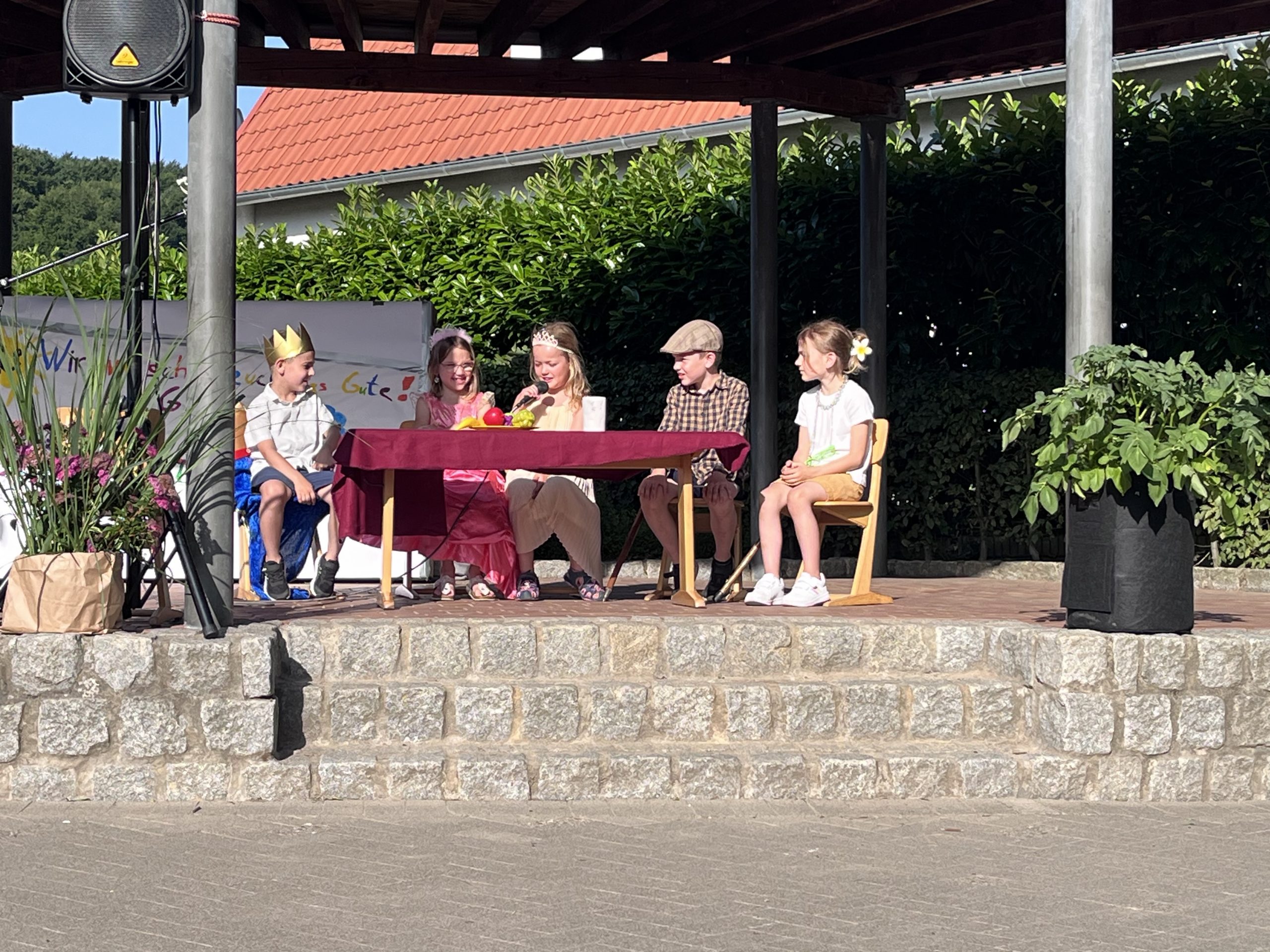 Anschließend folgte ein kleiner Rückblick auf die ersten Tage in der Schule mit dem Theaterstück „Eine königliche Einschulung“. Hier zeigte die Klasse 1 von Lena Balster, wie gut sie bereits Texte auswendig lernen kann. Besonders überzeugend dabei war Juna Tietz als Prinzessin, die vom Sinn des Lesenlernens überzeugt wurde. Schließlich ist das viel besser und spannender als nur einen königlichen Vorleser zu haben.
