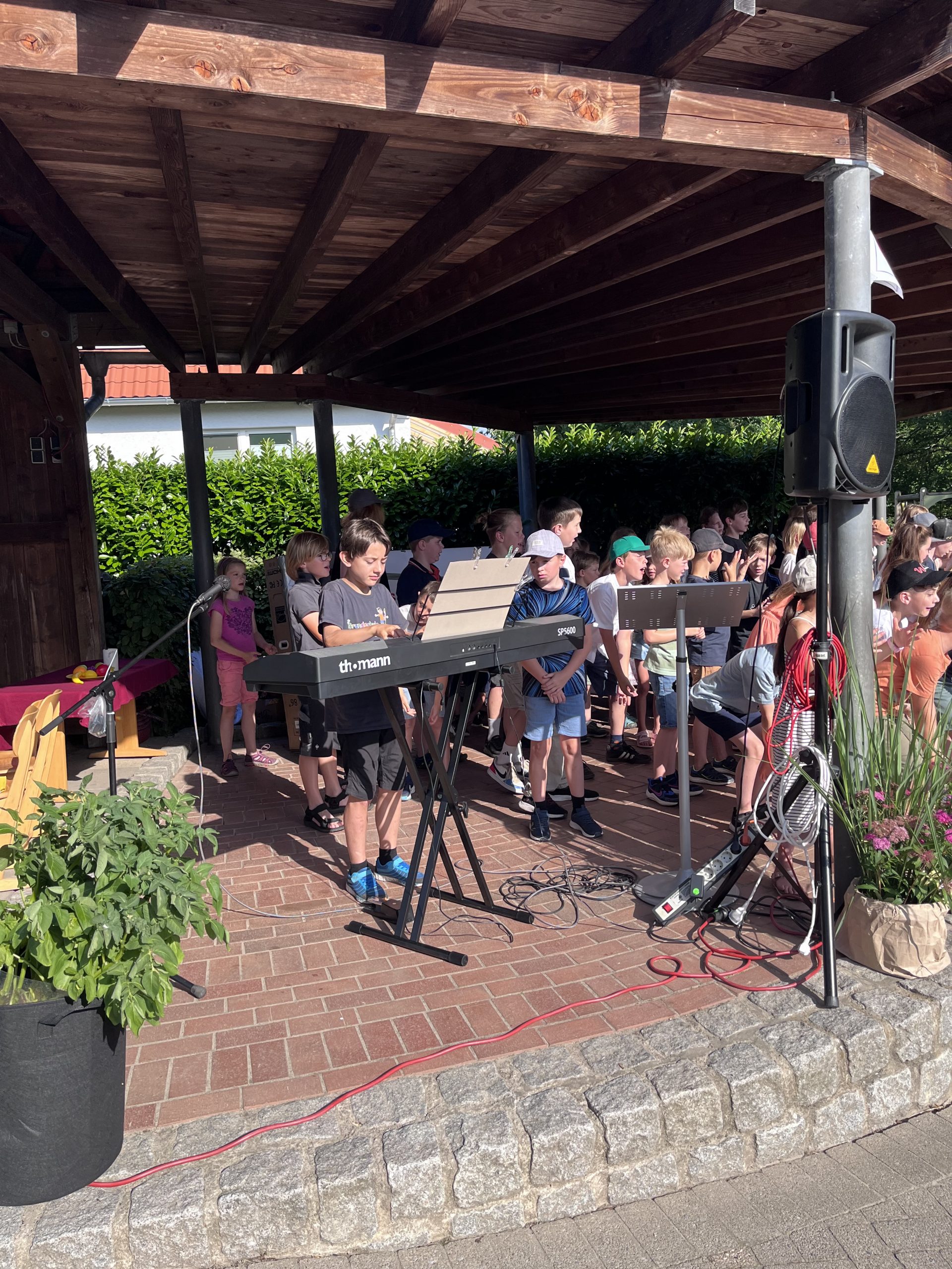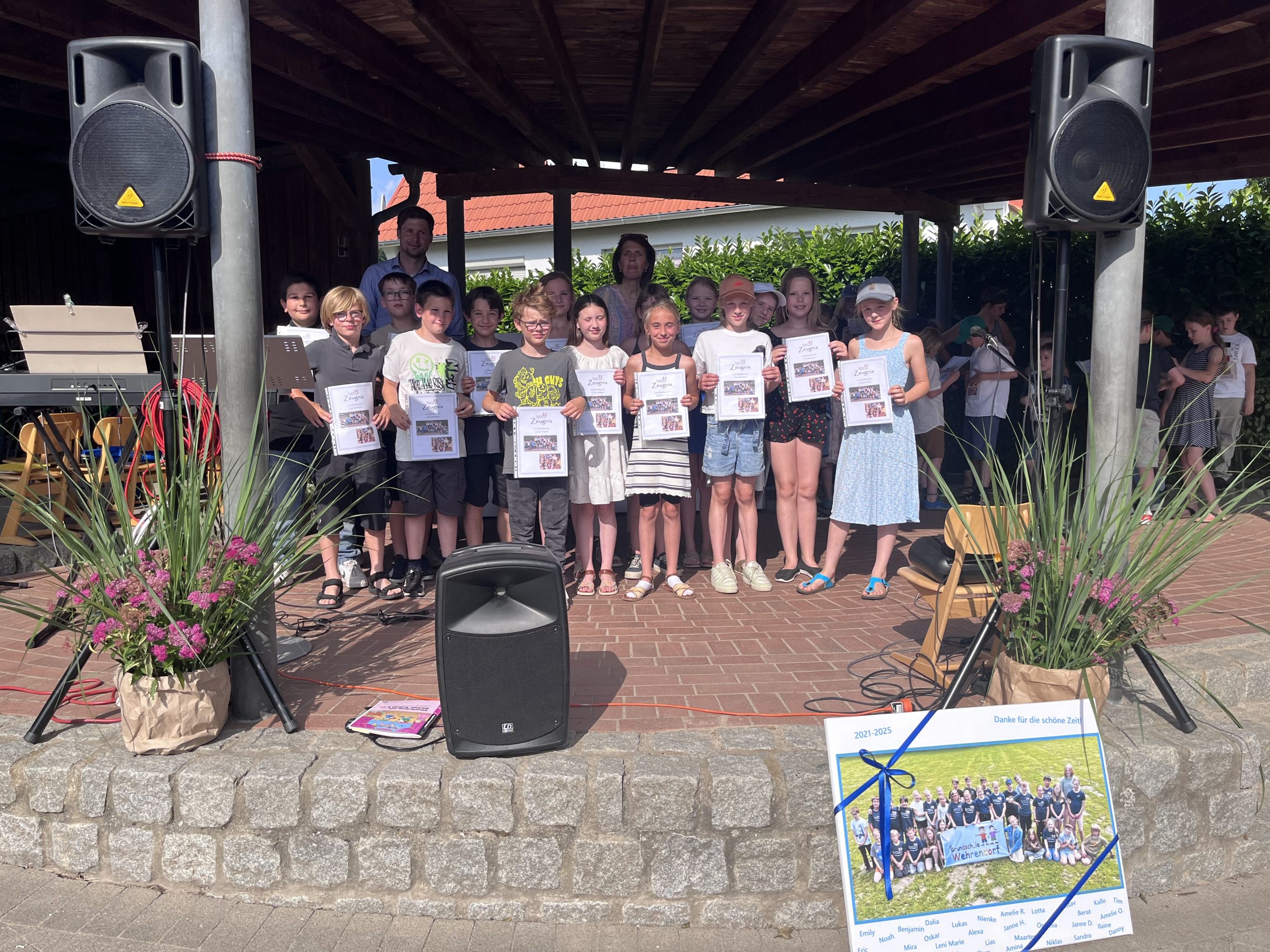 Auch die Klassen 4a und 4b wollten sich nun von der Schulgemeinschaft verabschieden und stimmten das bekannte „Ein Hoch auf uns“ in einer leicht abgewandelten Wehrendorfer Version an. Den Schülern konnte man die Freude, sich selbst noch einmal richtig feiern zu dürfen, dabei spürbar anmerken. Auch hier war Lias Neudert aus der Klasse 4a natürlich wieder am Keyboard im Einsatz.