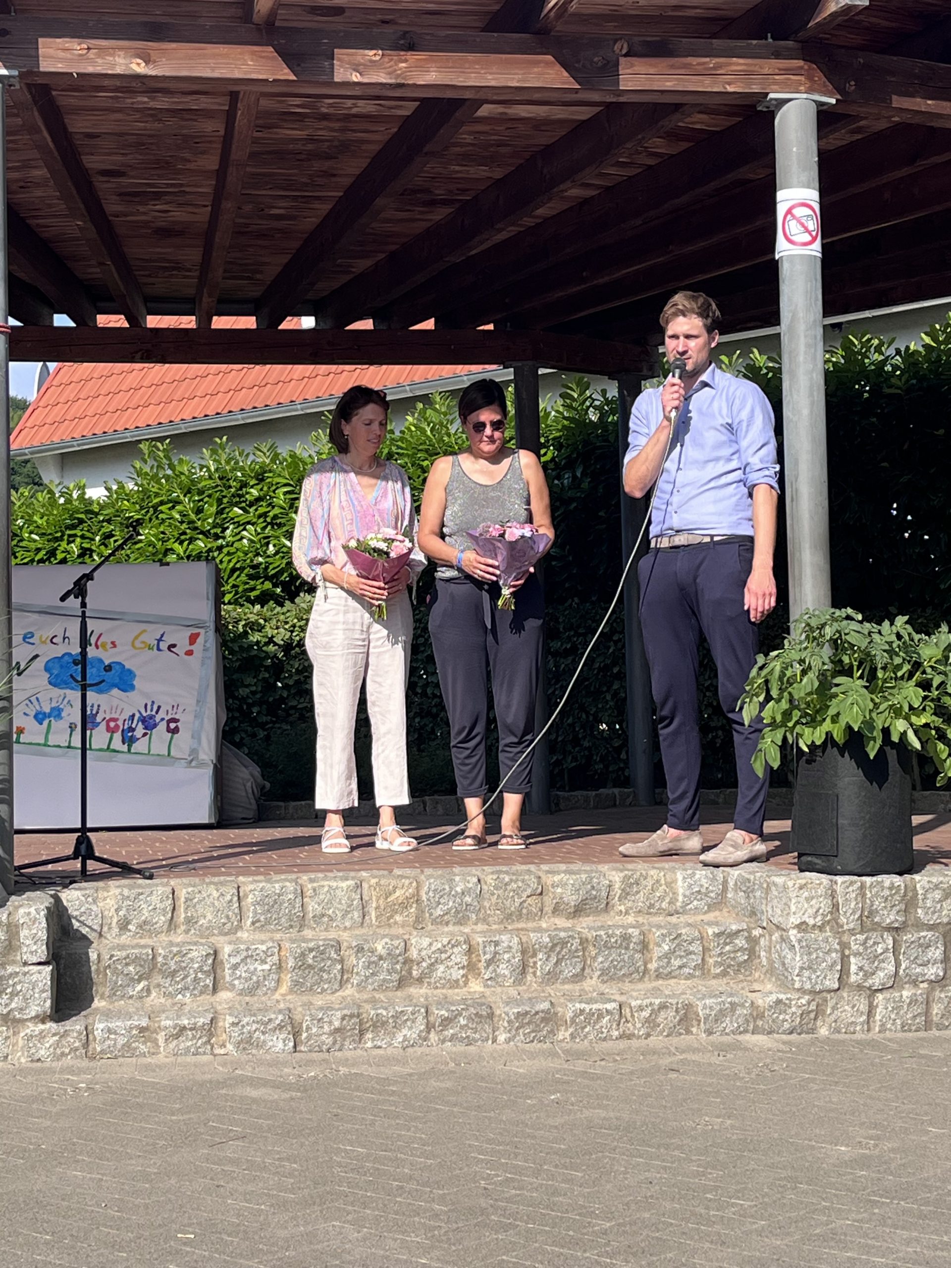 Danach wendete sich Stefan Hammerlage erneut an das Publikum. Er dankte den beiden Klassenlehrerinnen Wenke Busse und Caren Fehrmann mit einem schönen Blumenstrauß für ihr Engagement in den letzten 4 Jahren. Sie hätten die Viertklässler gut vorbereitet und den Kindern auch Spaß am Lernen vermittelt. Auch den übrigen Lehrkräften des Kollegiums dankte er für ihre hervorragende Arbeit. Hierdurch sei eine gute Grundlage für den zukünftigen Erfolg an den weiterführenden Schulen gelegt worden. Für Wehrendorf sei es zudem etwas Besonderes gewesen, dass es in diesem Jahr sogar zwei Klassen seien, die nun verabschiedet werden würden.