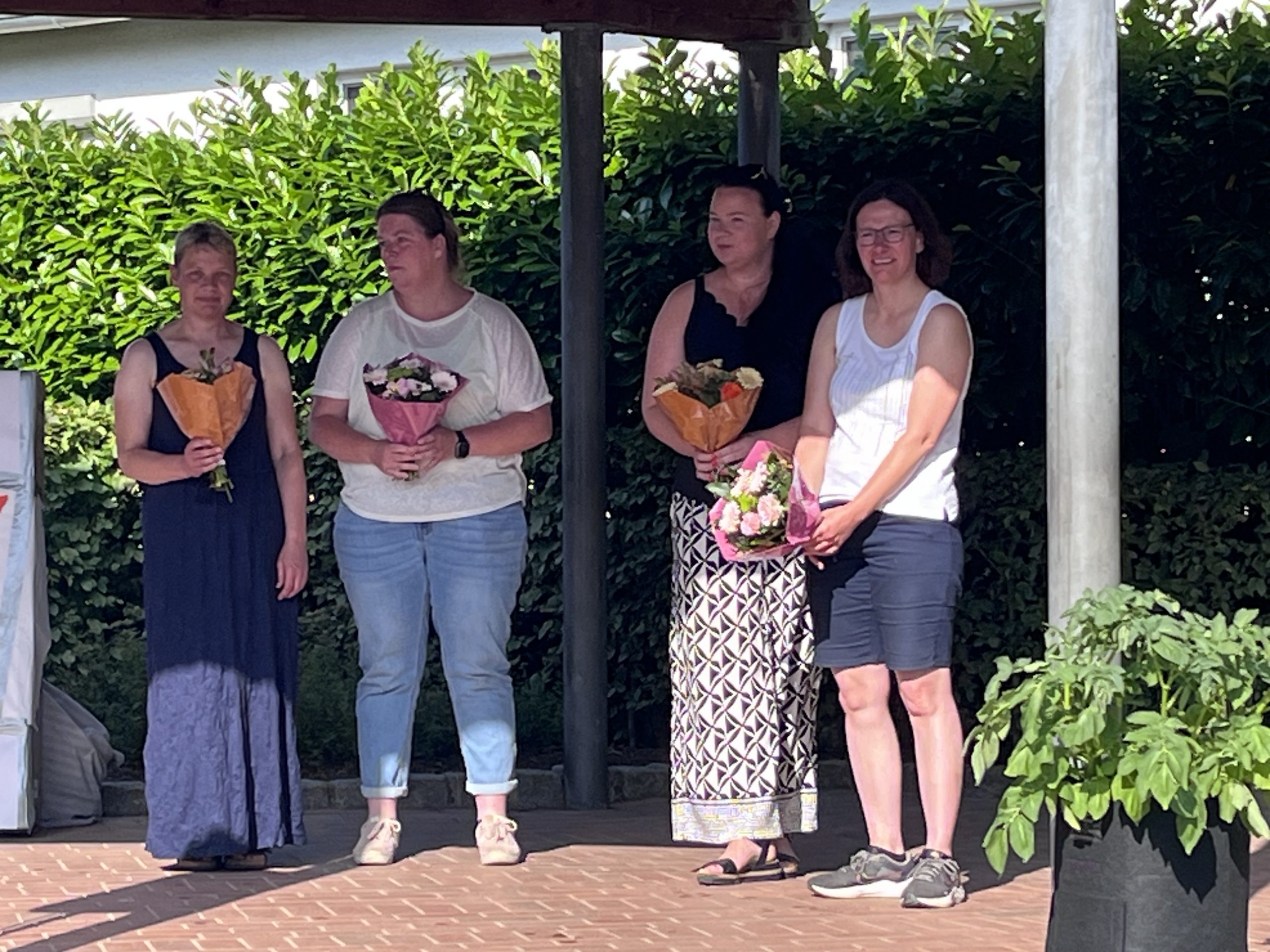 Darüber hinaus dankte er auch den Elternvertreterinnen Astrid Meyer, Ulrike Kunter, Peggy Schmidt sowie vor allem auch der langjährigen Schulelternratsvorsitzenden Claudia Höckmann. Die stets gute und vertrauensvolle Zusammenarbeit mit den Eltern sei ihm als neuem Schulleiter sofort aufgefallen und stelle eine wichtige Basis für gute Schule dar. Auch den Vertreterinnen bei den Klassenkonferenzen – Stefanie Riefenstein, Dominika Olesinski, Sandra Netz und Alexandra Ostmann – dankte er herzlich für ihre Unterstützung. Abschließend gab es als Anerkennung noch Blumen für alle Beteiligten.