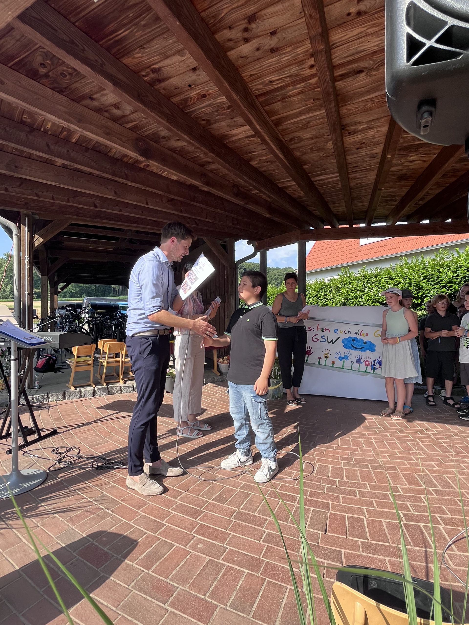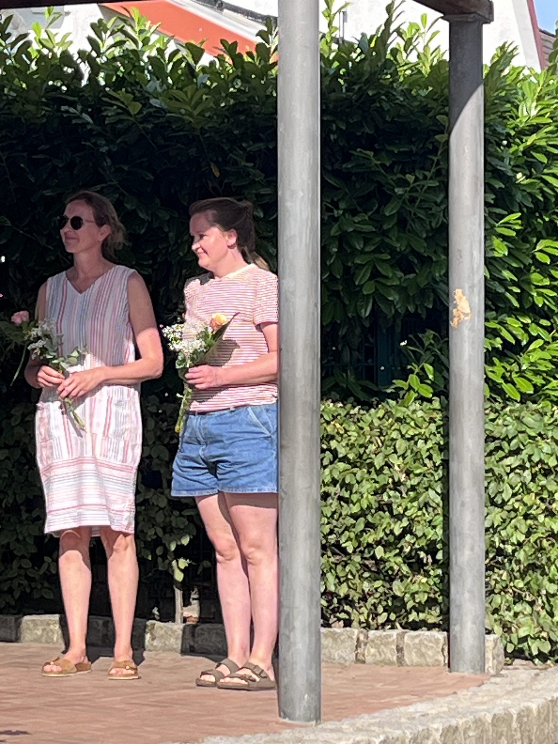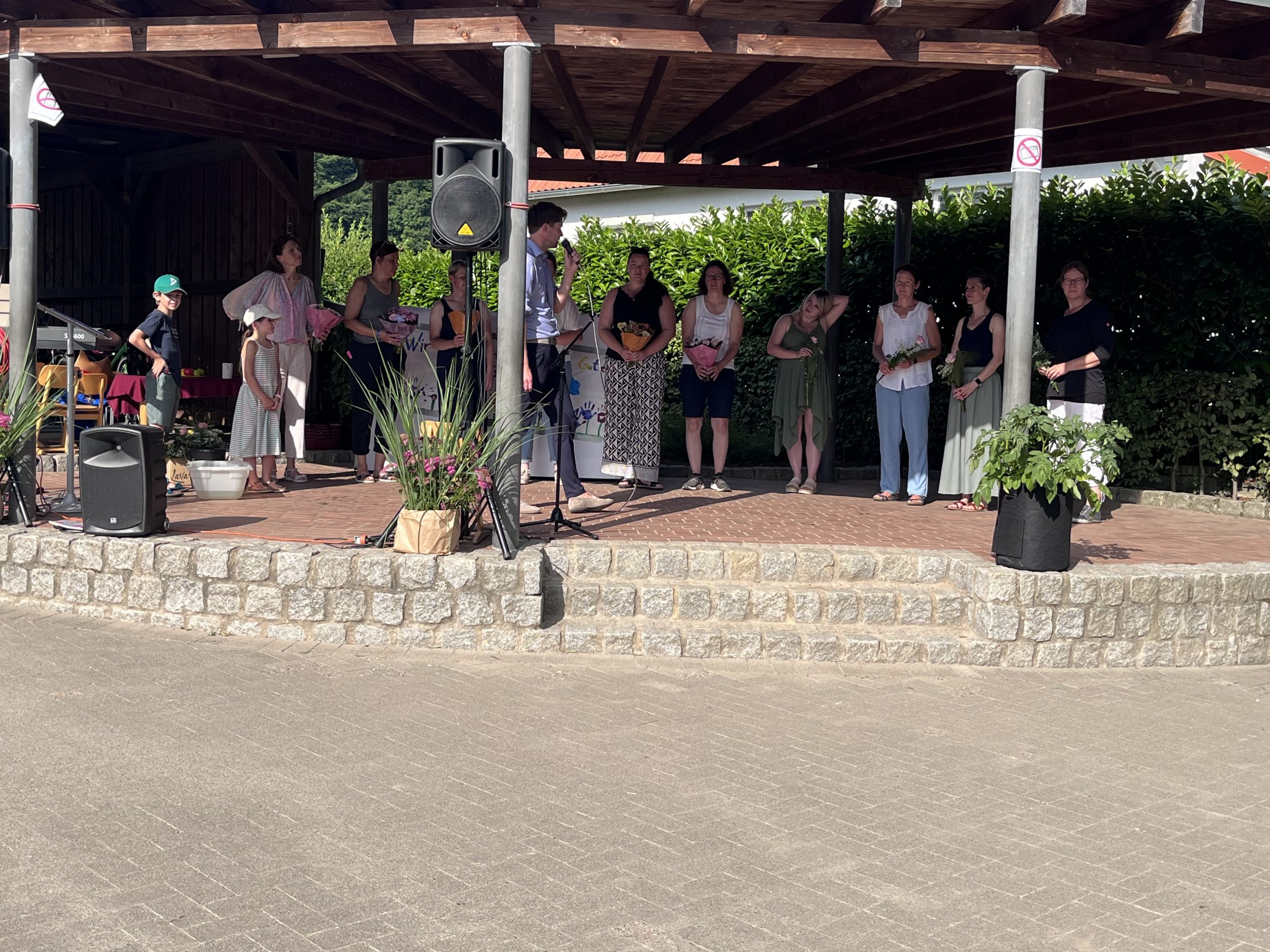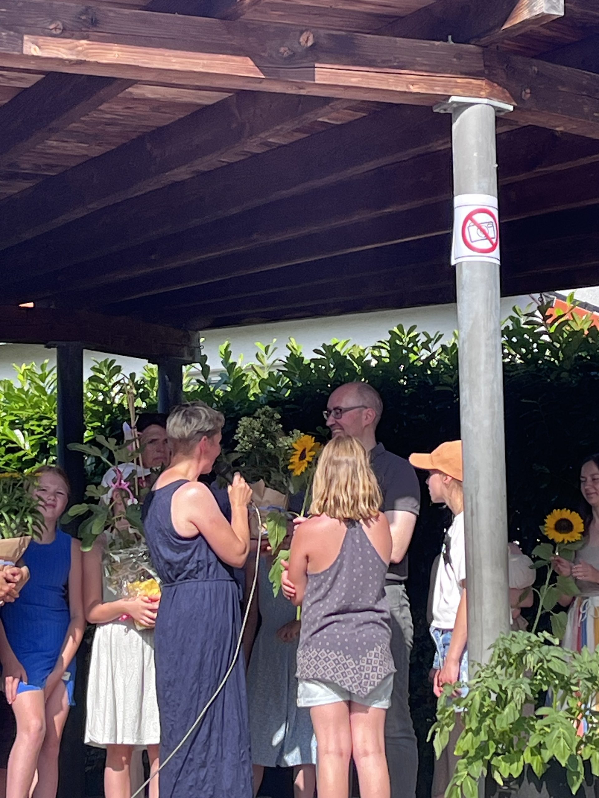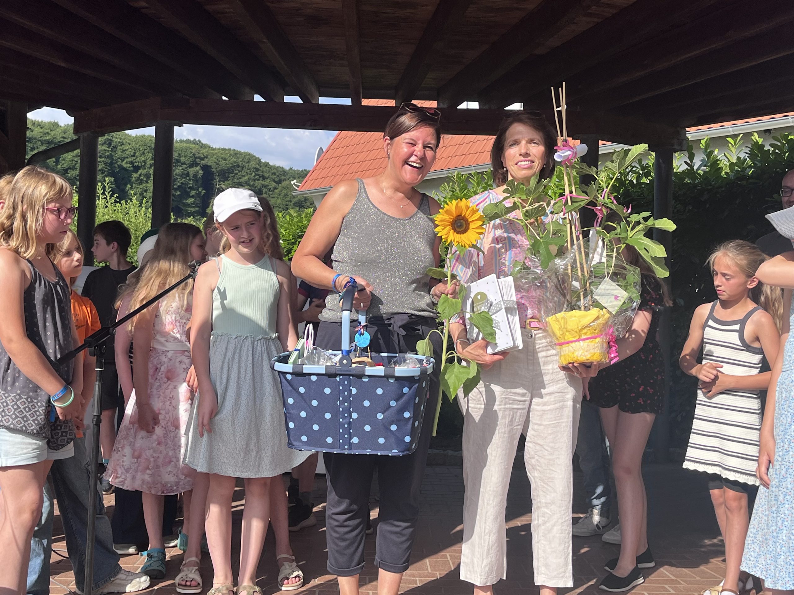 Auch von Seiten der Elternschaft hatte man sich natürlich Gedanken gemacht, womit man der Schule und dem Kollegium eine Freude machen könne. Letztlich habe man sich für eine neue Schulfahne entschieden, da die alte Fahne durch den starken Wind in den letzten Monaten nicht mehr einsetzbar gewesen sei. Außerdem gab es ein großformatiges Abschiedsbild der beiden Schulklassen für das Schulgebäude, besonders schöne Blumenpräsente, Fotos und einen Abschiedskorb für die beiden Klassenlehrerinnen, jeweils eine Hortensie für die beiden Schulleiter sowie leuchtende Sonnenblumen für das gesamte Kollegium. Hierfür bedankten sich alle Lehrkräfte sehr herzlich bei den Klassen 4a und 4b. Alle sagten übereinstimmend, dass sie die Kinder sehr vermissen werden.