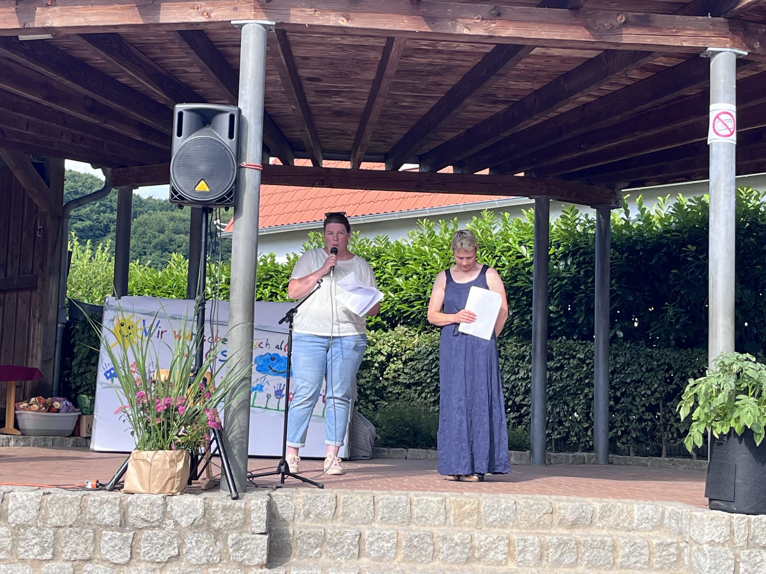 Anschließend folgten die Dankesworte der scheidenden Elternvertreterinnen Claudia Höckmann und Astrid Meyer. Auch sie betonten die Besonderheit eines so großen Jahrgangs und wiesen darauf hin, dass die letzte Zweizügigkeit eines Wehrendorfer Jahrgangs vermutlich etwa um 1984 herum gewesen sein dürfte. Dann folgten viele warme Worte für die gute Atmosphäre an der Schule und das Engagement der Lehrerschaft. Dies sei während der gesamten Schulzeit der Fall gewesen, die für ihre Kinder im August 2021 unter der damaligen Schulleiterin Carola Aubke begonnen hatte, ab September 2021 unter dem Kommissarischen Schulleiter Daniel Adler fortgeführt worden war und ab Februar 2025 unter dem neuen Schulleiter Stefan Hammerlage ihren Abschluss fand. Ein großer Höhepunkt dieser Zeit sei natürlich das Dorfjubiläum „950 Jahre Wehrendorf“ gewesen, an der die Schule sich mit den Kindern umfangreich und vielfältig beteiligt habe. Dies sei sehr schön gewesen.