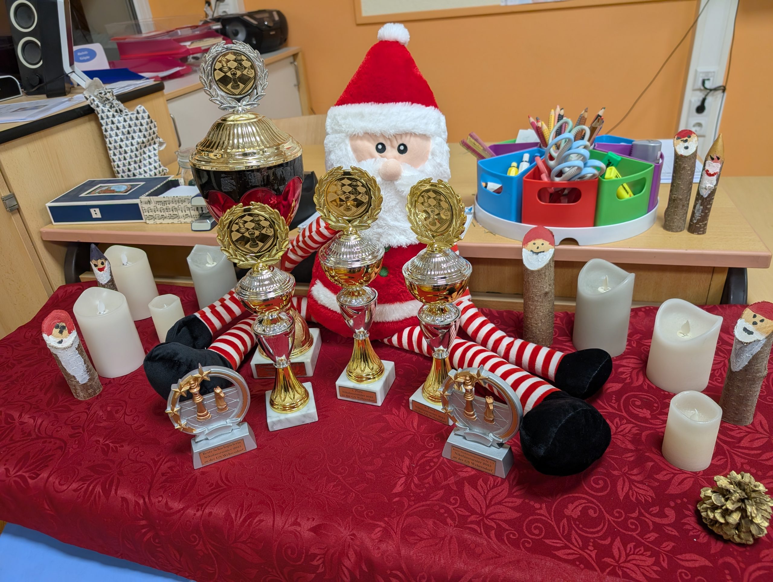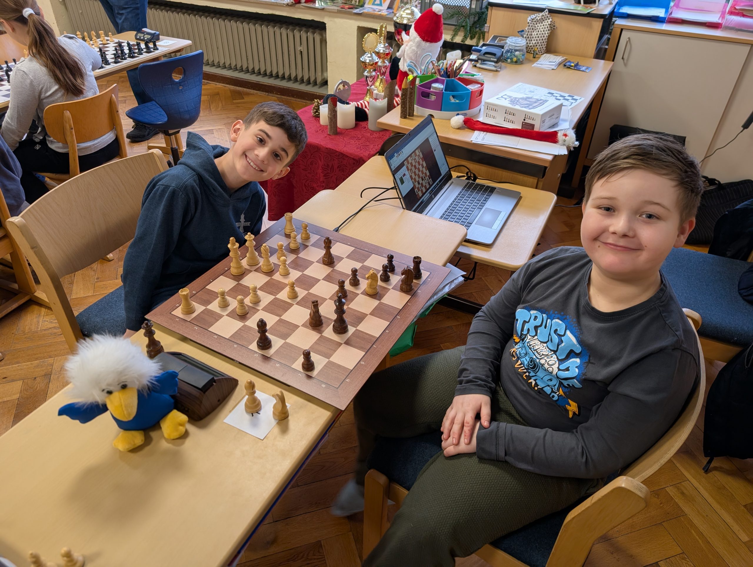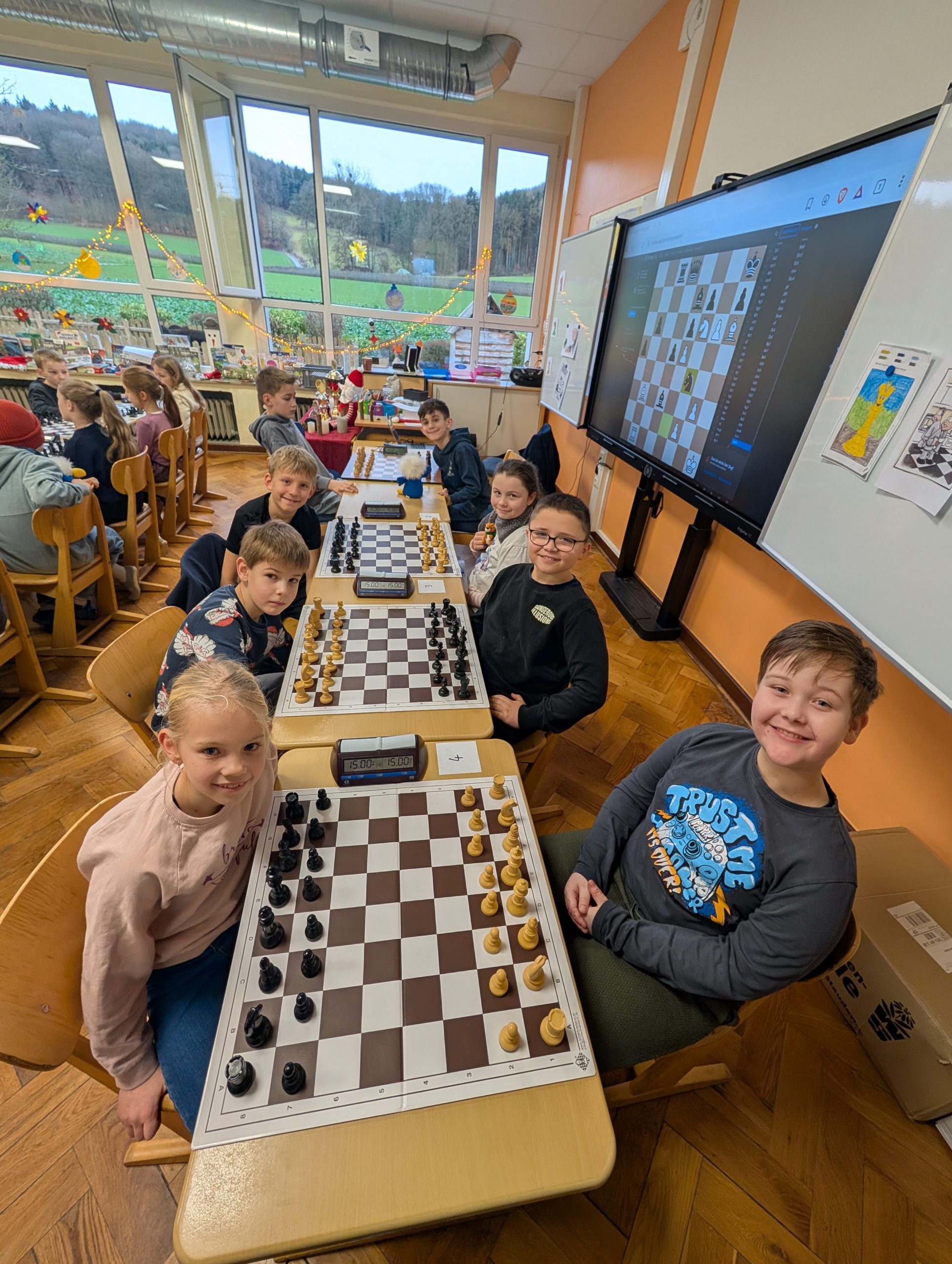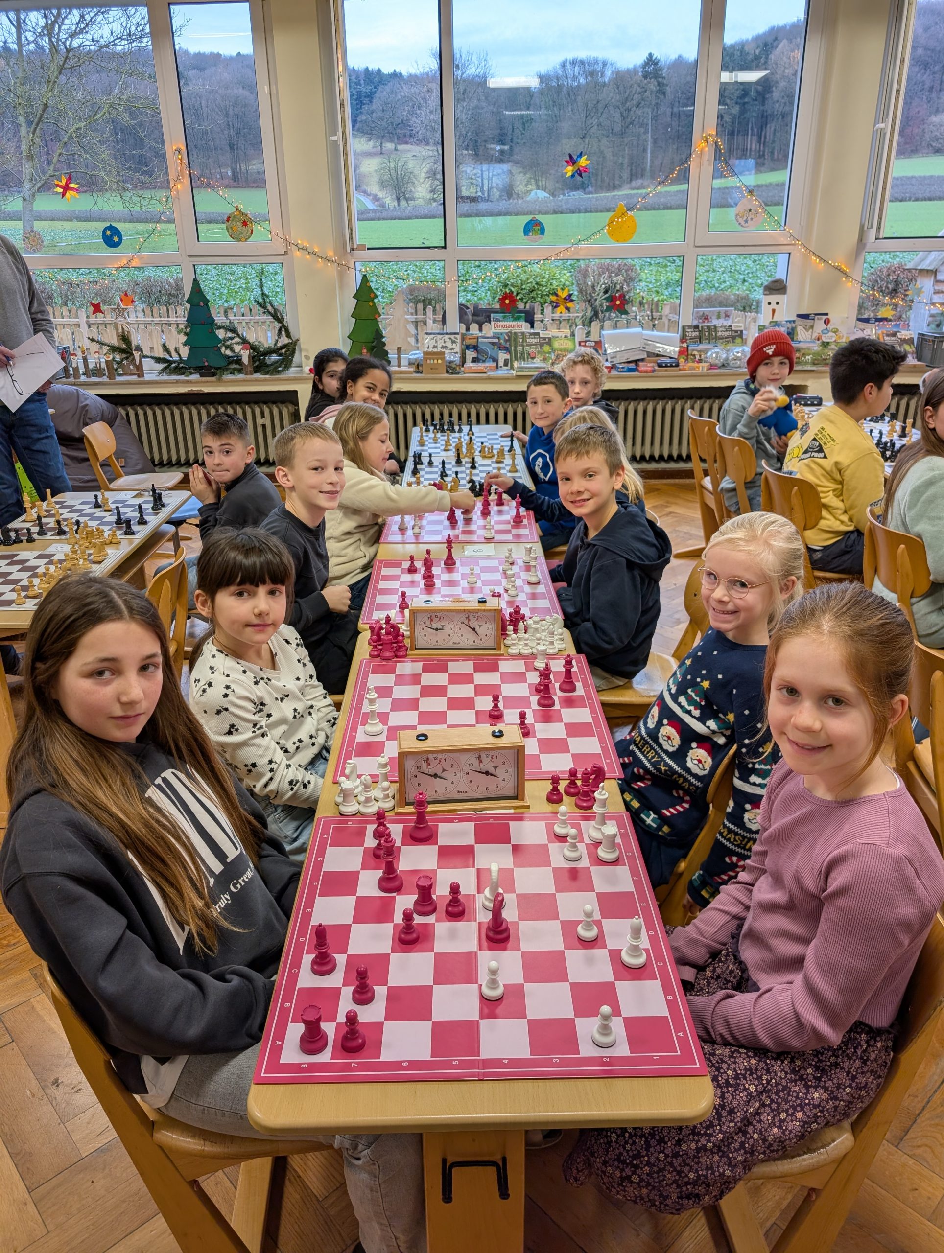 Doch nun zum Jahr 2025. Für das Turnier am 09.12.2025 hatten sich insgesamt 37 Kinder angemeldet und fieberten über mehrere Wochen dem Ereignis entgegen. Großer Favorit war der letztjährige Schulsieger Damian Ksionsko aus Klasse 3, der auch in der GOG-Schach-AG im Duell mit deutlich älteren Schülern vom Gymnasium Bad Essen und Oberschule Bad Essen regelmäßig seine Gegner das Fürchten lehrt. Würde er dem Druck standhalten und heute seinen Vorjahrestitel verteidigen können?