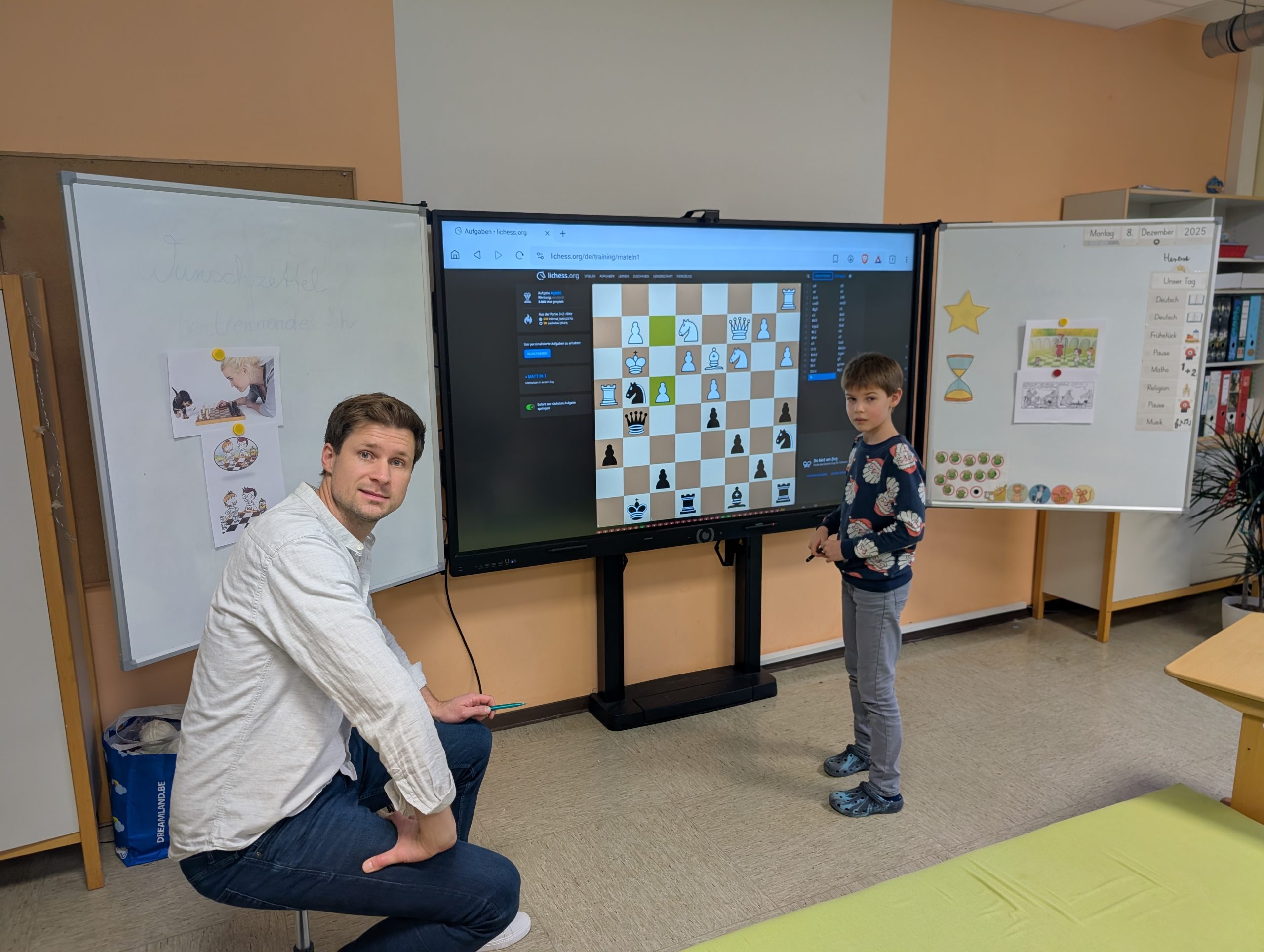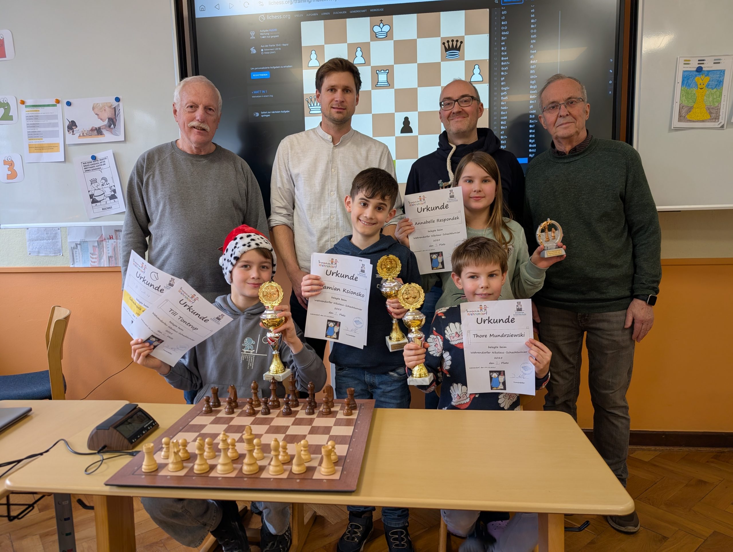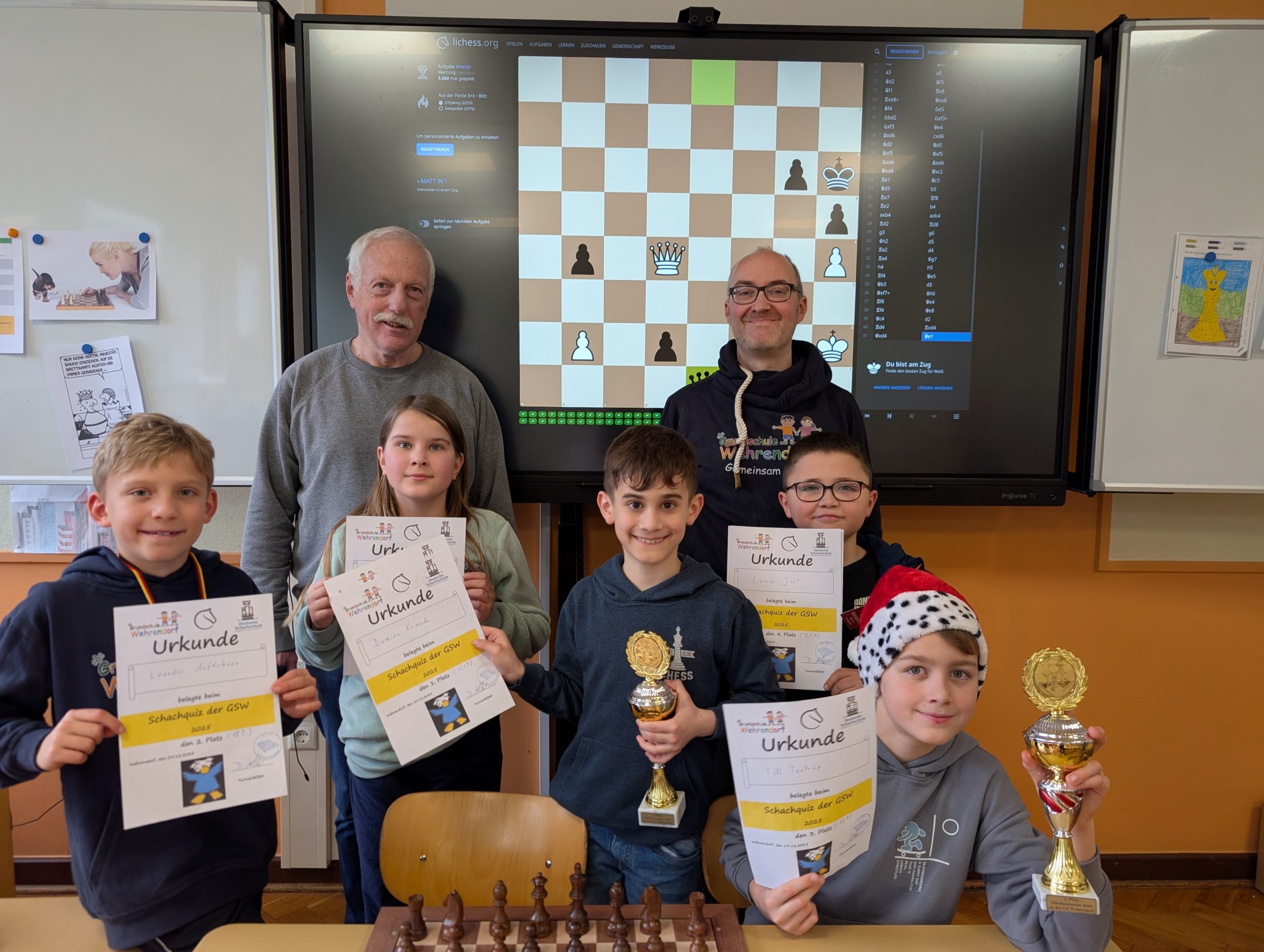 Erstmals gab es in diesem Jahr zudem einen Lichess-Wettkampf, bei dem am Smartboard Matt in 1- Schachrätsel gelöst werden mussten. Sieger in dieser Disziplin -bei der man zudem nur einen einzigen Versuch hatte- wurde Damian Ksionsko mit über 35 gelösten Rätseln in 4 Minuten. Einen Wert, den er zwei Tage später in der AG mit 43 Rätseln sogar noch sehr deutlich übertreffen konnte. Jedem können wir nur empfehlen, diese Leistung zu Hause am Computer selbst einmal zu übertreffen. Auf Rang zwei folgte Leander Aufderhaar mit 18 Rätseln und auf Rang 3 Till Tontrup. Auch von ihnen eine starke Schach-Leistung zu der wir beiden herzlich gratulieren!