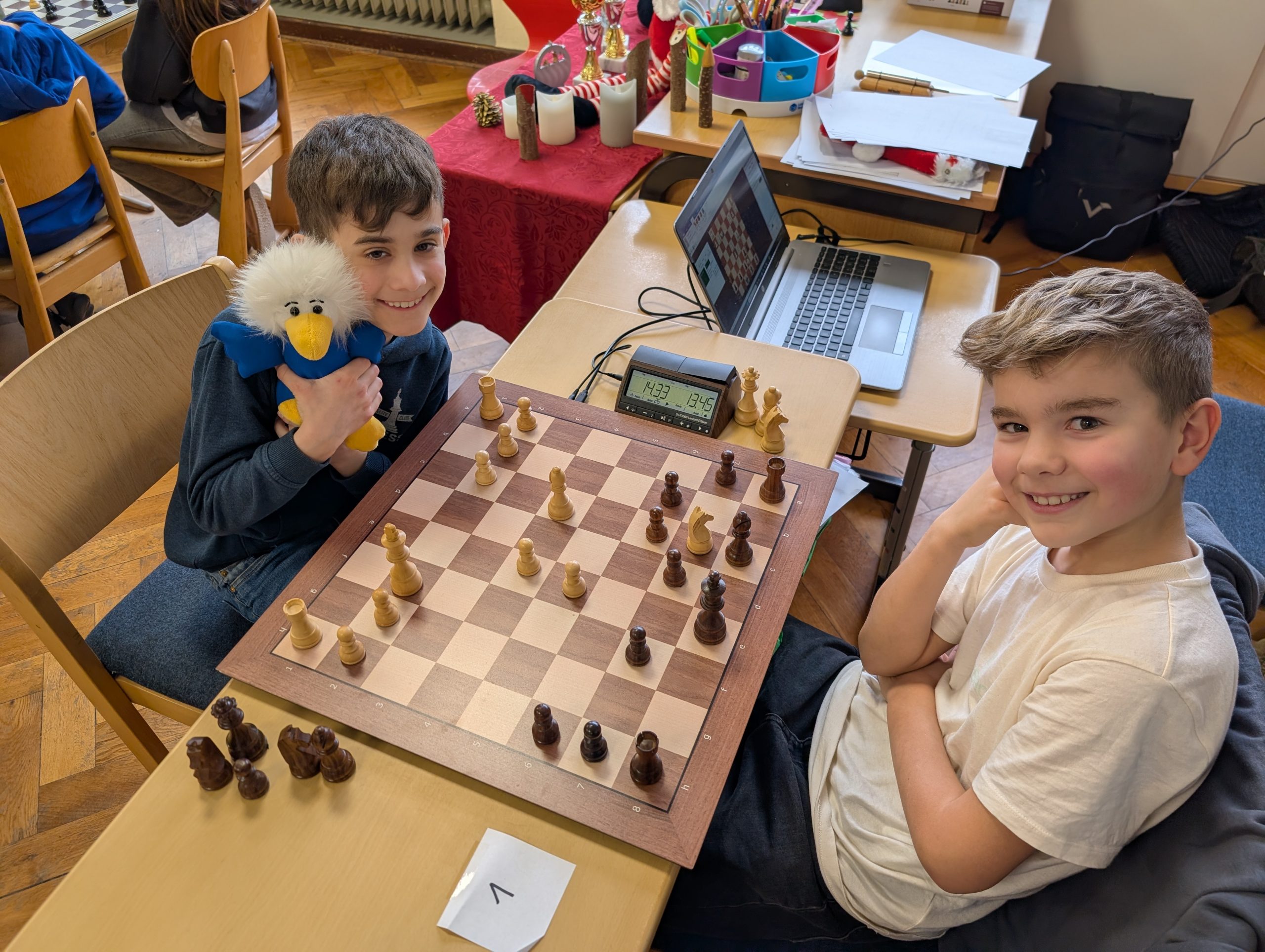 Nach den ersten drei der insgesamt sieben Runden war bereits eine erste Tendenz deutlich sichtbar. Neben Damian hatten bis dahin nur Till Tontrup und Leander Aufderhaar (beide Klasse 4) eine makellose Bilanz vorzuweisen. Dann jedoch kam es zum ersten Showdown: Till und Damian, die im Mai 2025 gemeinsam mit dem Wehrendorfer Schulteam den 11. Platz bei der Deutschen Grundschulmeisterschaft belegt hatten, trafen direkt aufeinander. Und die Partie hielt, was sie versprach. Till entschied sich in dieser Begegnung für das London System. Eine gute Wahl, denn er konnte dem Favoriten lange Zeit Paroli bieten und zwischenzeitlich sogar mit seiner Dame in den Rochadebereich eindringen. Letztlich konnte sein Gegner sich jedoch erfolgreich wehren und selbst einen Gegenangriff ausführen, sodass nach langem und zähem Kampf Damian den Sieg errang. Wie gut, dass an Brett 1 das DGT-Brett digital alle Züge der Partie aufzeichnete und eine genaue Analyse so später möglich wurde.