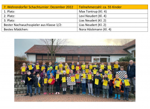 Im Premierenjahr 2015 war es Melissa Lünebrink, die vor Karl-Lukas Duffe und Jonas Siefker mit insgesamt 6 Siegen und 1 Niederlage das erste schulinterne Schachturnier -an dem 31 Kinder teilnahmen- für sich gewinnen konnte. Bester Nachwuchsspieler aus Klasse 1/2 war damals Jonas‘ jüngerer Bruder Torben. Seitdem gab es viele wechselnde Gewinner: Achmed Uzun, Samuel Moor, Moritz Rehmet (2x), Leandro Nierhaus, Max Tontrup, Lotte Riefenstein und Damian Ksionsko. Auch das Turnier wechselte den Zeitpunkt (mal im Winter, mal im Sommer) und musste wegen der Covid-Pandemie einmal sogar ganz ausfallen. Alle bisherigen Siegerinnen und Sieger finden Sie hier in unserer Fotogalerie. Zeitungsberichte zu vergangenen Nikolausturnieren finden Sie teilweise noch in unserem Pressebereich der Homepage.